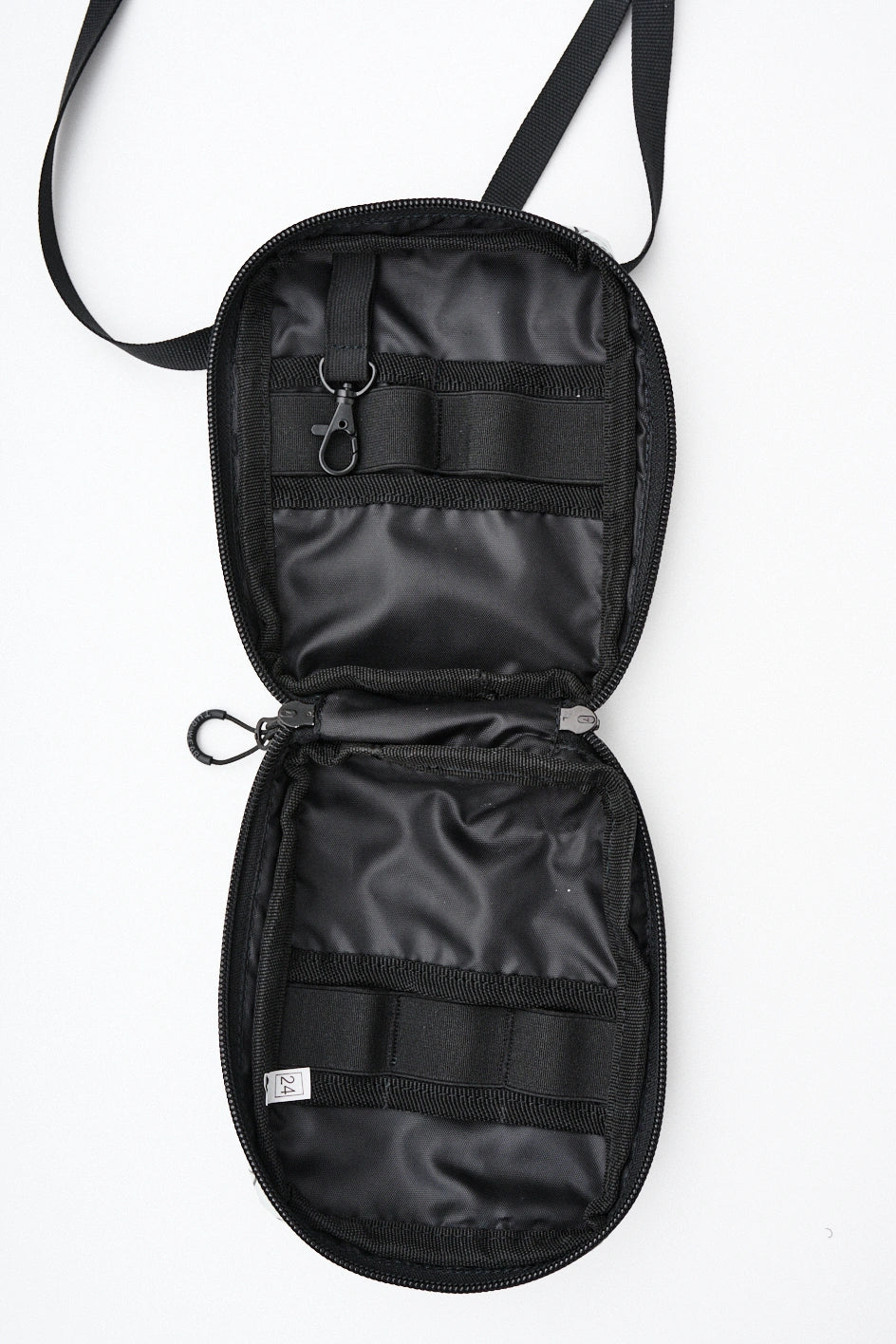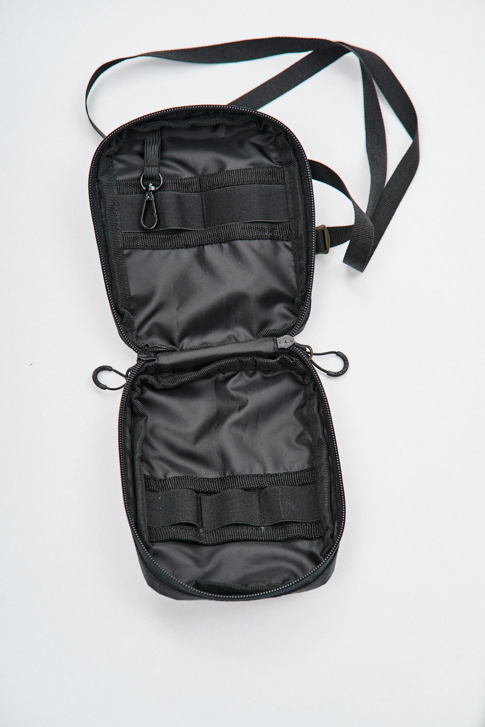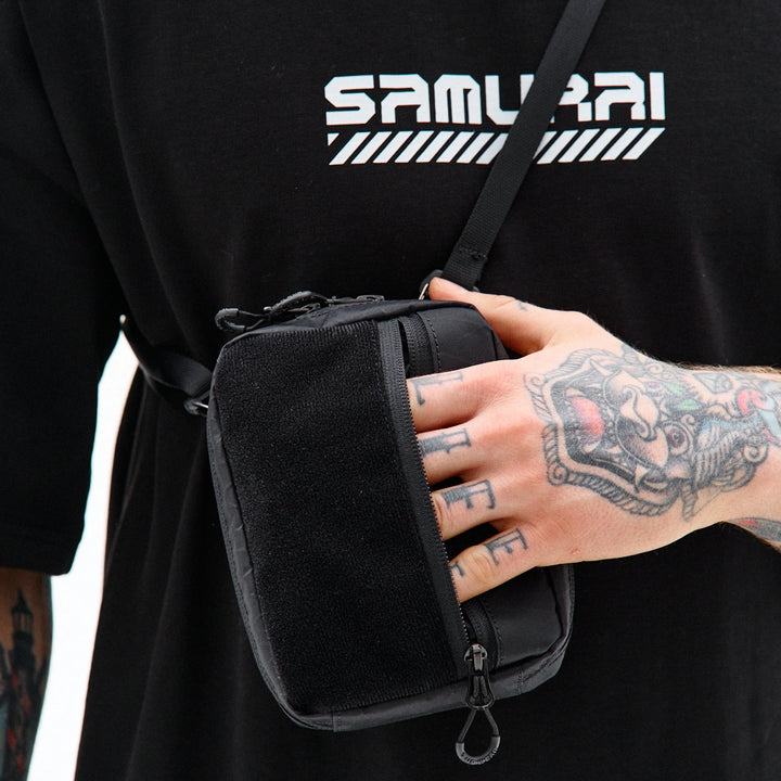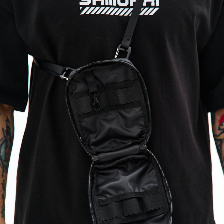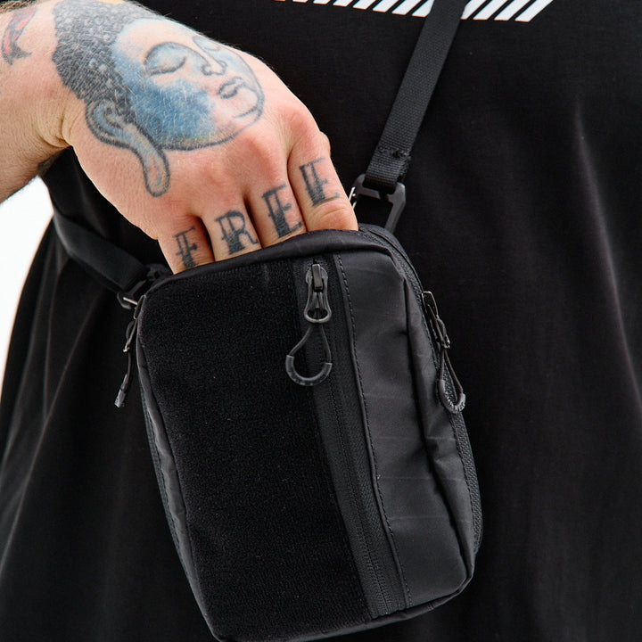 Kompakte, funktionale Tasche zur Organisation von Alltagsgegenständen. Auf der Vorderseite befindet sich ein Velcro-Panel für Patches sowie eine zusätzliche Außentasche. Das Hauptfach öffnet sich auf 180° von beiden Seiten, sodass sich die Tasche vollständig wie eine taktische Erste-Hilfe-Tasche entfalten lässt. Der Innenraum ist mit mehreren Fächern und elastischen Haltern organisiert, die Gegenstände auch bei vollständiger Öffnung sicher halten. Im Inneren befindet sich außerdem ein Karabiner für Schlüssel. Auf der Rückseite befindet sich eine zusätzliche Tasche mit Fächern für kleine Gegenstände. Die Konstruktion des Hakens ermöglicht es, die Befestigungsart des Gurtes zu verändern, sodass die Tasche an Halb-D-Ringe oder an ein MOLLE-System befestigt werden kann. Das Modell ist für den täglichen Gebrauch konzipiert und lässt sich leicht mit Casual-, Techwear- und Military-Stylings kombinieren.