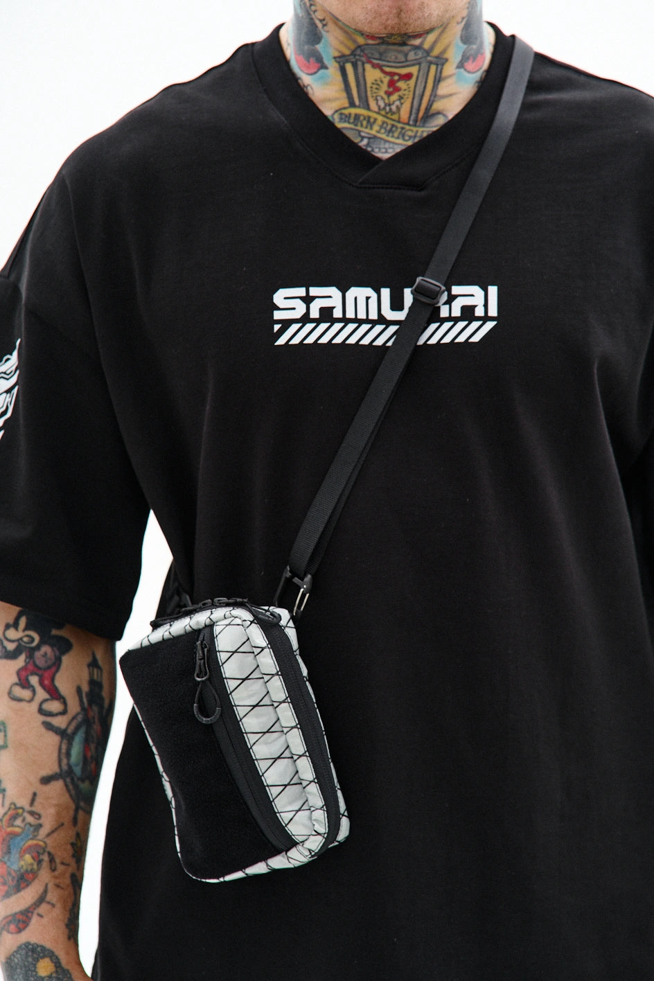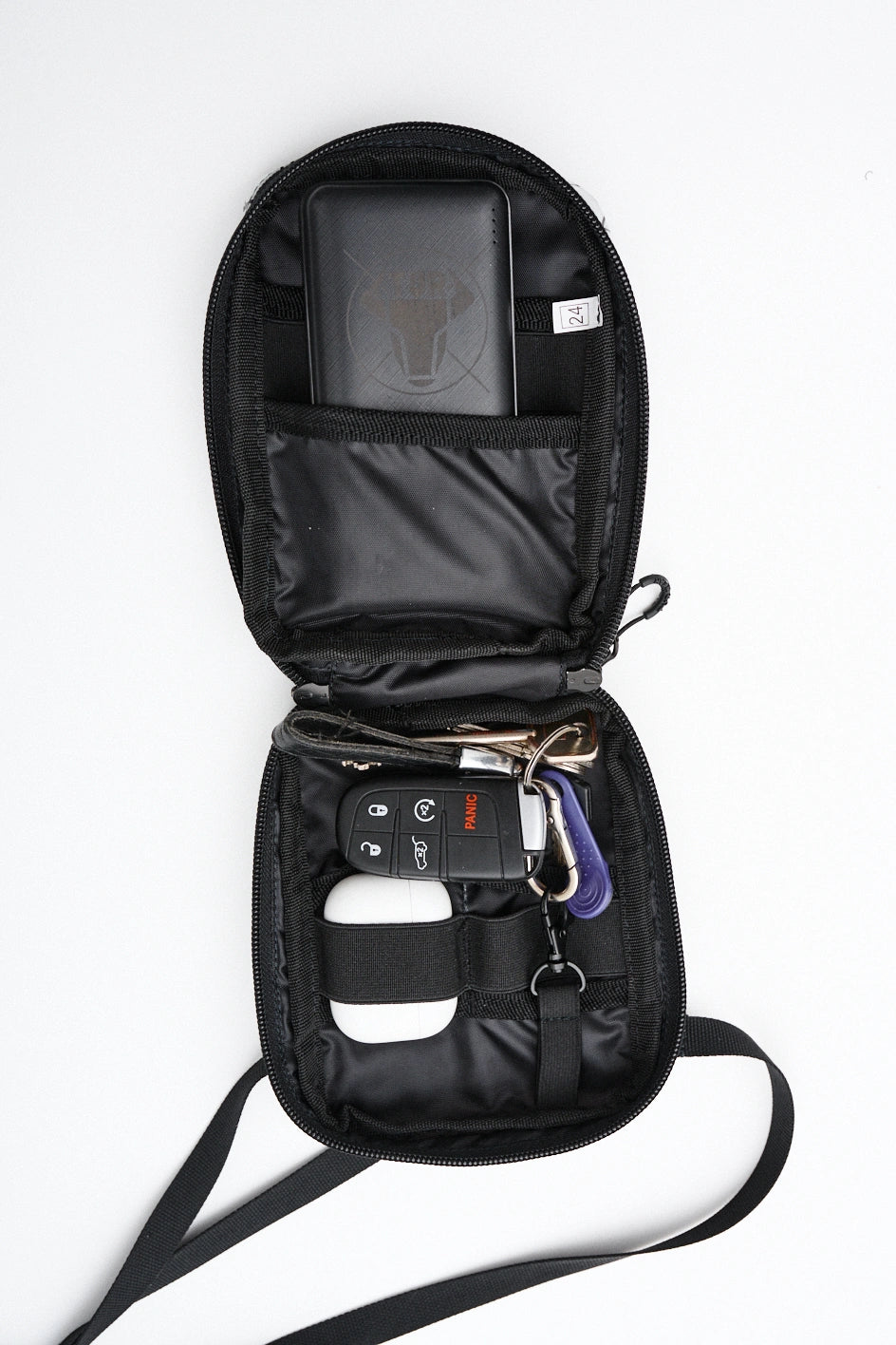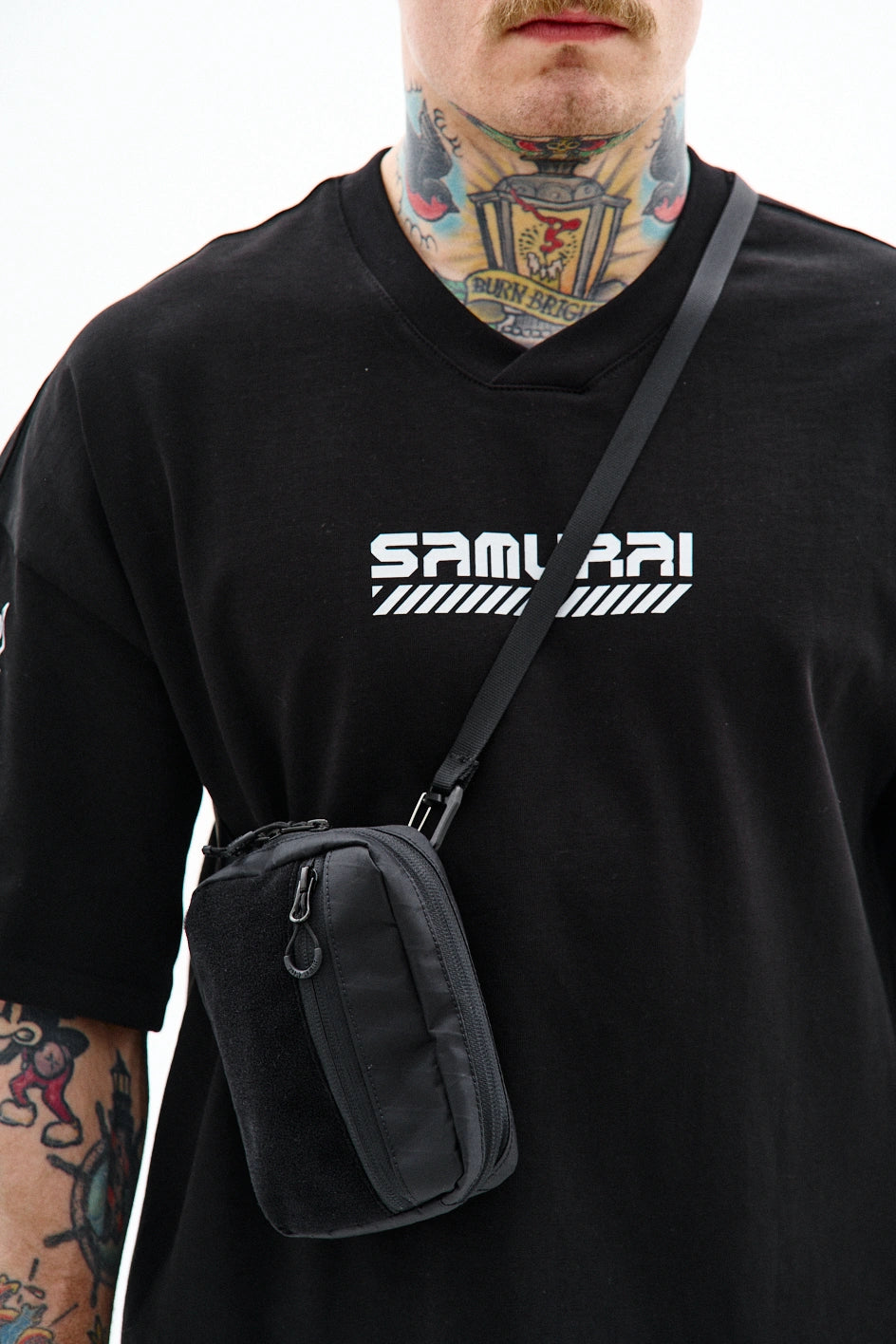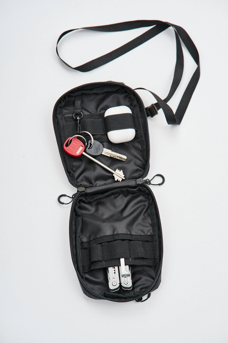 Kompakte, funktionale Tasche zur Organisation von Alltagsgegenständen. Auf der Vorderseite befindet sich ein Velcro-Panel für Patches sowie eine zusätzliche Außentasche. Das Hauptfach öffnet sich auf 180° von beiden Seiten, sodass sich die Tasche vollständig wie eine taktische Erste-Hilfe-Tasche entfalten lässt. Der Innenraum ist mit mehreren Fächern und elastischen Haltern organisiert, die Gegenstände auch bei vollständiger Öffnung sicher halten. Im Inneren befindet sich außerdem ein Karabiner für Schlüssel. Auf der Rückseite befindet sich eine zusätzliche Tasche mit Fächern für kleine Gegenstände. Die Konstruktion des Hakens ermöglicht es, die Befestigungsart des Gurtes zu verändern, sodass die Tasche an Halb-D-Ringe oder an ein MOLLE-System befestigt werden kann. Das Modell ist für den täglichen Gebrauch konzipiert und lässt sich leicht mit Casual-, Techwear- und Military-Stylings kombinieren.