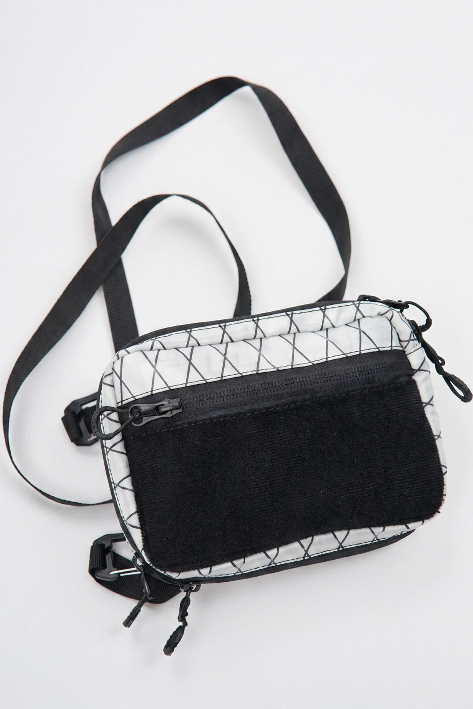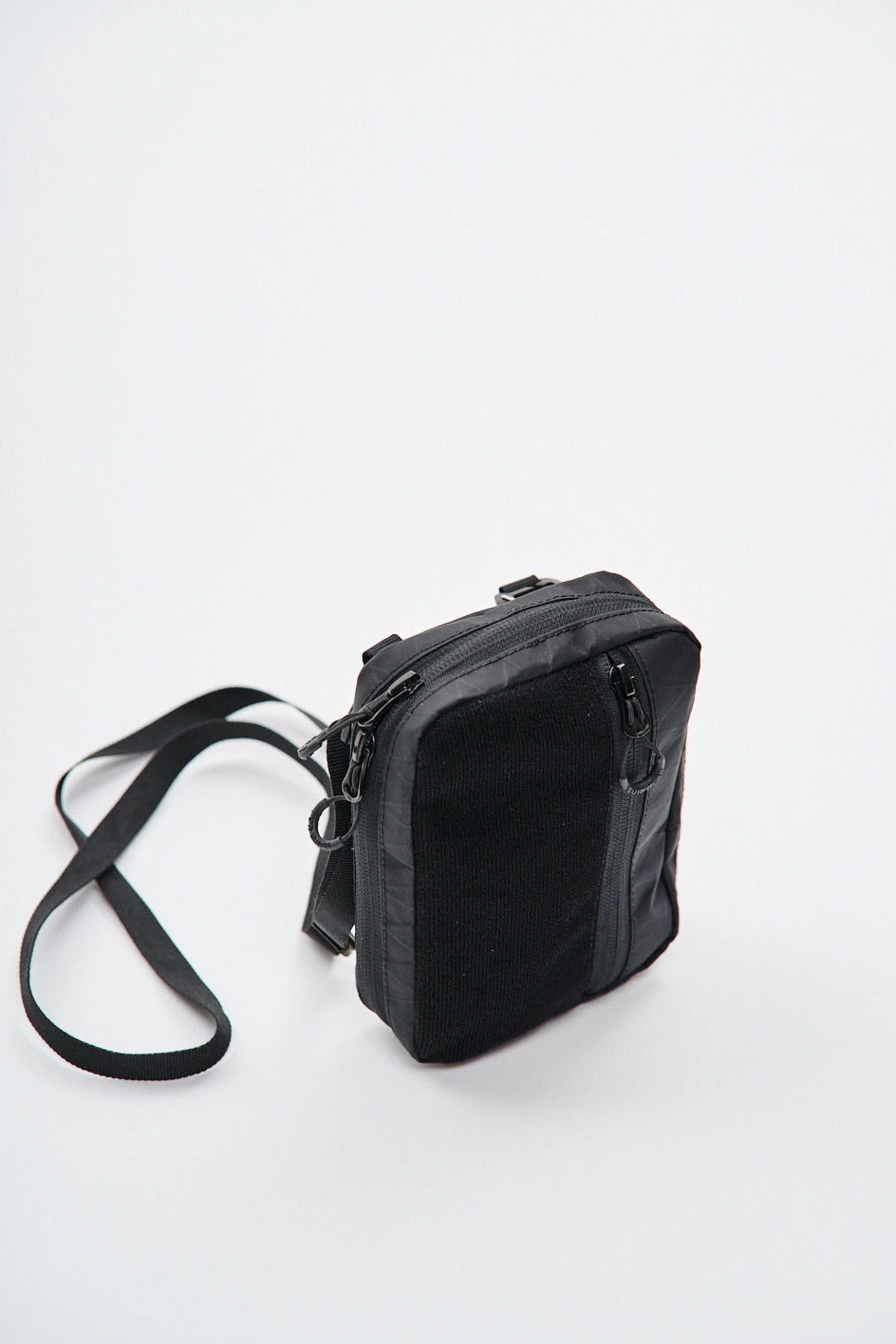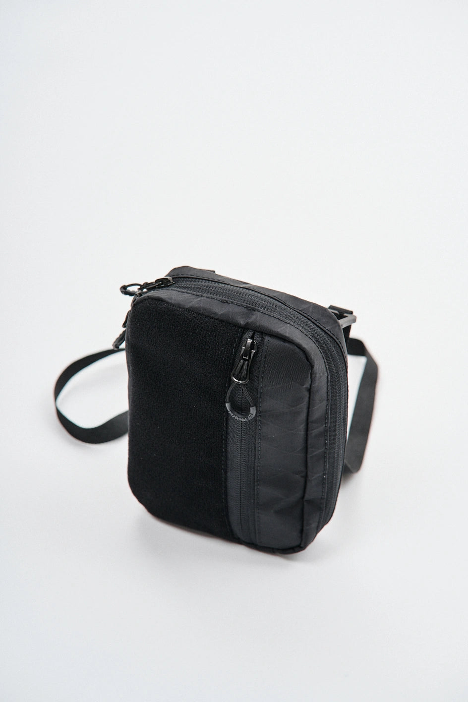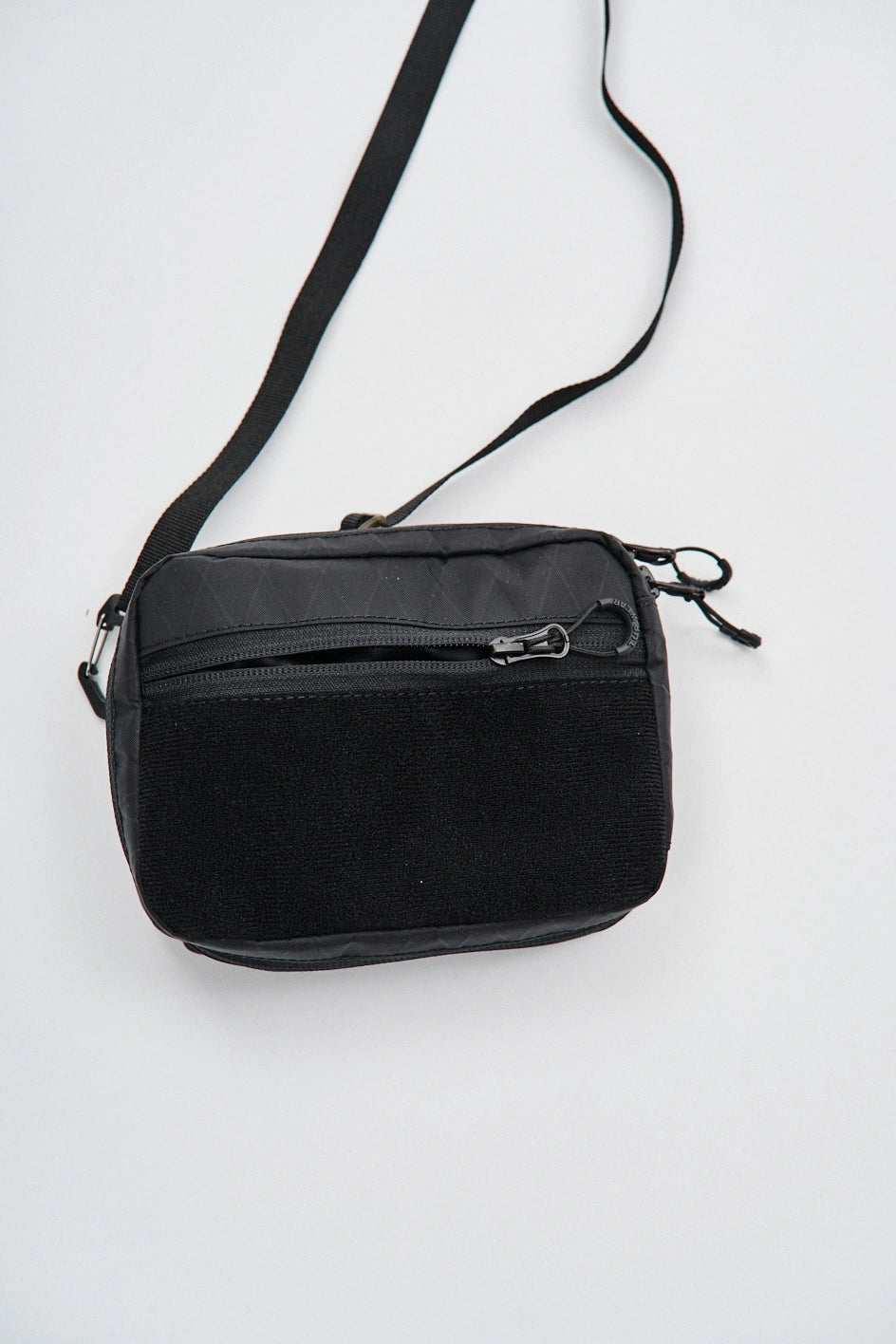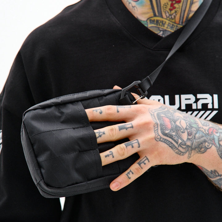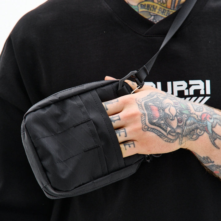 Die Tasche ist aus technischem XPac-Gewebe auf Nylonbasis gefertigt. Das Material hat eine dichte, laminierte Struktur, eine matte Oberfläche und eine charakteristische technische Textur. Der Stoff ist widerstandsfähig gegen Abrieb, Risse und mechanische Belastungen, verformt sich nicht und behält seine Form auch bei täglicher Nutzung. Dank der laminierten Konstruktion lässt das Material keine Feuchtigkeit durch und schützt den Inhalt zusätzlich vor Schmutz. Das Innenfutter besteht aus Oxford-Gewebe, das die Reibung reduziert und einen einfachen Zugriff auf Gegenstände ermöglicht. Auf der Vorderseite befindet sich ein Velcro-Gewebe zum Anbringen von Patches oder Identifikationselementen. Das Hauptfach wird mit einem umgekehrten Reißverschluss mit reversiblen Schiebern geschlossen, wodurch sich die Tasche von verschiedenen Seiten öffnen lässt. In der Konstruktion werden Beschläge von Woojin Plastic verwendet, die für ihre Widerstandsfähigkeit und Langlebigkeit bekannt sind. Die Tasche ist mit einem Gurtband von 1,5 cm Breite, einem Kompressionshaken, einem Zweischlitz-Regulator, elastischen Bändern zur Befestigung von Gegenständen sowie einem Puller in Form eines Halb-D-Rings ausgestattet. Im Inneren befindet sich ein Karabiner für Schlüssel, mit dem kleine Accessoires schnell befestigt werden können.