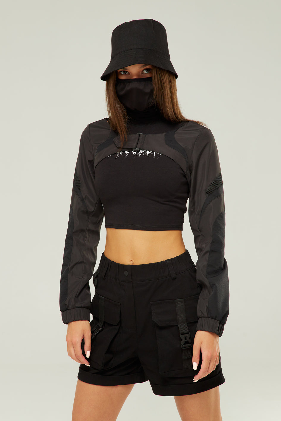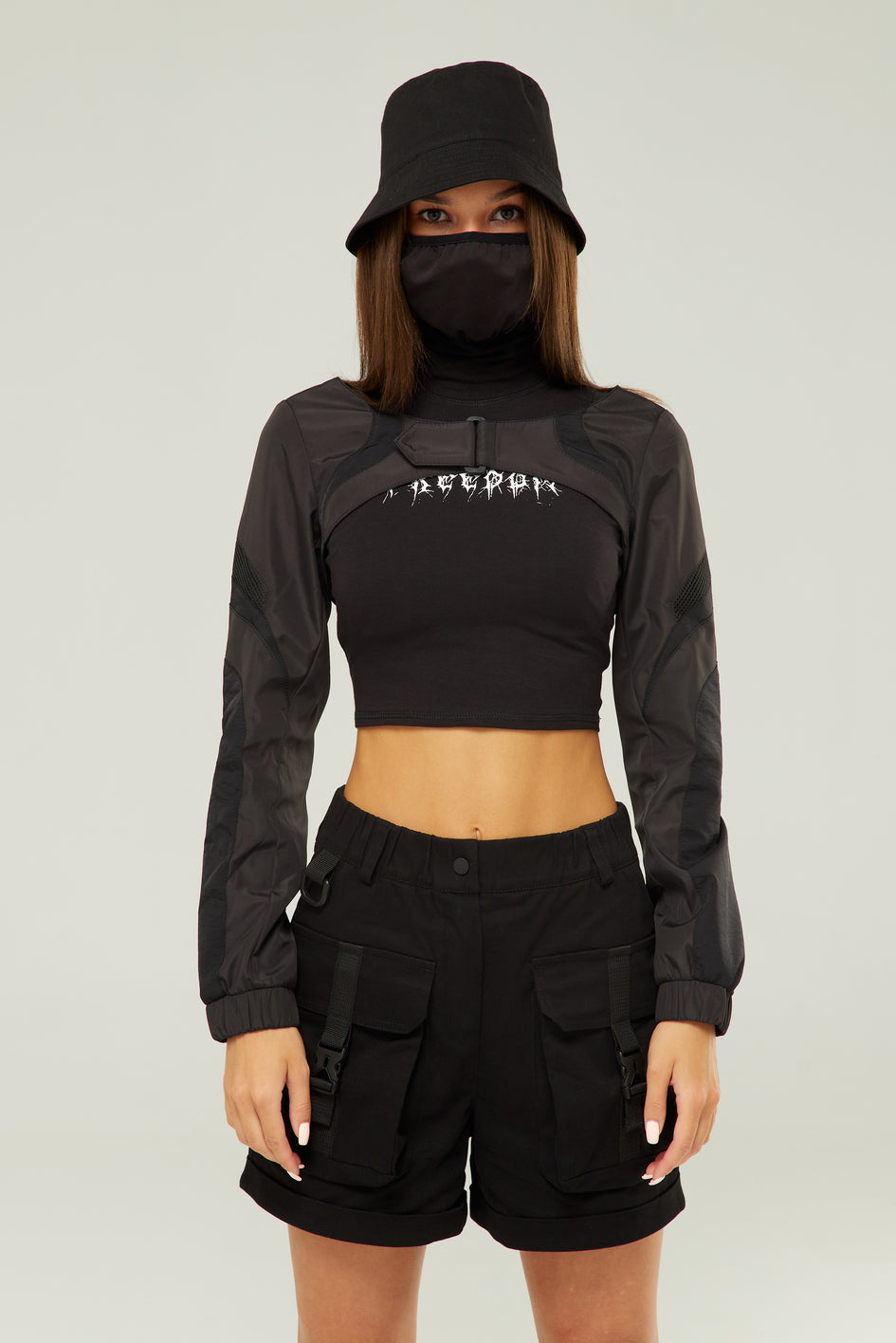Shorts mit hoher Taille und weitem Bein. Verschluss mit Knopf und Reißverschluss. Der Bund ist mit Gürtelschlaufen ausgestattet, zusätzlich befindet sich rechts eine Schlaufe mit Halbkreisring. Vorne zwei aufgesetzte Taschen mit Verschlüssen vom Typ Fastex. Hinten ebenfalls zwei aufgesetzte Taschen, wobei die rechte Tasche mit einem reflektierenden Aufdruck „TUR WEAR“ versehen ist.