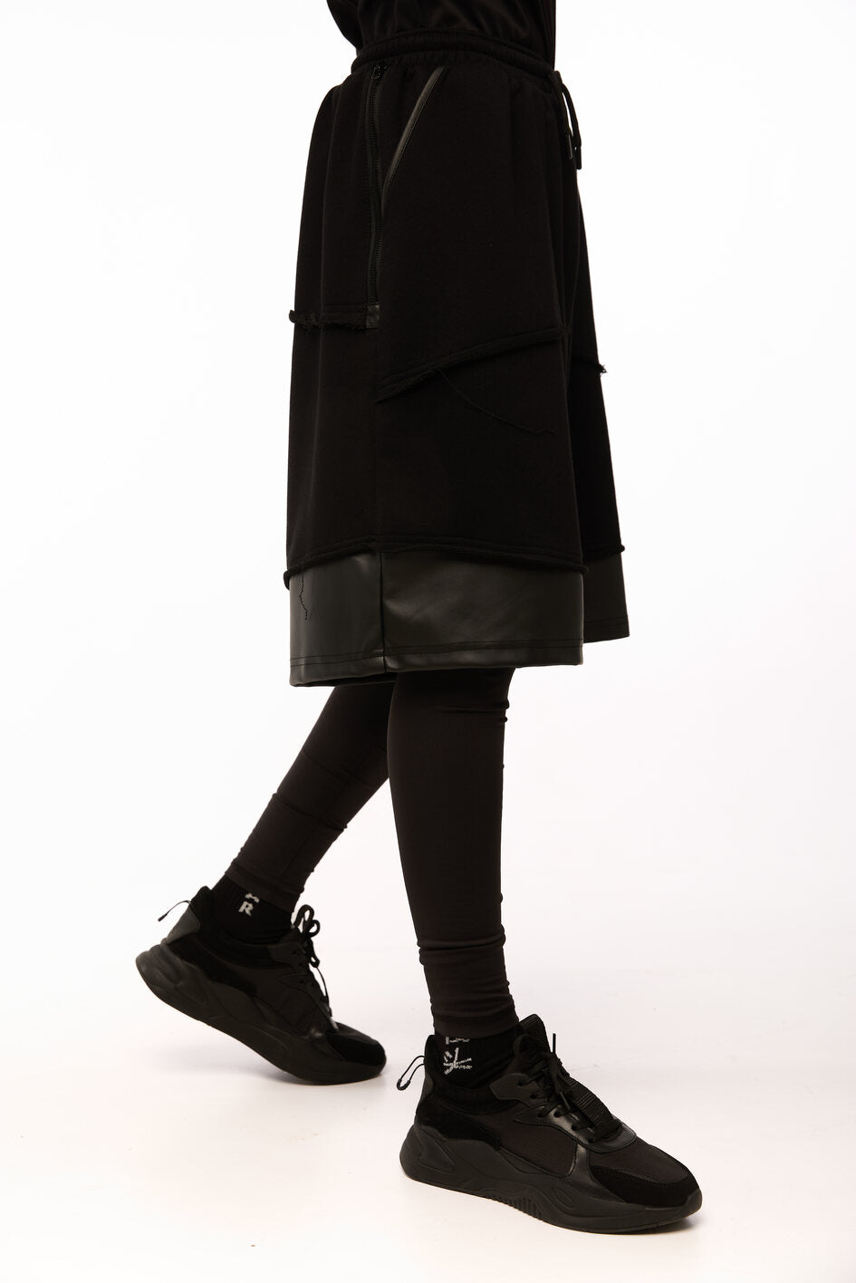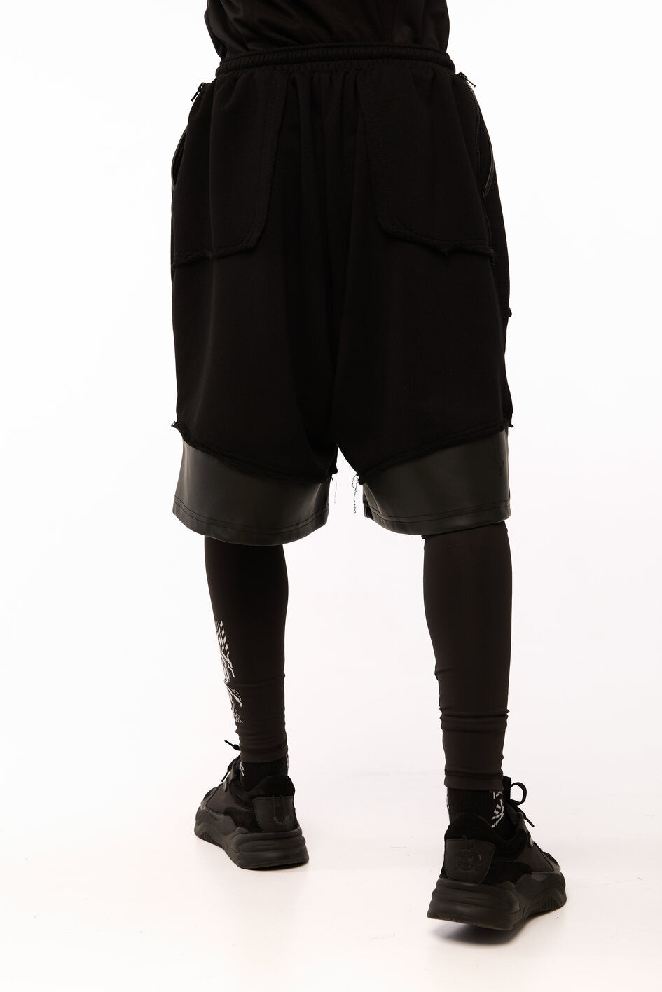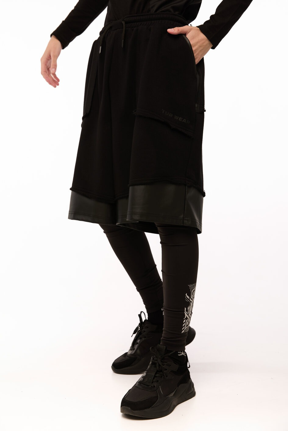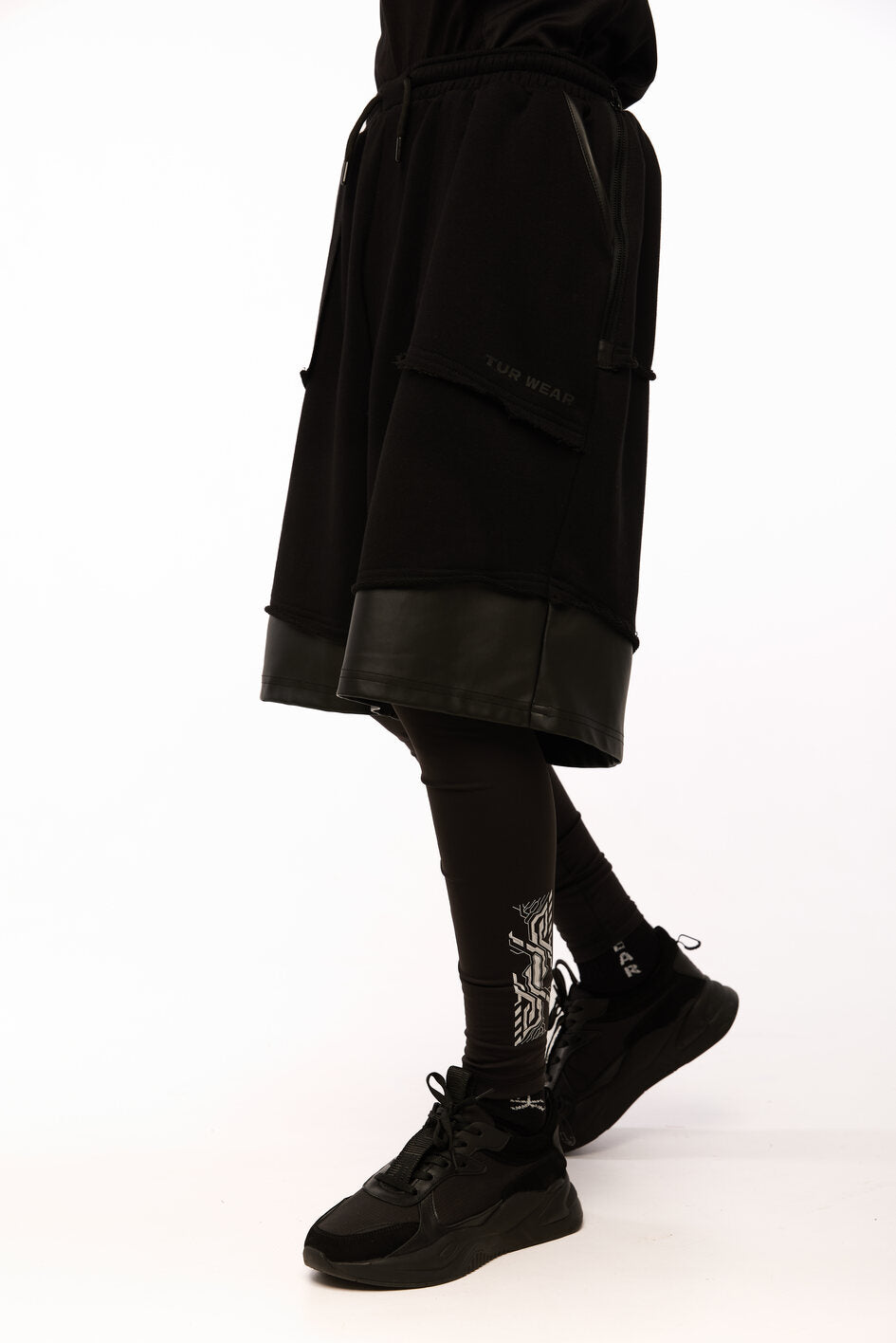 Shorts aus dichtem Strickstoff mit lockerem Schnitt, unten mit Kunstledereinsätzen verarbeitet. Vorne zwei tiefe aufgesetzte Taschen, deren Kanten mit Kunstlederpaspeln eingefasst sind. Hinten, auf der rechten Seite, eine aufgesetzte Tasche mit Reißverschluss. Die Kanten der Taschen und des unteren Teils der Shorts sind im Raw-Cut verarbeitet. Der Bund verfügt über einen elastischen Einsatz und einen Kordelzug zur Regulierung. Auf der linken Tasche befindet sich ein schwarzer Markenprint „TUR WEAR“.
