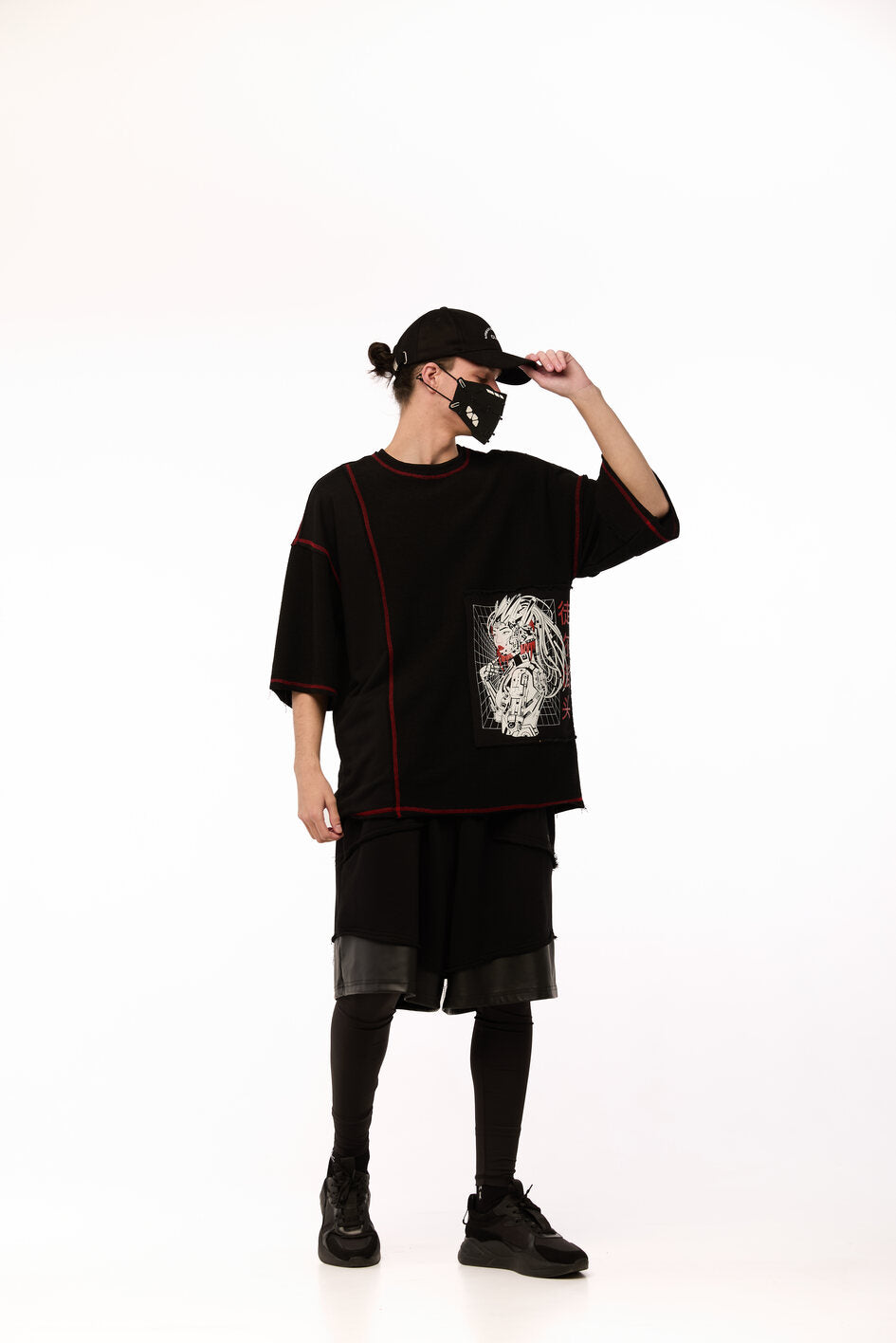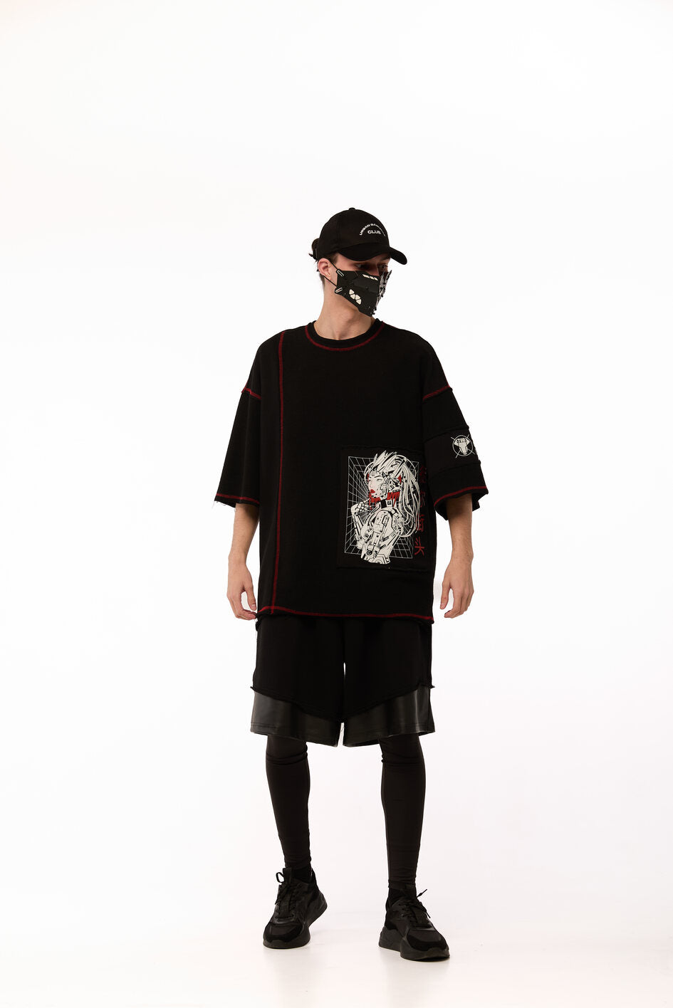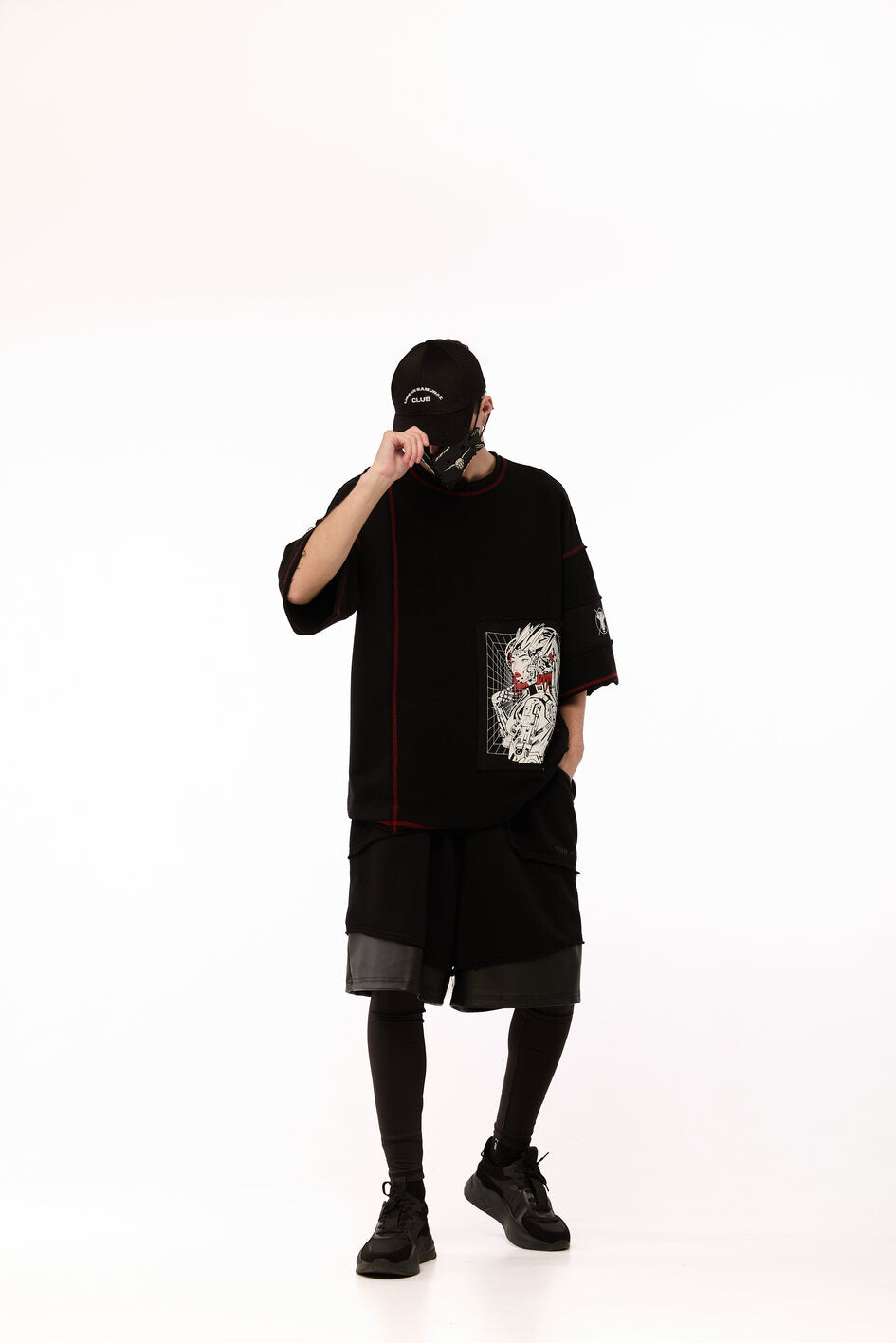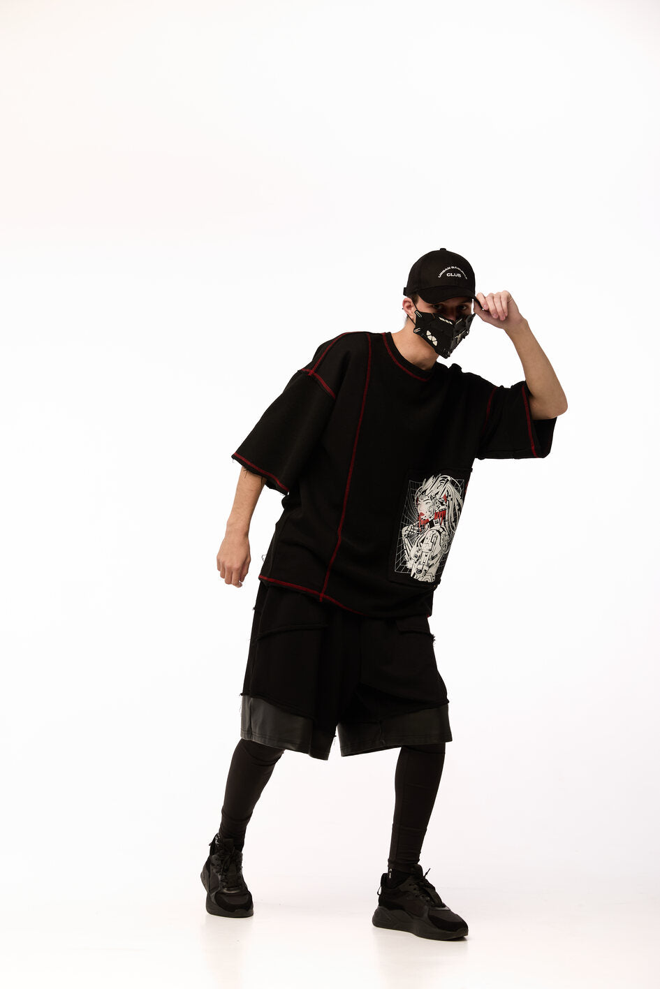 Shorts aus dichtem Strickstoff mit lockerem Schnitt, unten mit Kunstledereinsätzen verarbeitet. Vorne zwei tiefe aufgesetzte Taschen, deren Kanten mit Kunstlederpaspeln eingefasst sind. Hinten, auf der rechten Seite, eine aufgesetzte Tasche mit Reißverschluss. Die Kanten der Taschen und des unteren Teils der Shorts sind im Raw-Cut verarbeitet. Der Bund verfügt über einen elastischen Einsatz und einen Kordelzug zur Regulierung. Auf der linken Tasche befindet sich ein schwarzer Markenprint „TUR WEAR“.