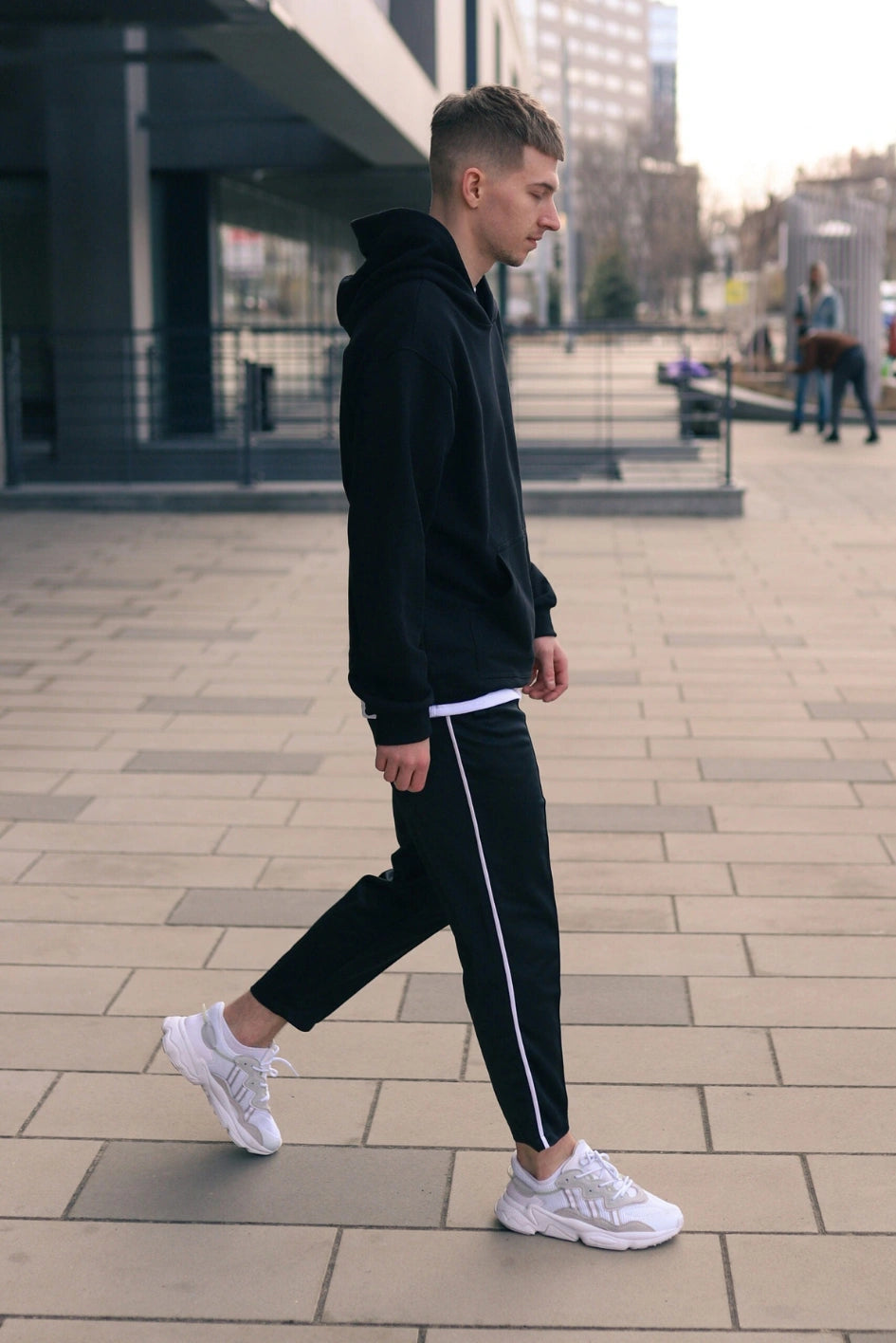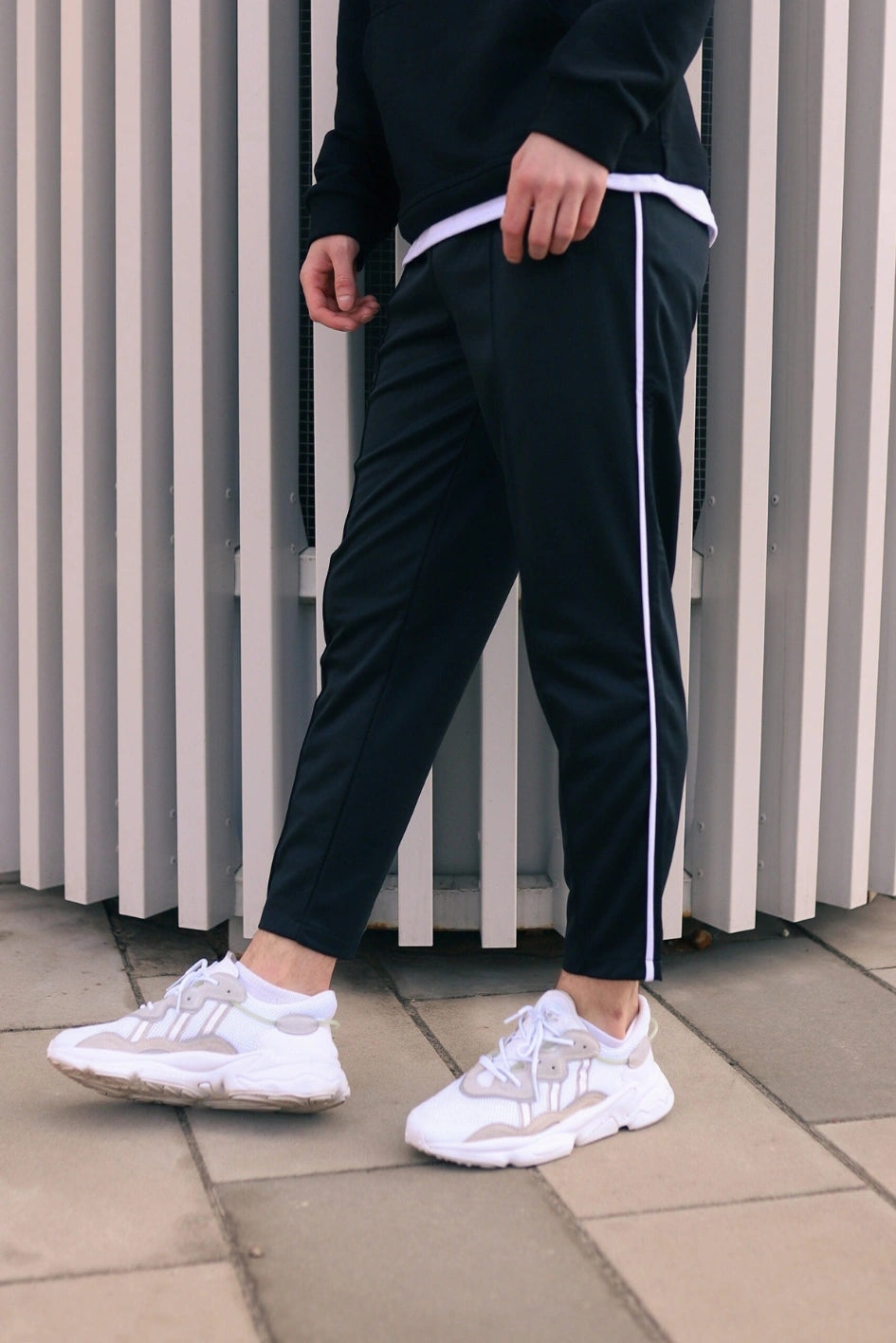 Hose mit Gummibund und Kordelzug, nach unten verengt, mit Ziernaht entlang der gesamten Vorderseite der Hosenbeine. Mit 2 Taschen ausgestattet.