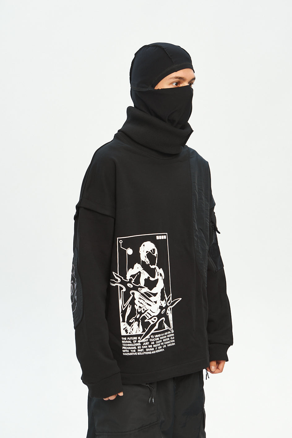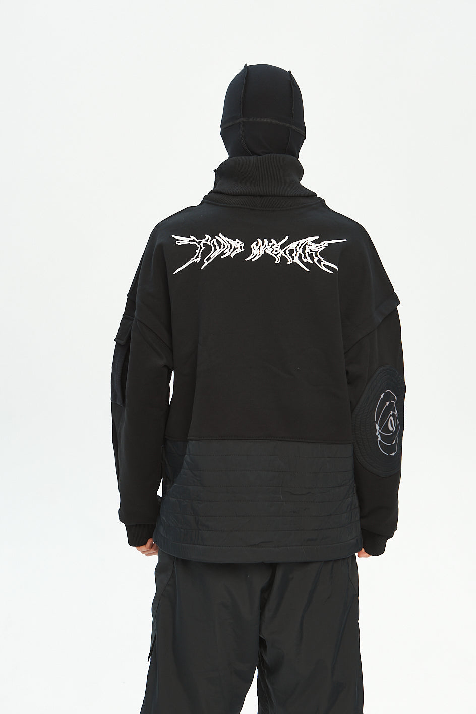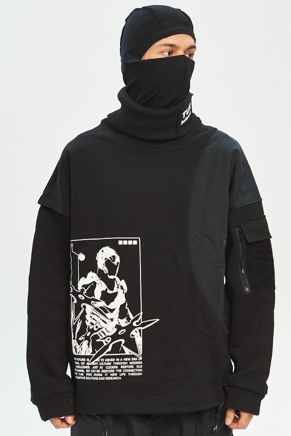 Oversize’owa bluza wykonana z grubej, trzynitkowej dzianiny z wysokim dekoltem. Dodatkowe wstawki z dzianiny dżersejowej na całej powierzchni. Model ozdobiony trzema białymi nadrukami – z przodu, z tyłu i na rękawach. Odpinana naszywka z nadrukiem na karku, naszywka z haftowanym samolotem na jednym rękawie oraz kieszeń z rzepem na drugim rękawie do mocowania dodatkowych naszywek.