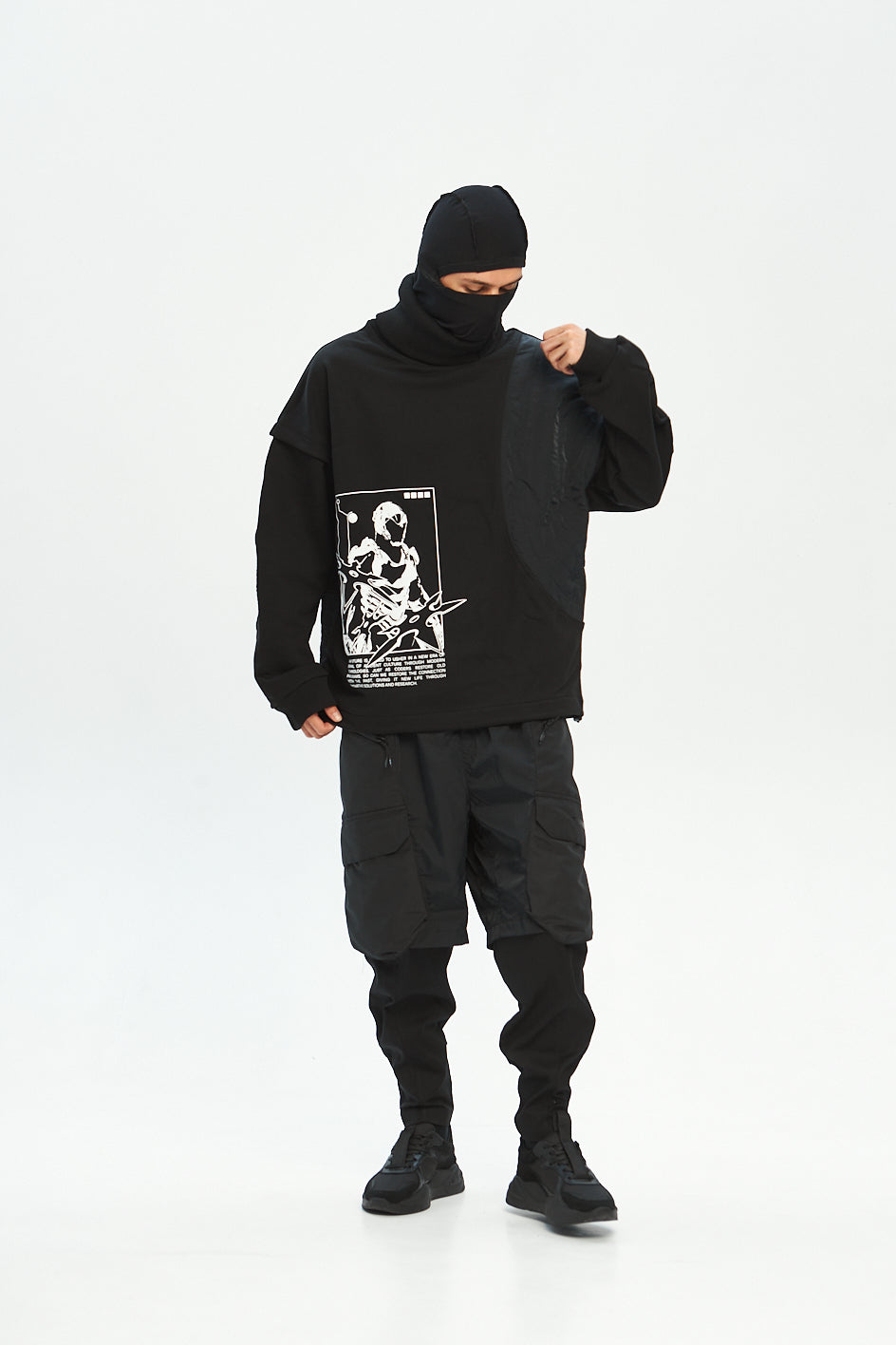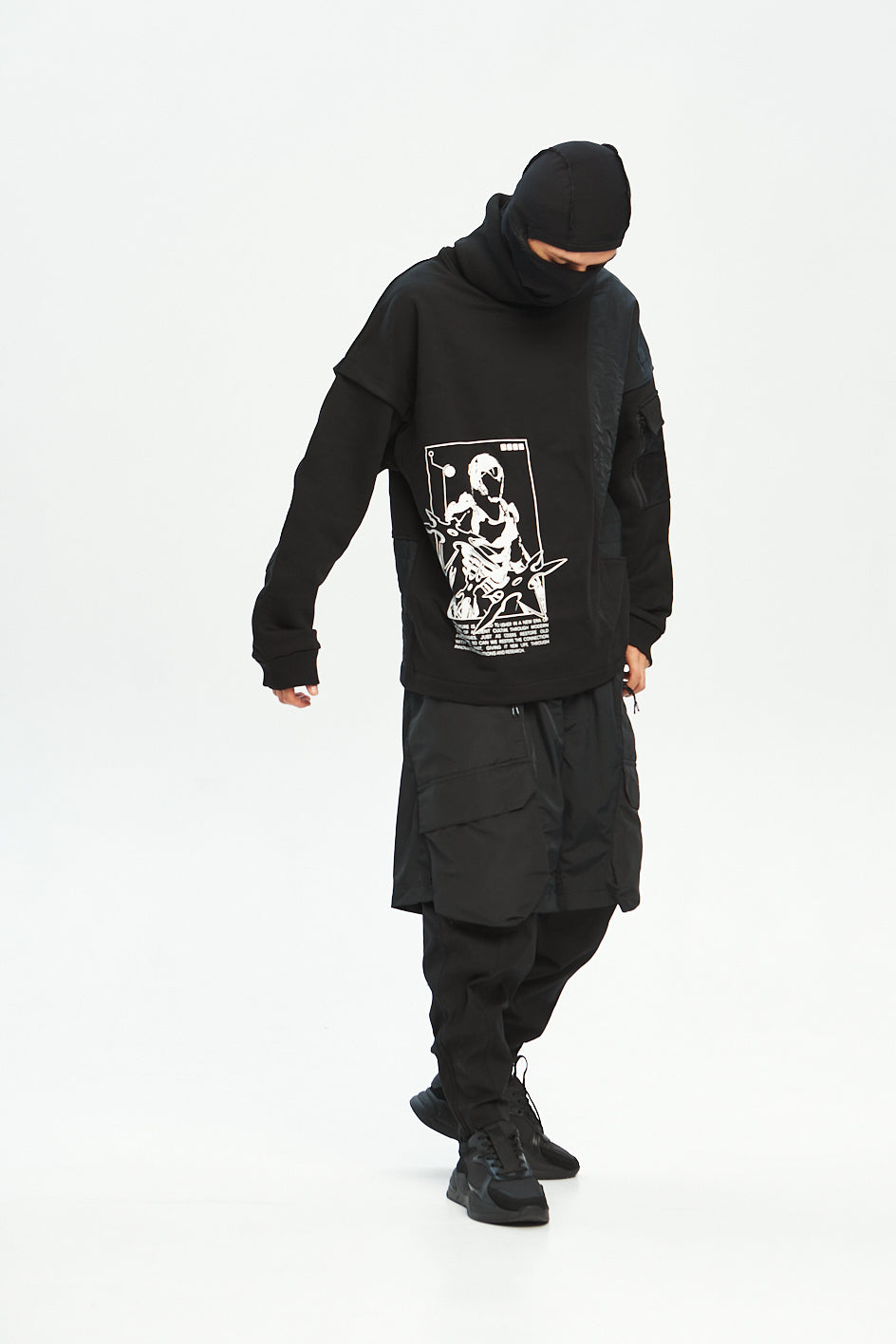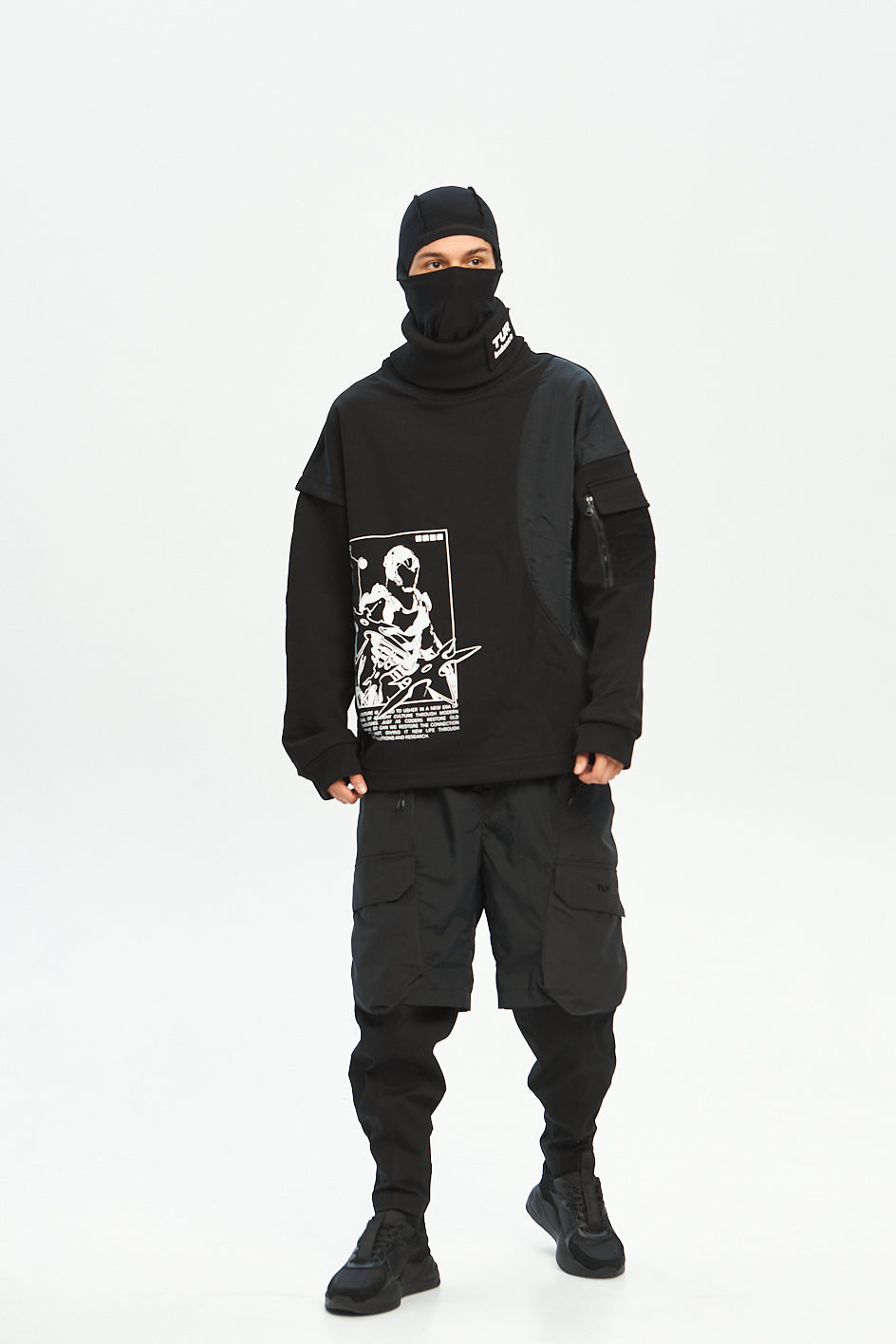 Oversize’owa bluza wykonana z grubej, trzynitkowej dzianiny z wysokim dekoltem. Dodatkowe wstawki z dzianiny dżersejowej na całej powierzchni. Model ozdobiony trzema białymi nadrukami – z przodu, z tyłu i na rękawach. Odpinana naszywka z nadrukiem na karku, naszywka z haftowanym samolotem na jednym rękawie oraz kieszeń z rzepem na drugim rękawie do mocowania dodatkowych naszywek.
