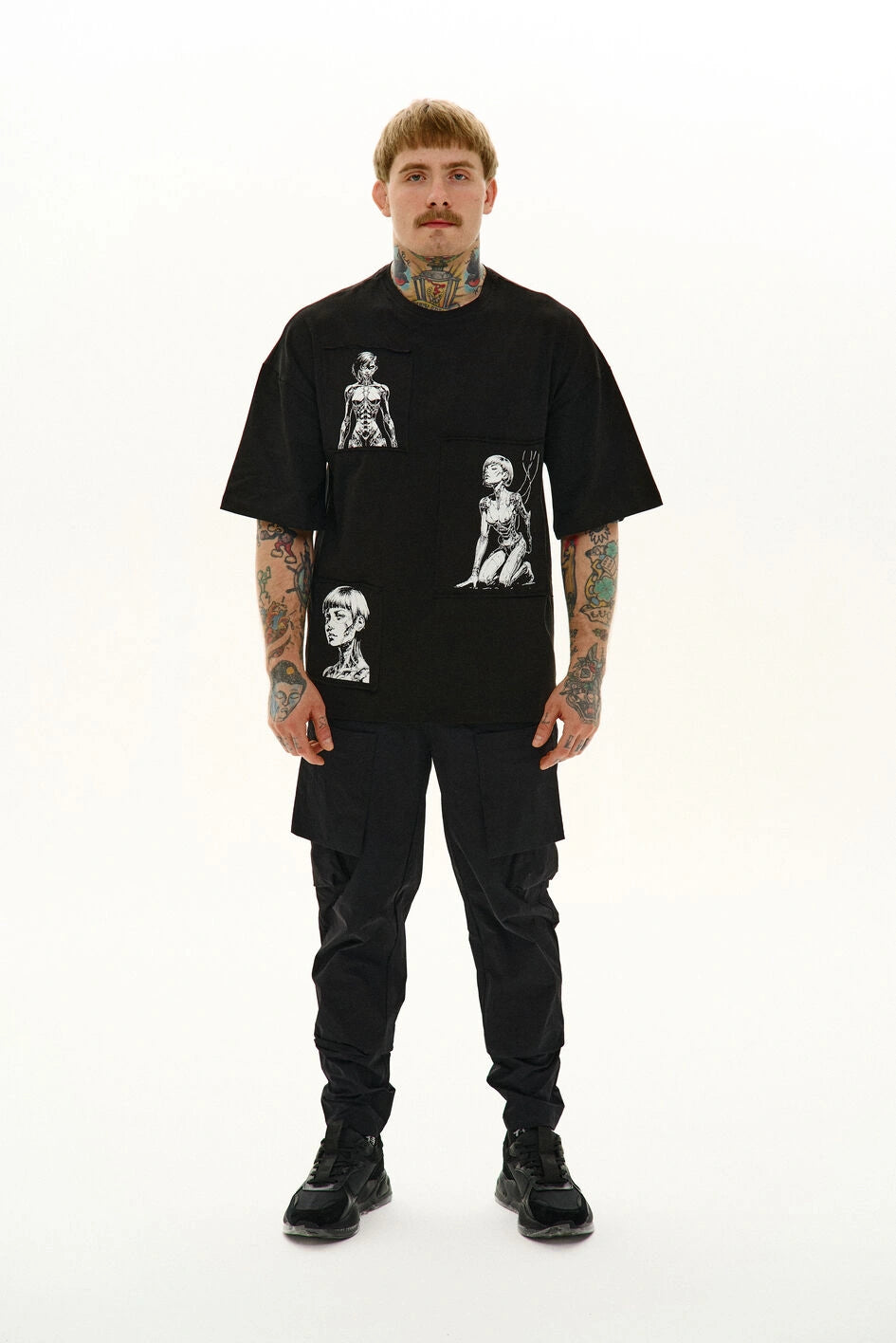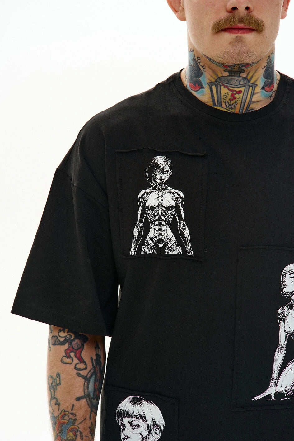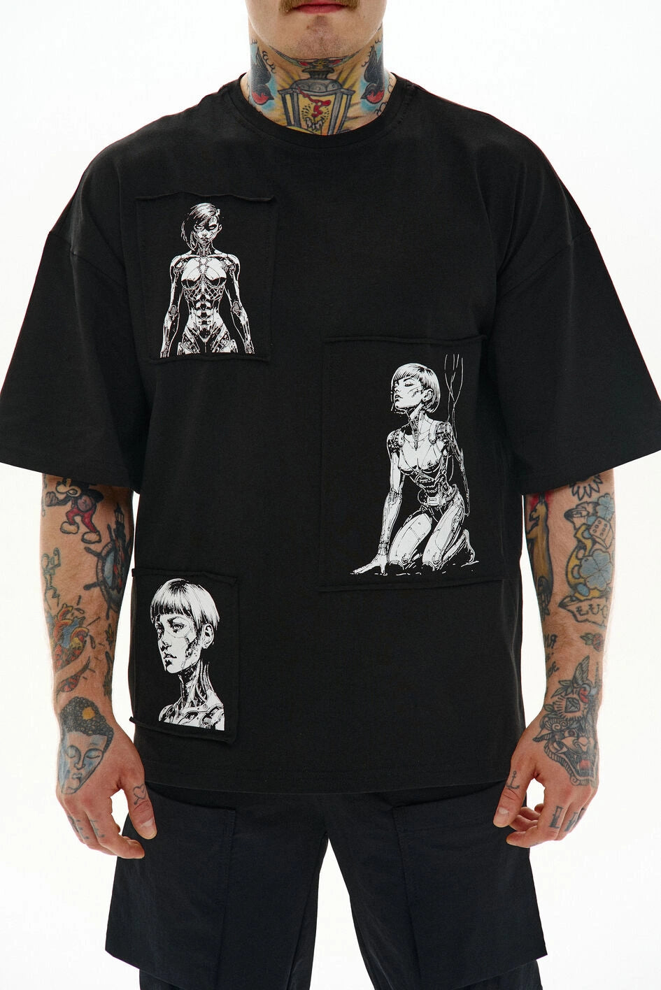 Locker geschnittenes T-Shirt mit Rundhalsausschnitt und verlängerten Ärmeln. Drei separate Prints sind auf Patches aufgebracht und am Stoff befestigt – Details, die dem Modell Charakter verleihen.
