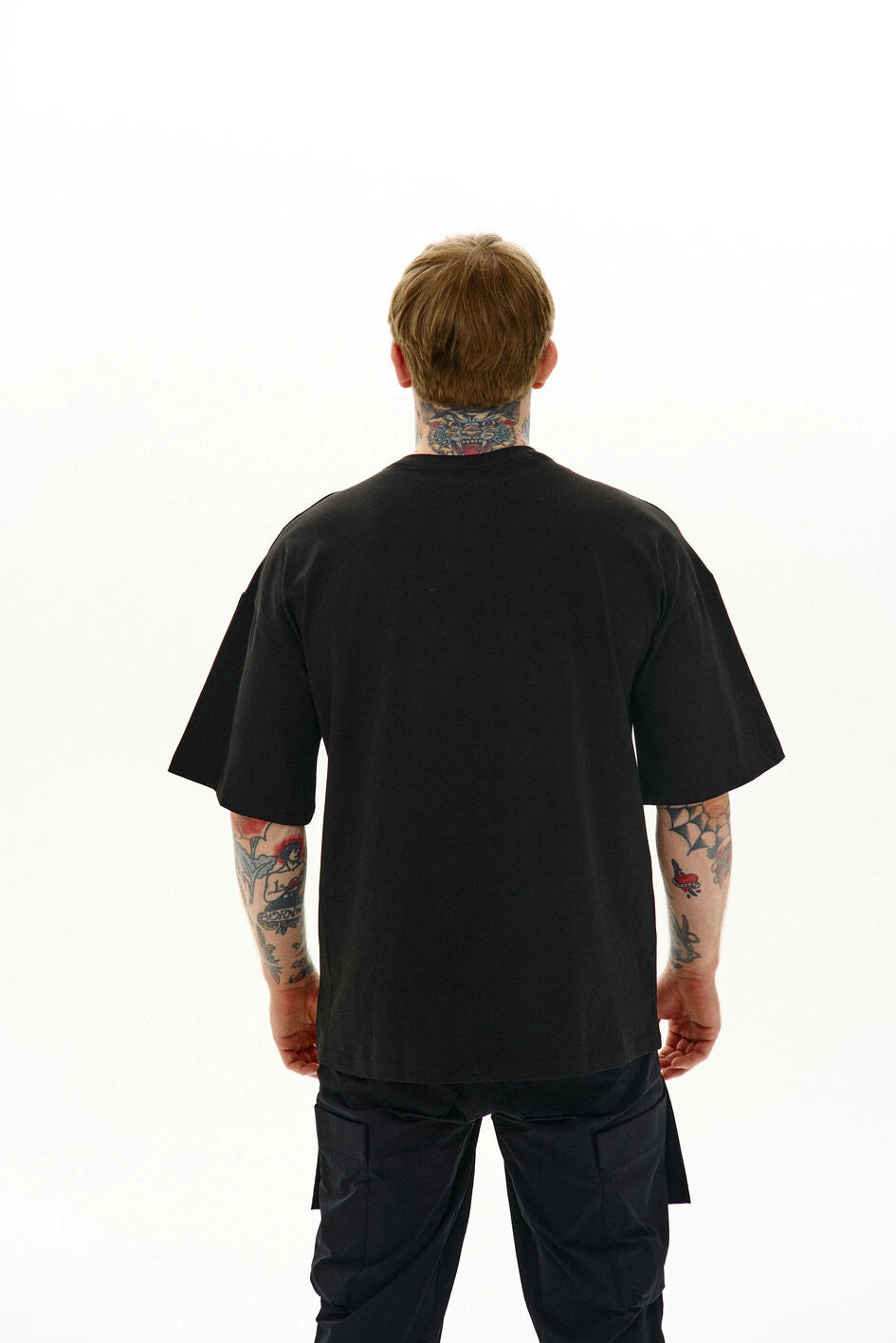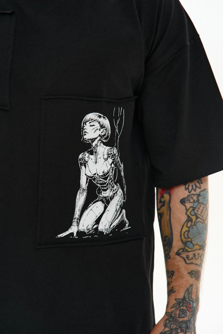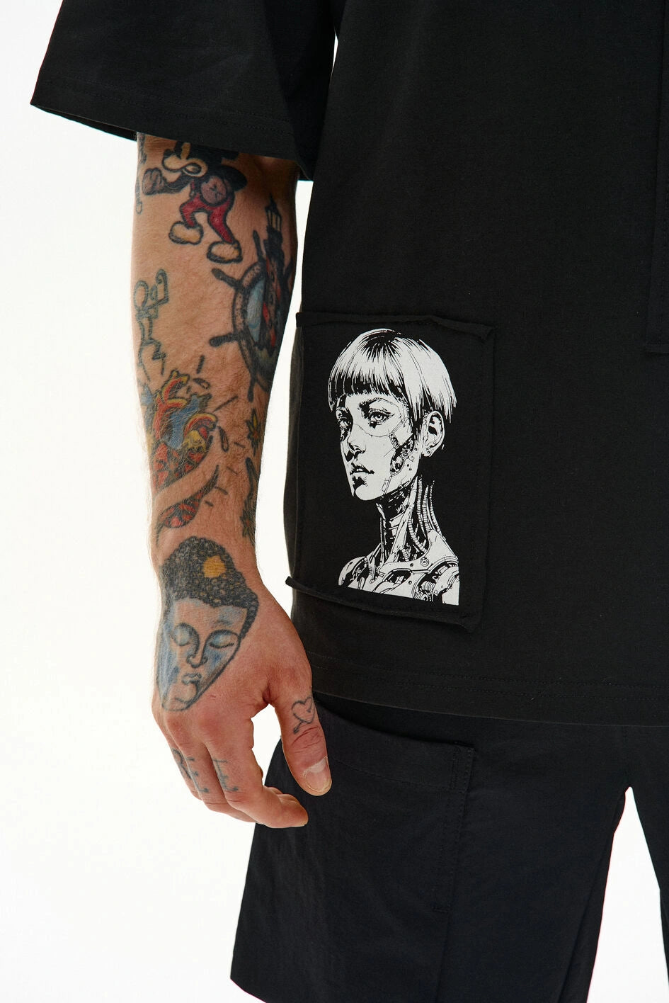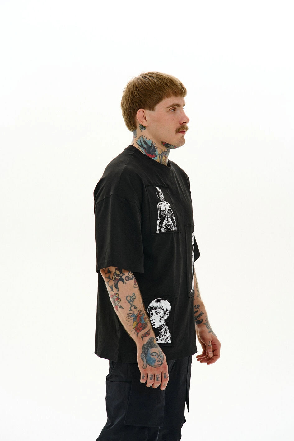Locker geschnittenes T-Shirt mit Rundhalsausschnitt und verlängerten Ärmeln. Drei separate Prints sind auf Patches aufgebracht und am Stoff befestigt – Details, die dem Modell Charakter verleihen.