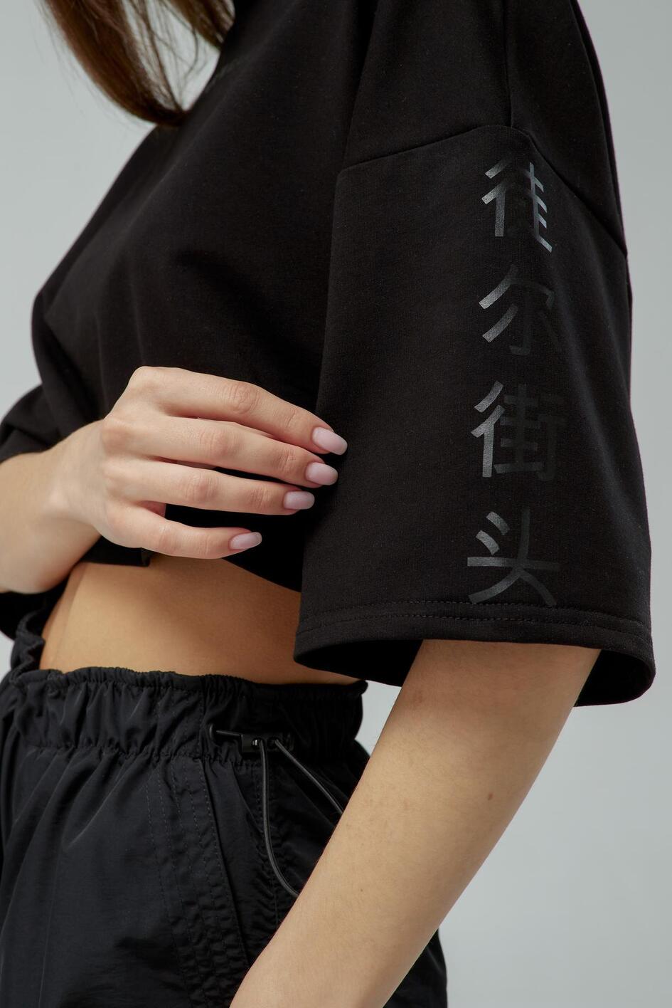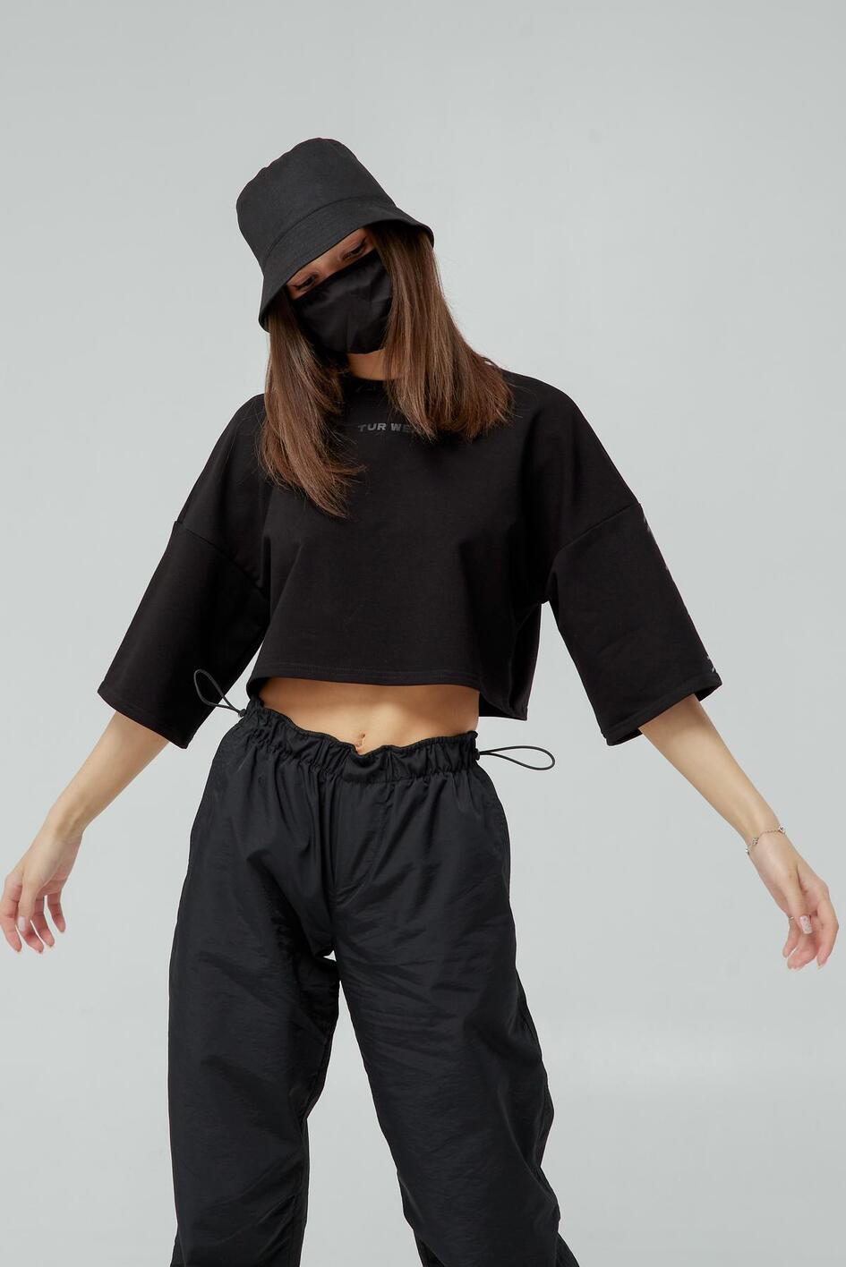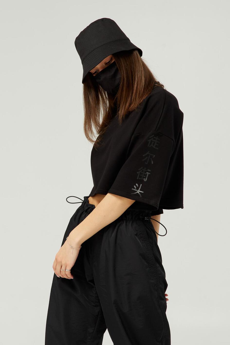 Kurzes T-Shirt mit lockerem Schnitt und verlängertem Ärmel. Auf dem linken Ärmel schwarze Firmen-Hieroglyphen, auf der Vorderseite des T-Shirts ein kleiner Aufdruck „TUR WEAR“.