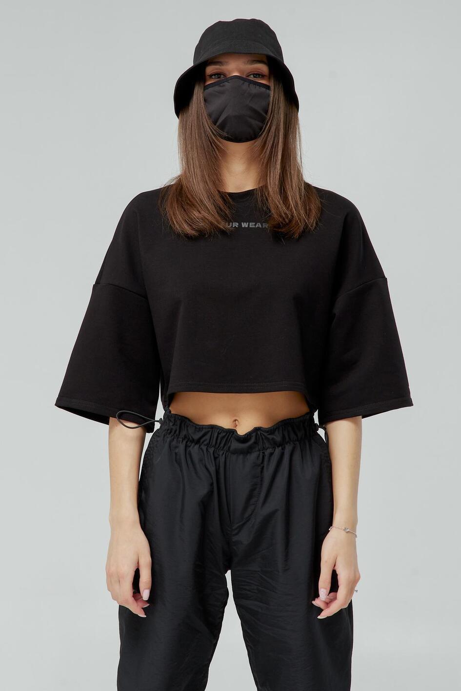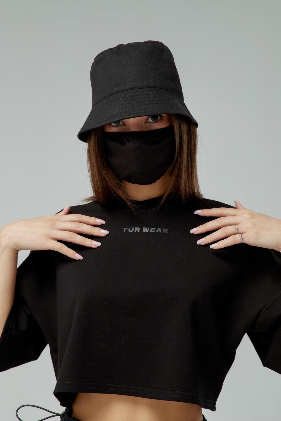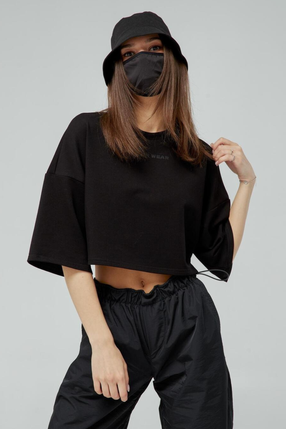 Kurzes T-Shirt mit lockerem Schnitt und verlängertem Ärmel. Auf dem linken Ärmel schwarze Firmen-Hieroglyphen, auf der Vorderseite des T-Shirts ein kleiner Aufdruck „TUR WEAR“.