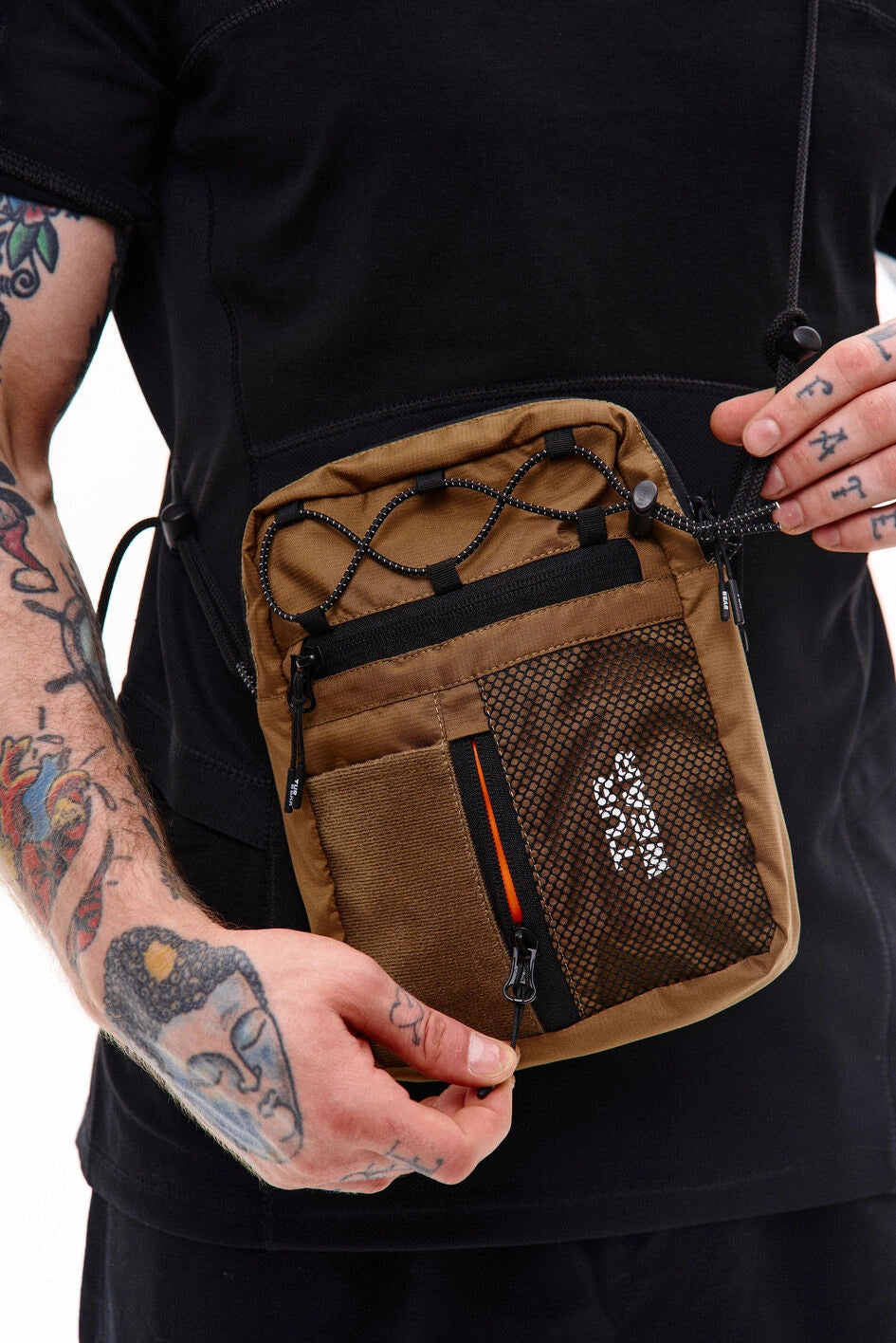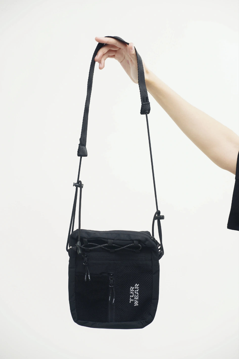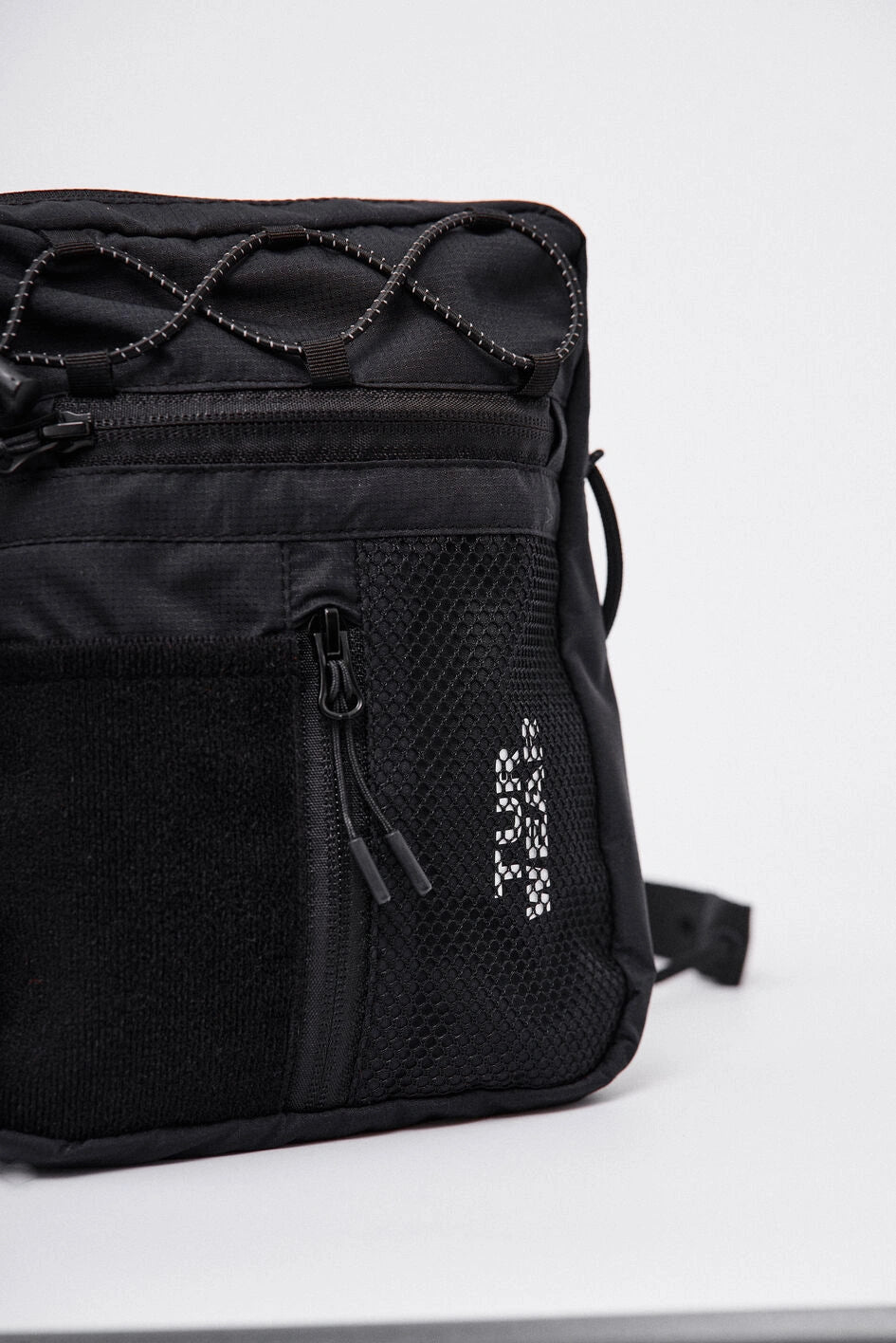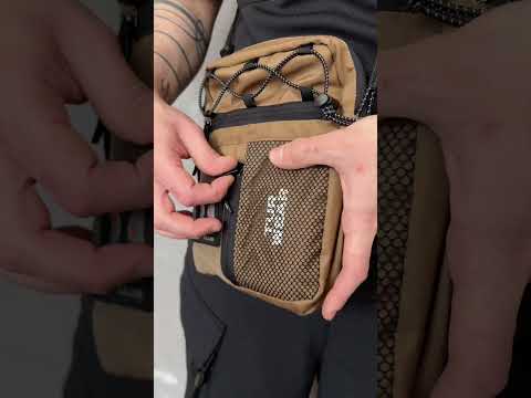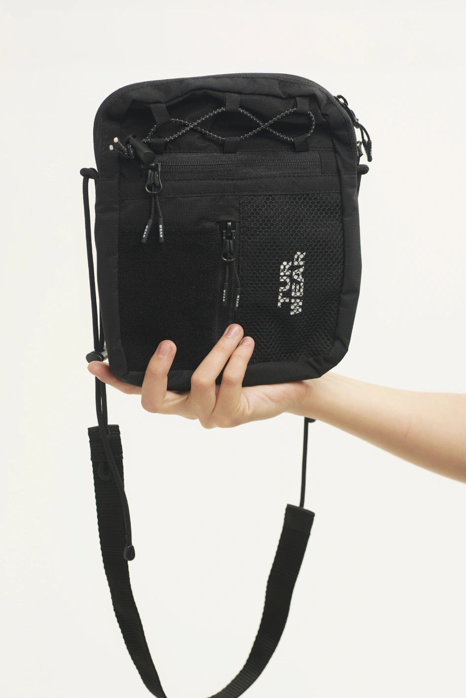 Vertikale Tasche, ideal für kleine Gegenstände wie Handy, Schlüssel, Geldbörse oder Dokumente. Hauptfach mit Reißverschluss und zwei Zippern, darin ein großes Fach und zwei kleine Taschen. Vorne befinden sich horizontale und vertikale Reißverschlusstaschen. Die vertikale Tasche ist mit einem Klettpatch versehen, daneben ein Netzelement mit sichtbarem weißen Markenprint. Die Tasche verfügt über zwei Innentaschen und eine Trennwand. Der Gurt wird mit Woojin-Plastikbeschlägen befestigt, kombiniert aus Kordel und Gurtband. Die Gurtclips sind über reflektierende elastische Kordel-„Ösen“ an der Tasche befestigt. Die obere Partie ist zusätzlich mit reflektierendem elastischem Kordelzug versehen.