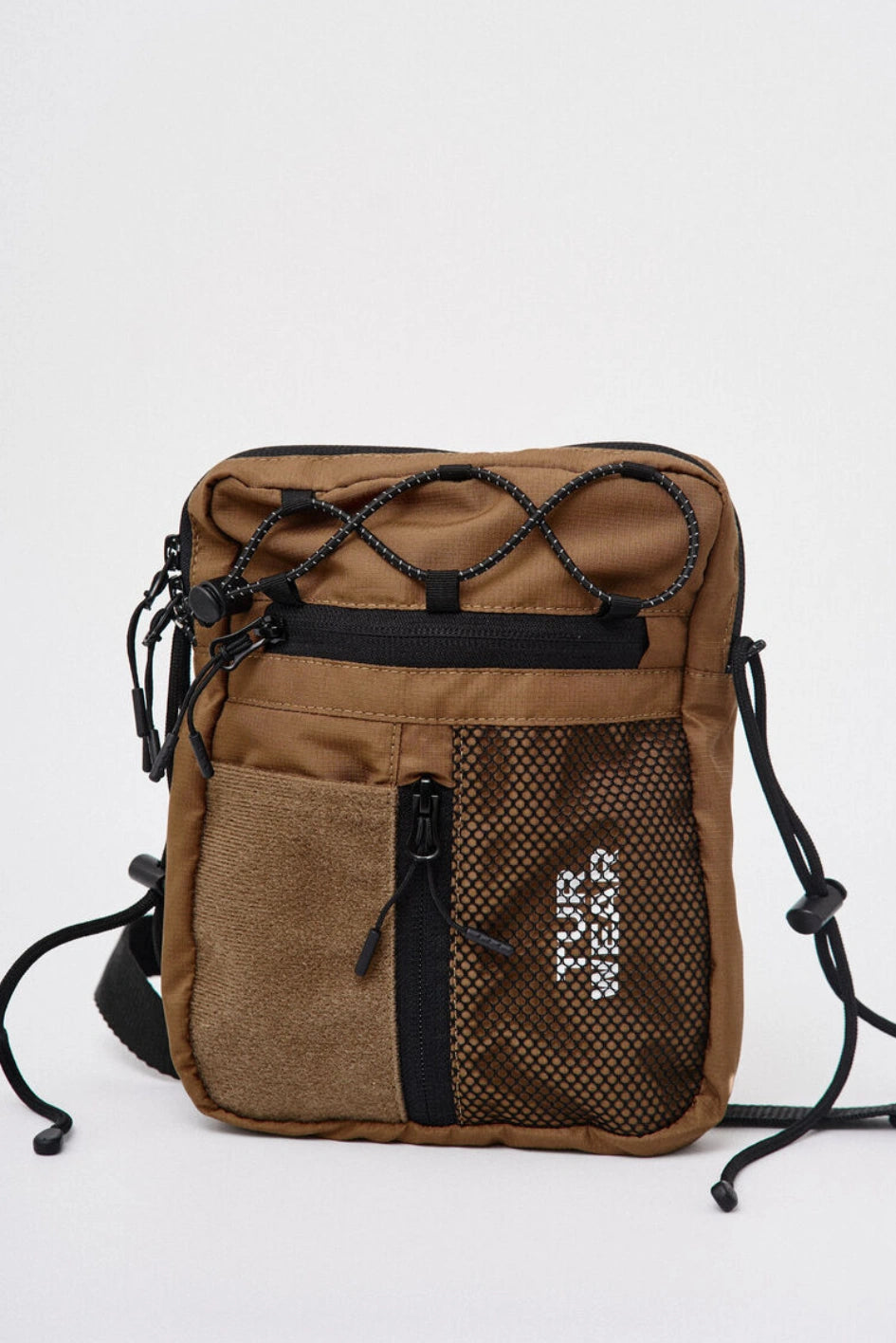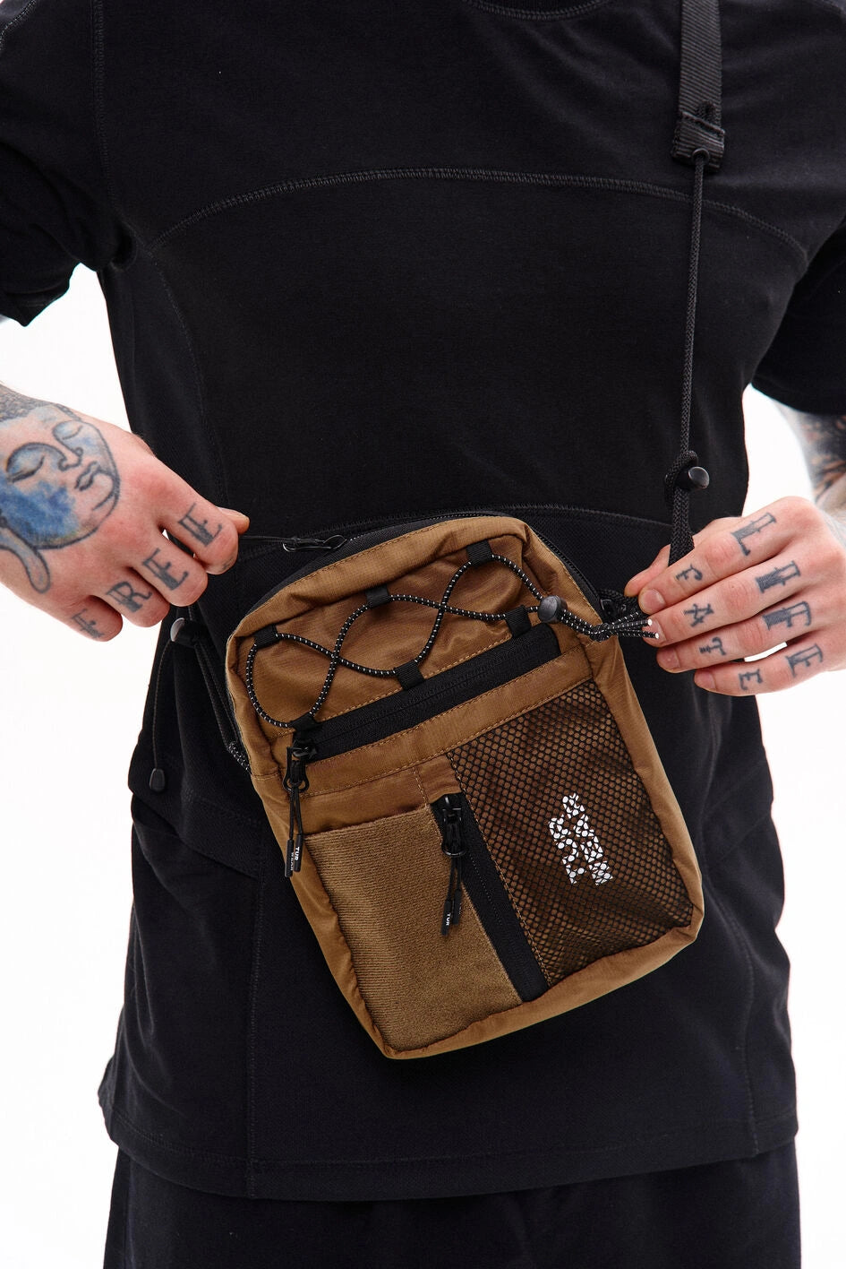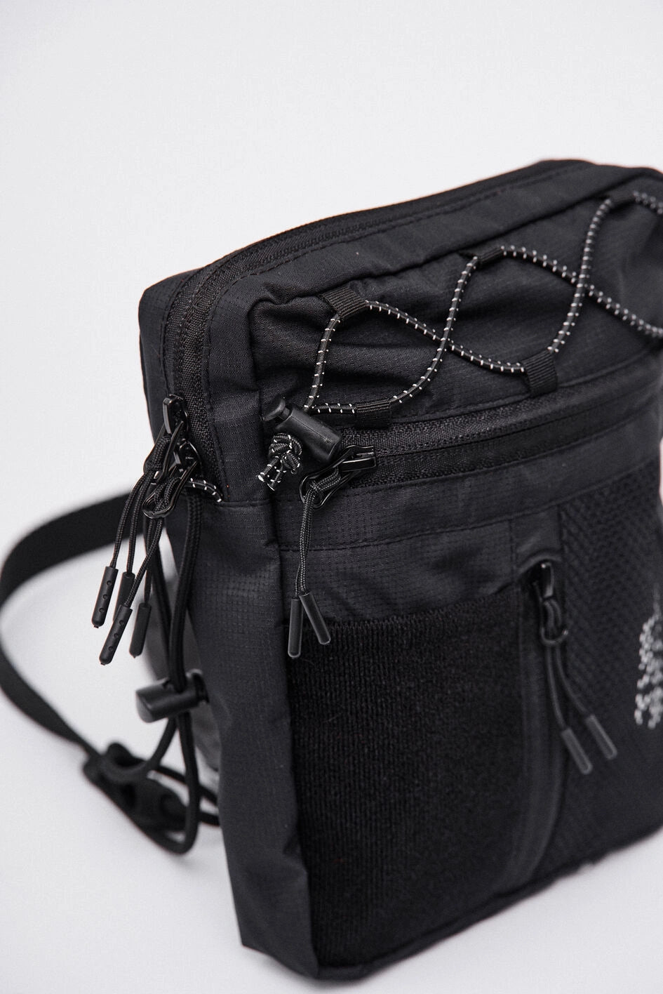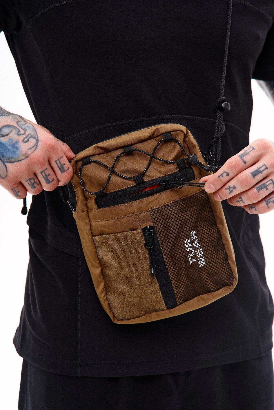 Vertikale Tasche, ideal für kleine Gegenstände wie Handy, Schlüssel, Geldbörse oder Dokumente. Hauptfach mit Reißverschluss und zwei Zippern, darin ein großes Fach und zwei kleine Taschen. Vorne befinden sich horizontale und vertikale Reißverschlusstaschen. Die vertikale Tasche ist mit einem Klettpatch versehen, daneben ein Netzelement mit sichtbarem weißen Markenprint. Die Tasche verfügt über zwei Innentaschen und eine Trennwand. Der Gurt wird mit Woojin-Plastikbeschlägen befestigt, kombiniert aus Kordel und Gurtband. Die Gurtclips sind über reflektierende elastische Kordel-„Ösen“ an der Tasche befestigt. Die obere Partie ist zusätzlich mit reflektierendem elastischem Kordelzug versehen.