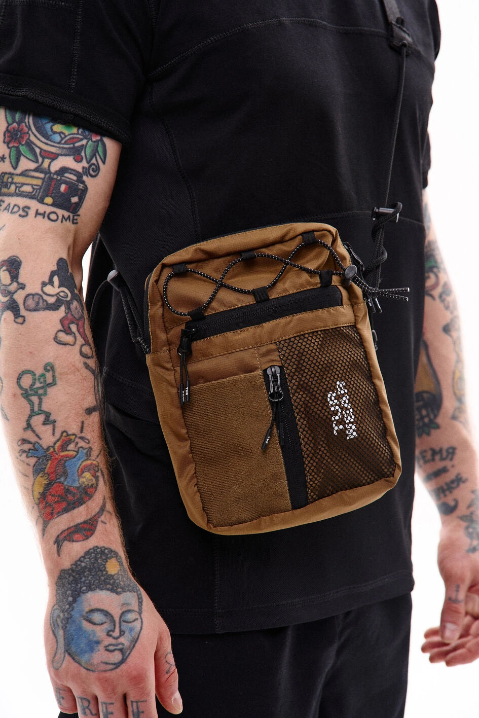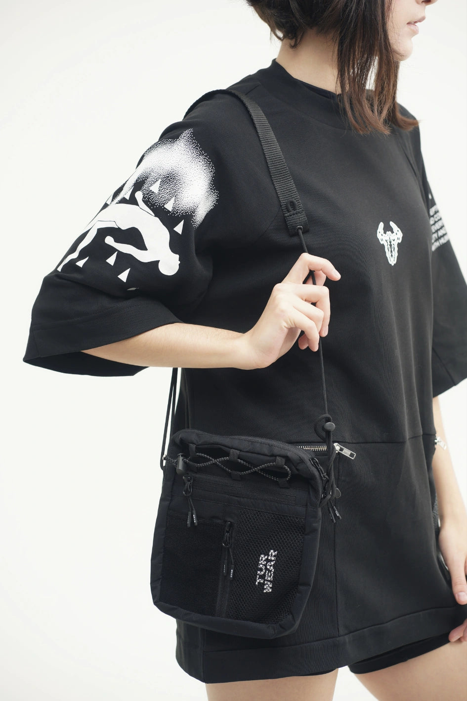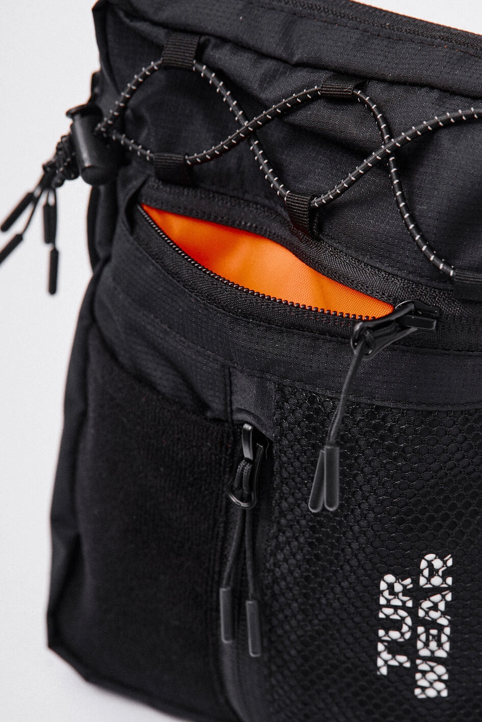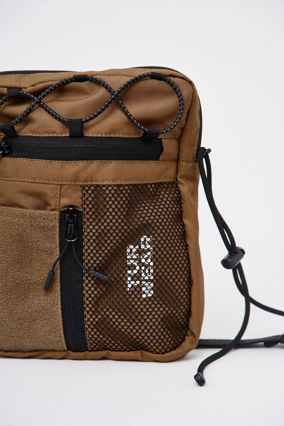 Vertikale Tasche, ideal für kleine Gegenstände wie Handy, Schlüssel, Geldbörse oder Dokumente. Hauptfach mit Reißverschluss und zwei Zippern, darin ein großes Fach und zwei kleine Taschen. Vorne befinden sich horizontale und vertikale Reißverschlusstaschen. Die vertikale Tasche ist mit einem Klettpatch versehen, daneben ein Netzelement mit sichtbarem weißen Markenprint. Die Tasche verfügt über zwei Innentaschen und eine Trennwand. Der Gurt wird mit Woojin-Plastikbeschlägen befestigt, kombiniert aus Kordel und Gurtband. Die Gurtclips sind über reflektierende elastische Kordel-„Ösen“ an der Tasche befestigt. Die obere Partie ist zusätzlich mit reflektierendem elastischem Kordelzug versehen.