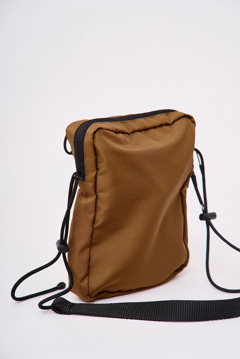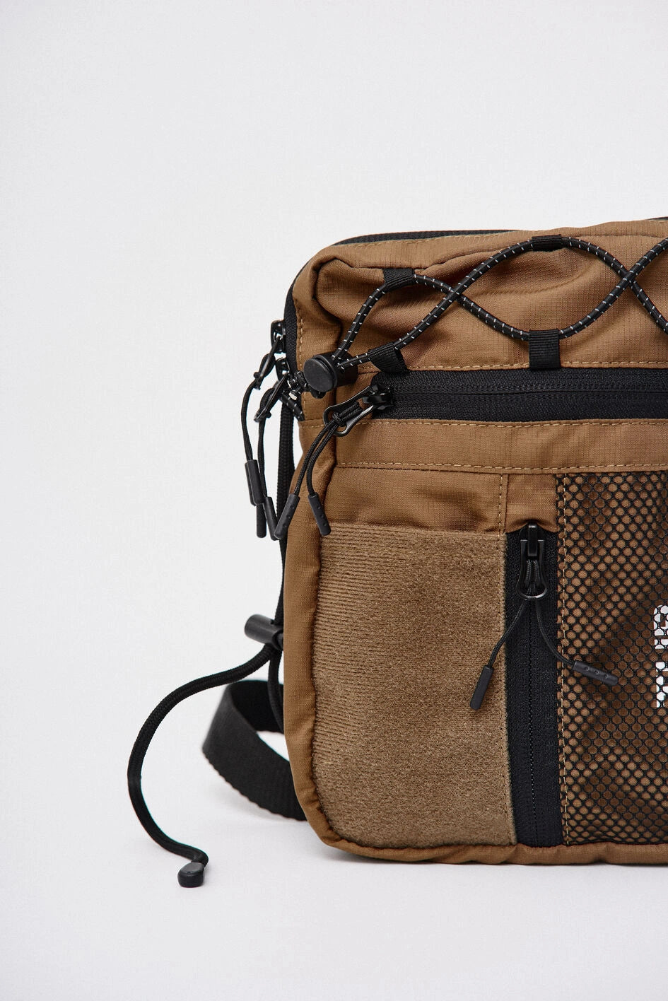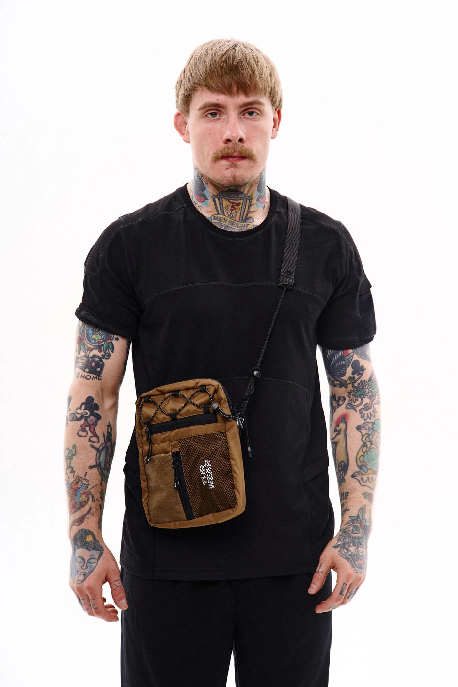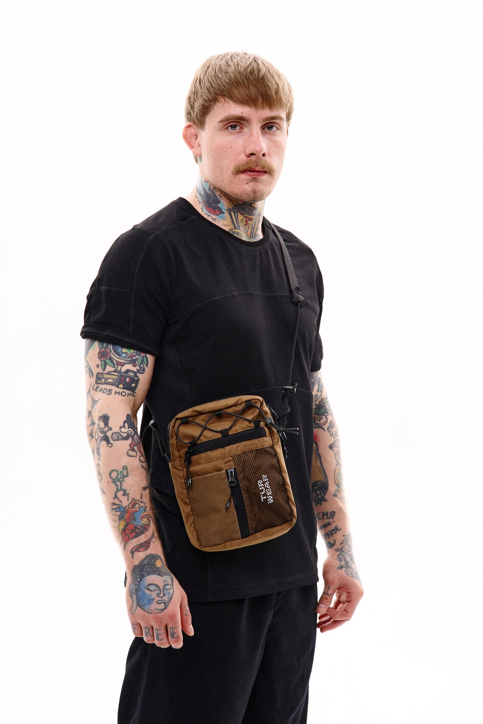 Vertikale Tasche, ideal für kleine Gegenstände wie Handy, Schlüssel, Geldbörse oder Dokumente. Hauptfach mit Reißverschluss und zwei Zippern, darin ein großes Fach und zwei kleine Taschen. Vorne befinden sich horizontale und vertikale Reißverschlusstaschen. Die vertikale Tasche ist mit einem Klettpatch versehen, daneben ein Netzelement mit sichtbarem weißen Markenprint. Die Tasche verfügt über zwei Innentaschen und eine Trennwand. Der Gurt wird mit Woojin-Plastikbeschlägen befestigt, kombiniert aus Kordel und Gurtband. Die Gurtclips sind über reflektierende elastische Kordel-„Ösen“ an der Tasche befestigt. Die obere Partie ist zusätzlich mit reflektierendem elastischem Kordelzug versehen.