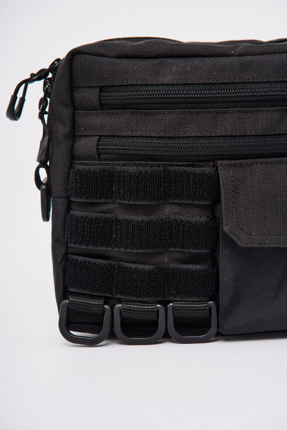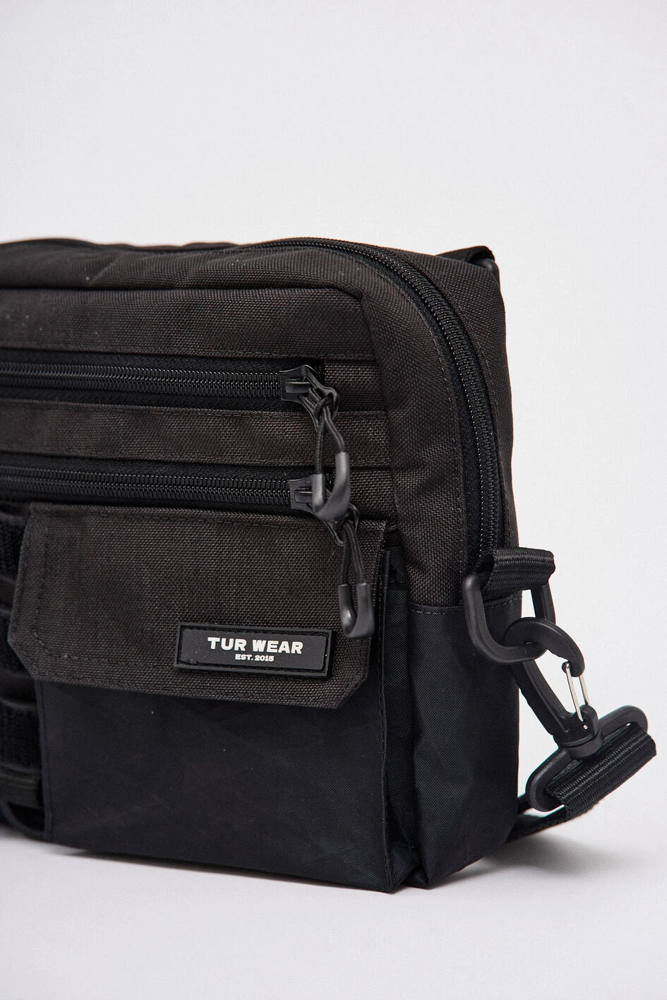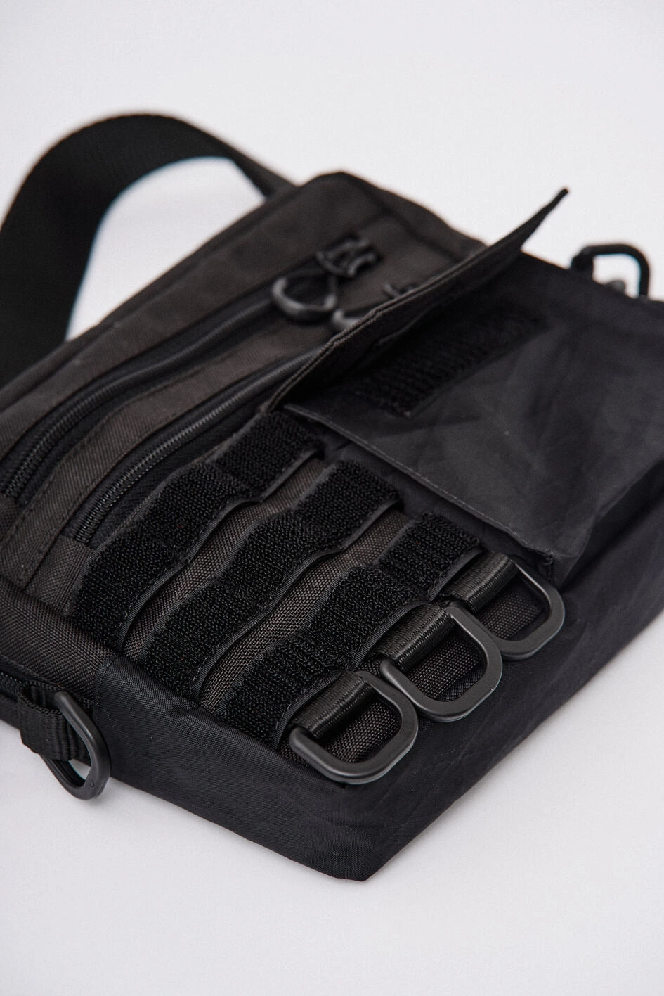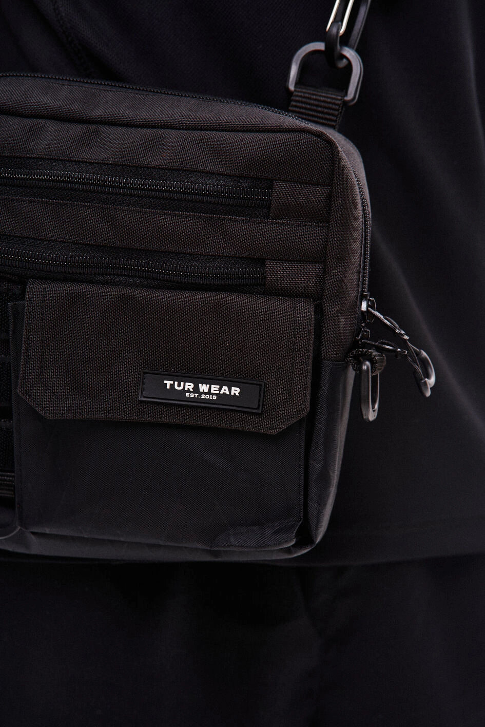 Tasche aus robustem Cordura-Nylon mit unterem Teil aus X-Pac-Material. Vorne eine Klappentasche für Geldbörse mit Gummi-Logo-Label. Daneben drei MOLLE-Reihen mit aufgenähtem Klett für Patches. Unter den MOLLE befinden sich drei Halbringe für Karabiner. Zusätzlich vorne zwei horizontale Reißverschlusstaschen. Hauptfach mit Doppelzipper, Schlüsselkarabiner und zusätzlicher Dokumententasche. Im Inneren zwei Fächer für Ladegeräte und Kopfhörer sowie eine Trennwand. Die Tasche bietet vier Befestigungsoptionen für den Gurt, der mit drehbaren Woojin Plastic-Karabinern angebracht ist. Auf der Rückseite befinden sich zwei Netzfächer mit elastischem Kordelzug am oberen Rand.