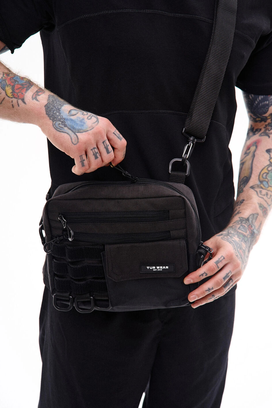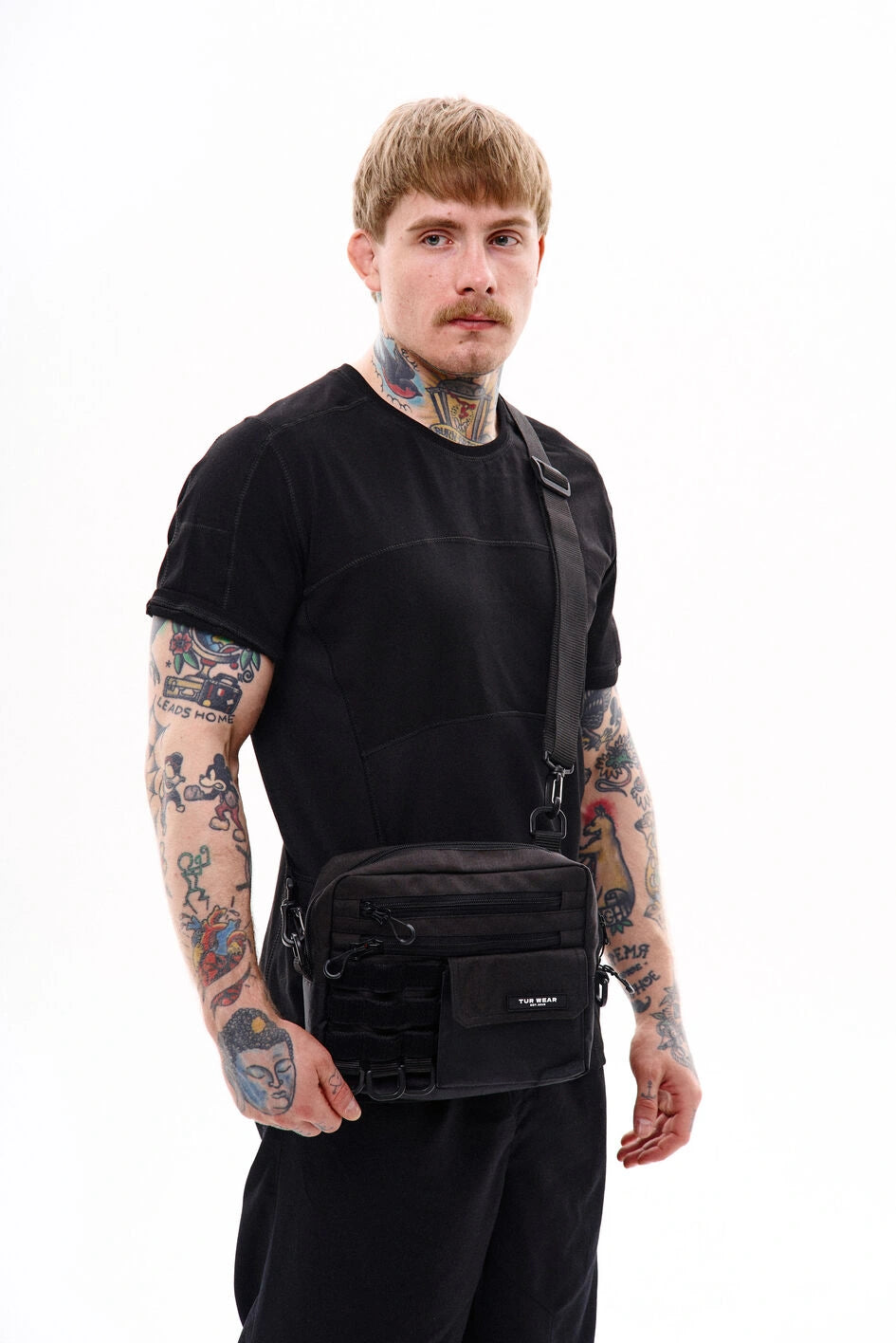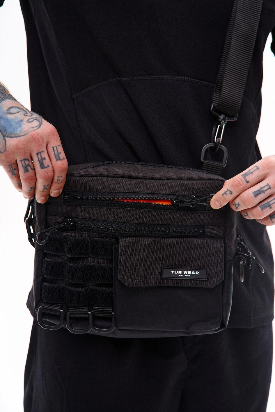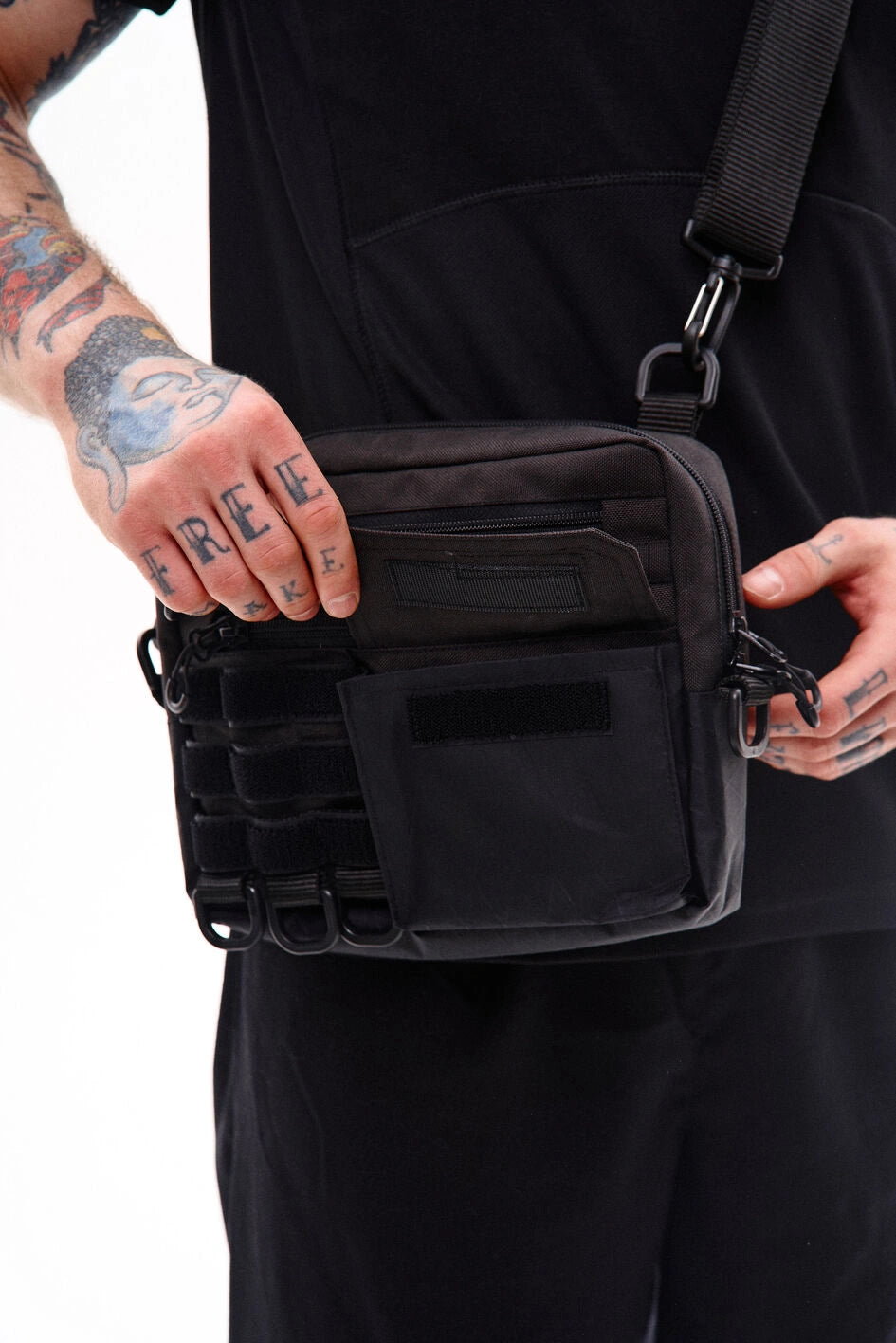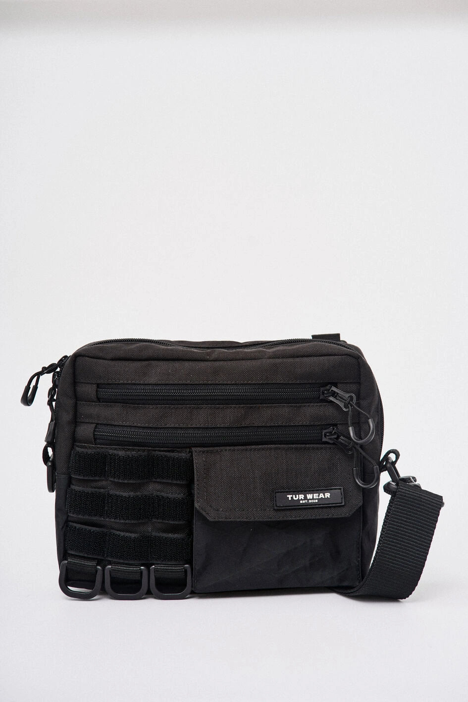 Tasche aus robustem Cordura-Nylon mit unterem Teil aus X-Pac-Material. Vorne eine Klappentasche für Geldbörse mit Gummi-Logo-Label. Daneben drei MOLLE-Reihen mit aufgenähtem Klett für Patches. Unter den MOLLE befinden sich drei Halbringe für Karabiner. Zusätzlich vorne zwei horizontale Reißverschlusstaschen. Hauptfach mit Doppelzipper, Schlüsselkarabiner und zusätzlicher Dokumententasche. Im Inneren zwei Fächer für Ladegeräte und Kopfhörer sowie eine Trennwand. Die Tasche bietet vier Befestigungsoptionen für den Gurt, der mit drehbaren Woojin Plastic-Karabinern angebracht ist. Auf der Rückseite befinden sich zwei Netzfächer mit elastischem Kordelzug am oberen Rand.