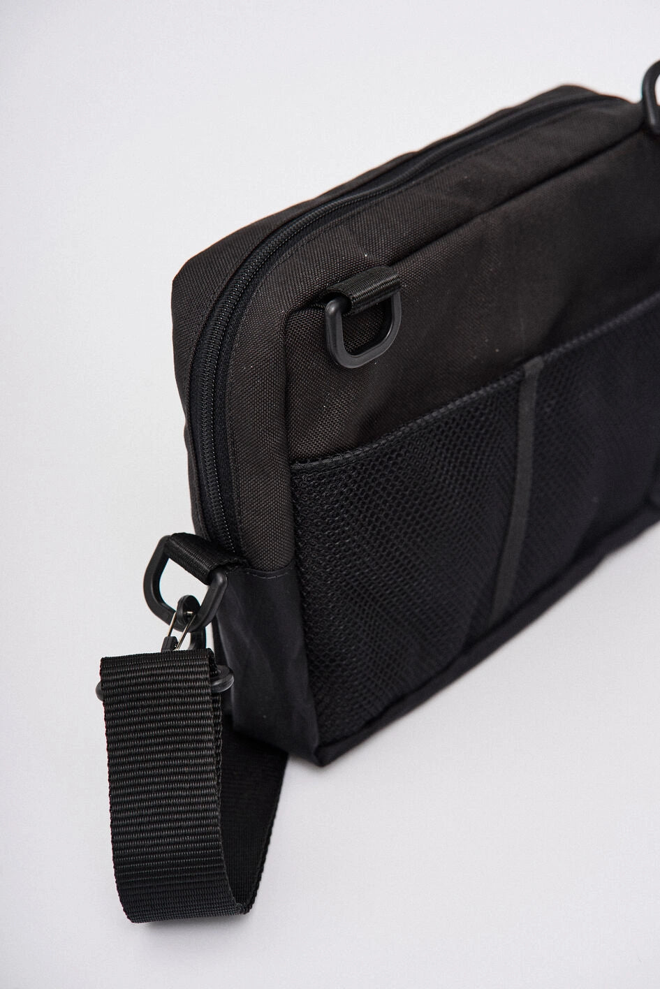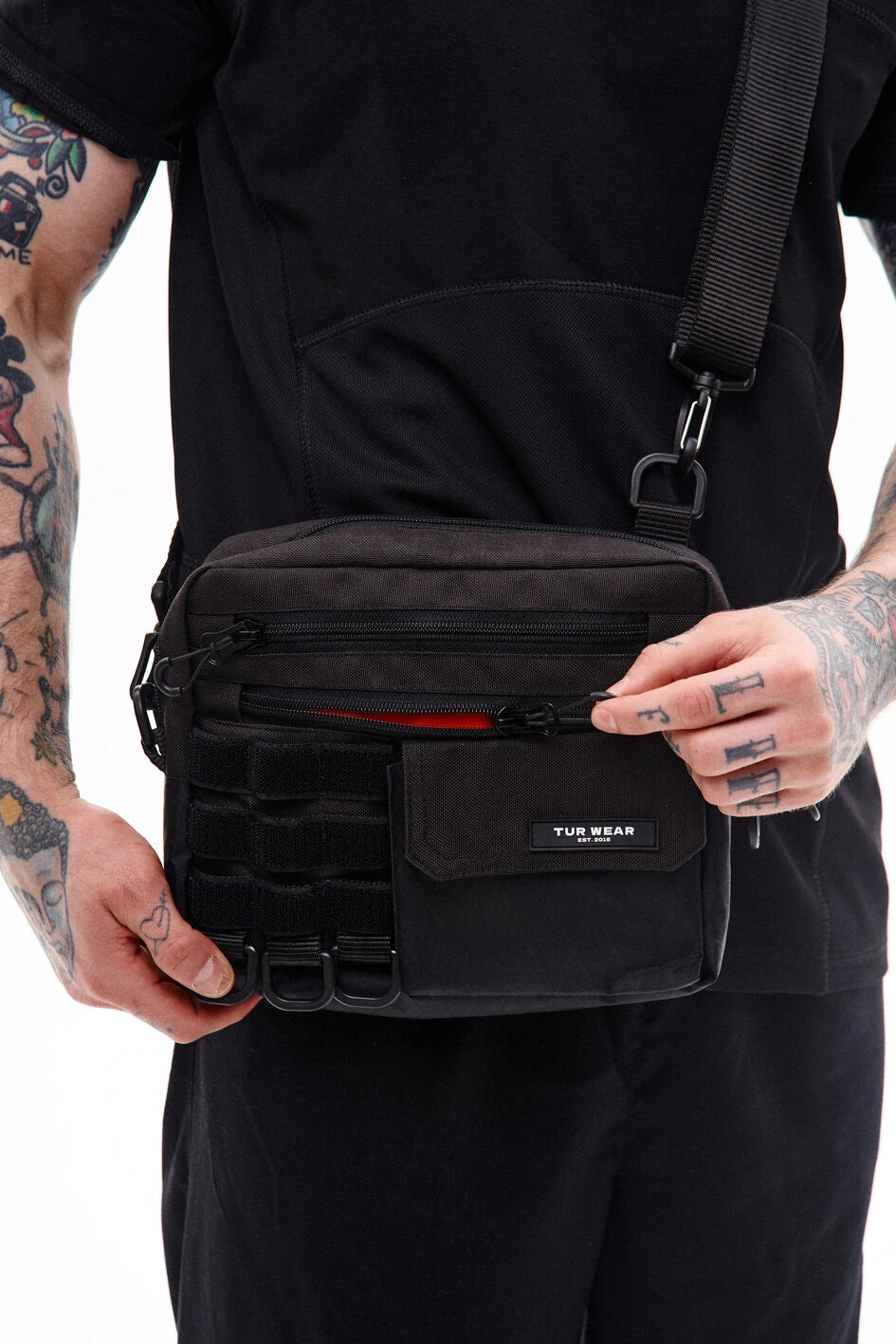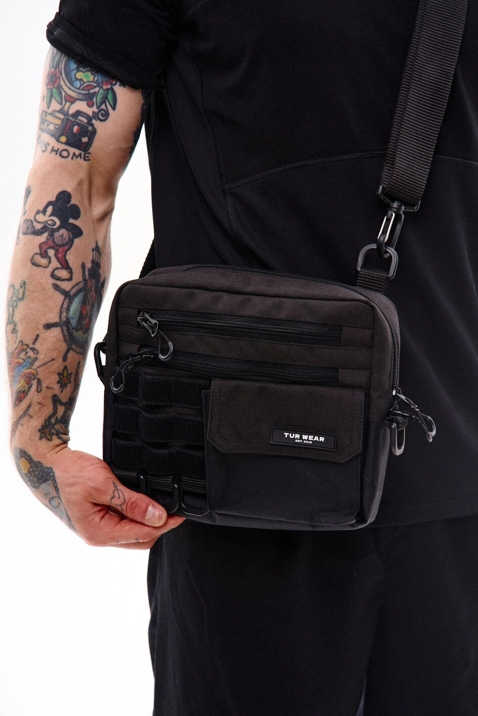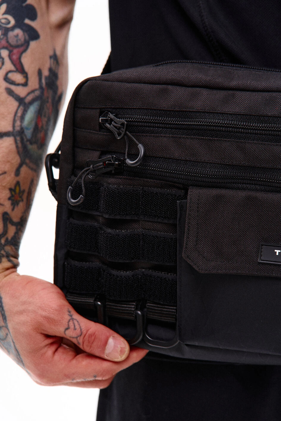 Tasche aus robustem Cordura-Nylon mit unterem Teil aus X-Pac-Material. Vorne eine Klappentasche für Geldbörse mit Gummi-Logo-Label. Daneben drei MOLLE-Reihen mit aufgenähtem Klett für Patches. Unter den MOLLE befinden sich drei Halbringe für Karabiner. Zusätzlich vorne zwei horizontale Reißverschlusstaschen. Hauptfach mit Doppelzipper, Schlüsselkarabiner und zusätzlicher Dokumententasche. Im Inneren zwei Fächer für Ladegeräte und Kopfhörer sowie eine Trennwand. Die Tasche bietet vier Befestigungsoptionen für den Gurt, der mit drehbaren Woojin Plastic-Karabinern angebracht ist. Auf der Rückseite befinden sich zwei Netzfächer mit elastischem Kordelzug am oberen Rand.