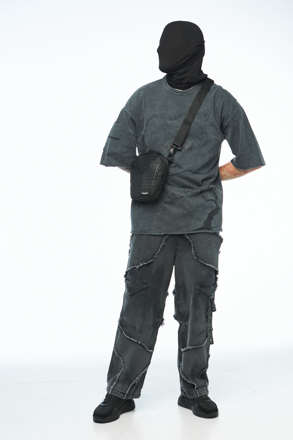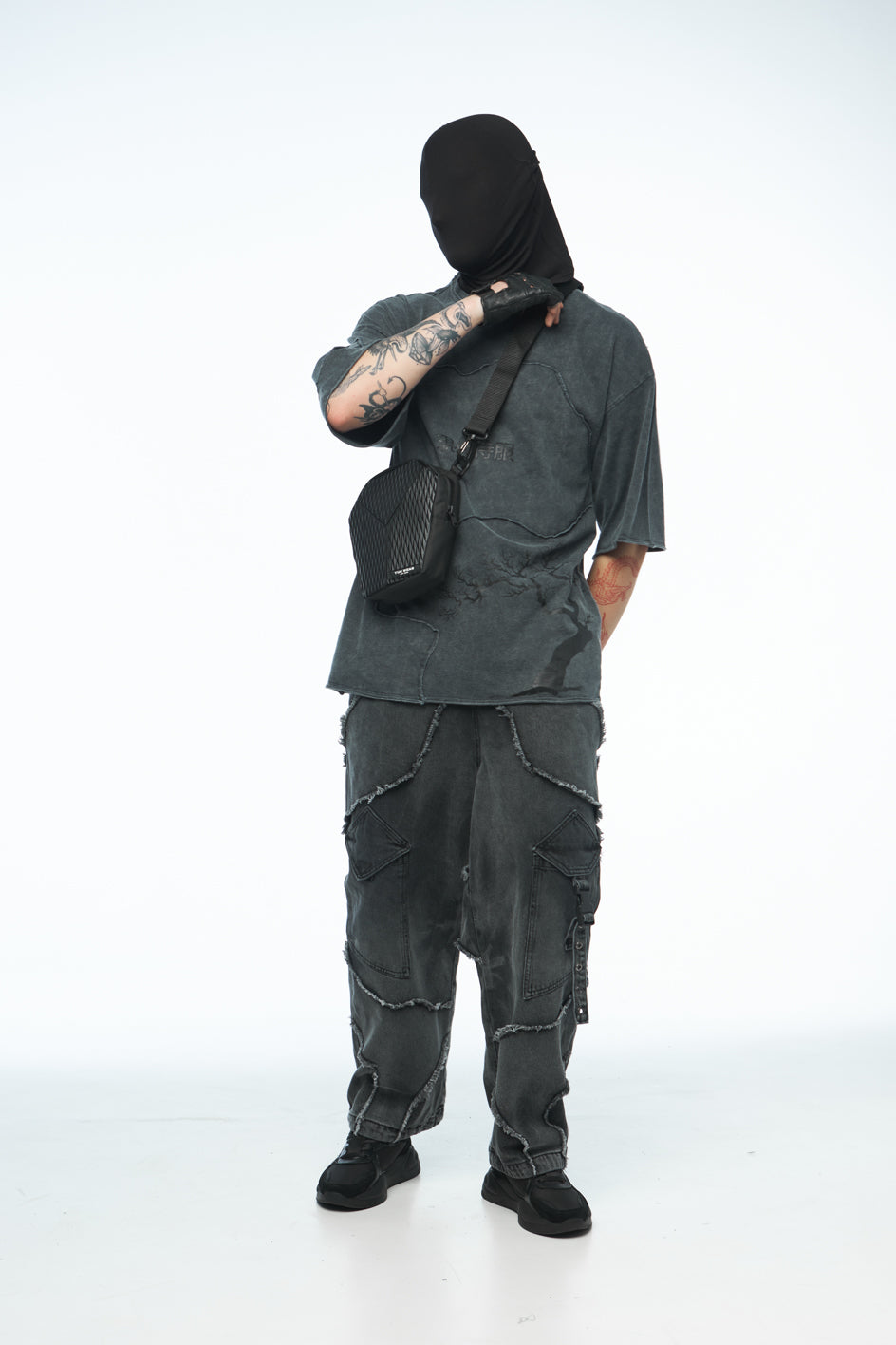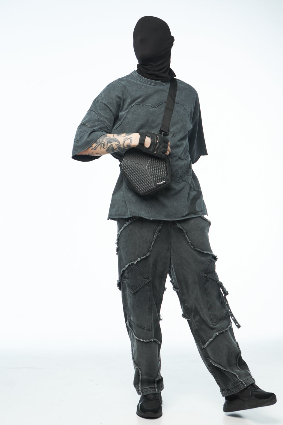 Textile Umhängetasche, kombiniert aus verschiedenen Materialien. Sie verfügt über zwei Innentaschen, einen Griff sowie einen abnehmbaren, verstellbaren Schulterriemen. Das Hauptfach wird mit einem Reißverschluss geschlossen.