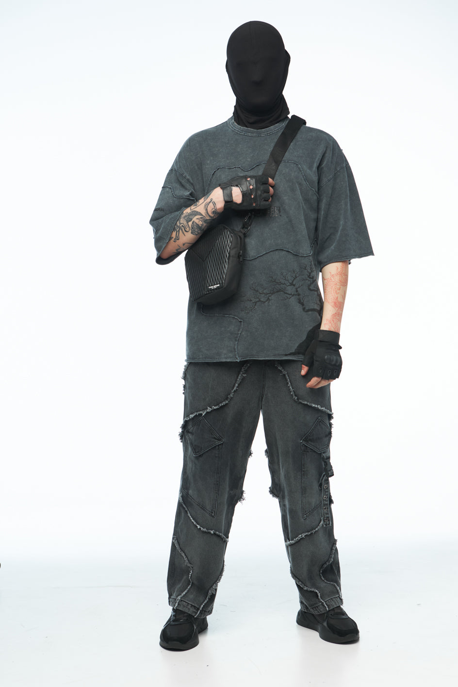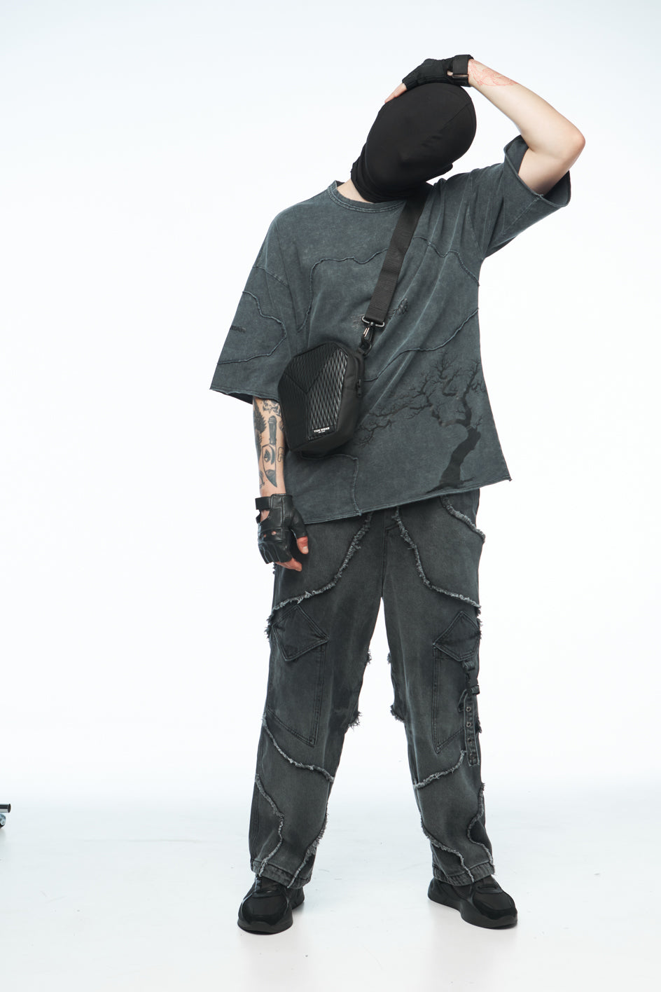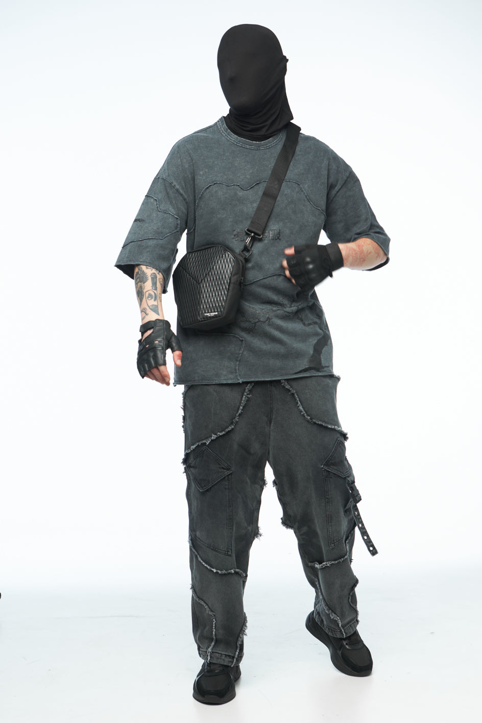 Textile Umhängetasche, kombiniert aus verschiedenen Materialien. Sie verfügt über zwei Innentaschen, einen Griff sowie einen abnehmbaren, verstellbaren Schulterriemen. Das Hauptfach wird mit einem Reißverschluss geschlossen.