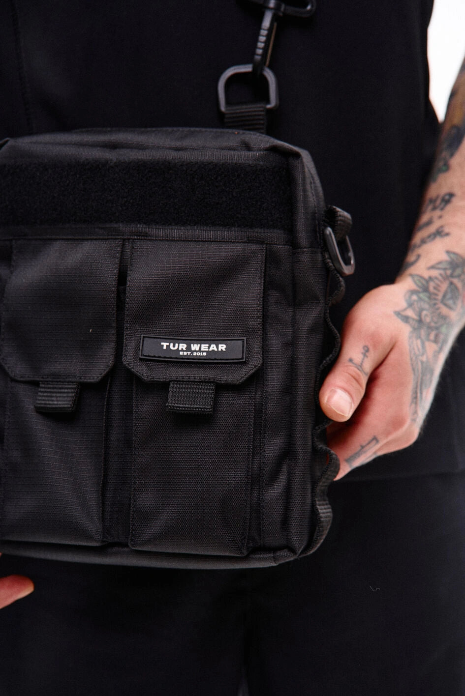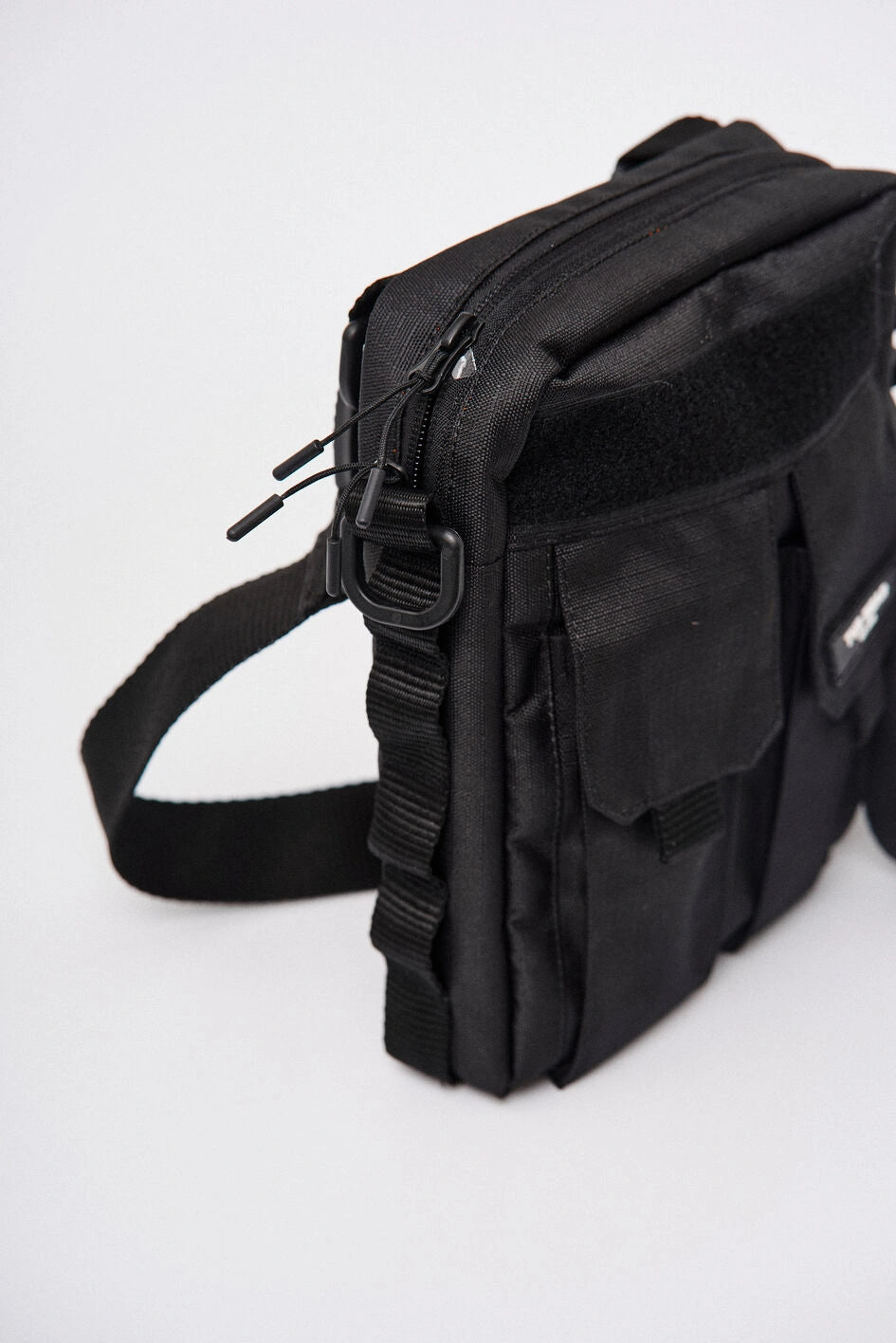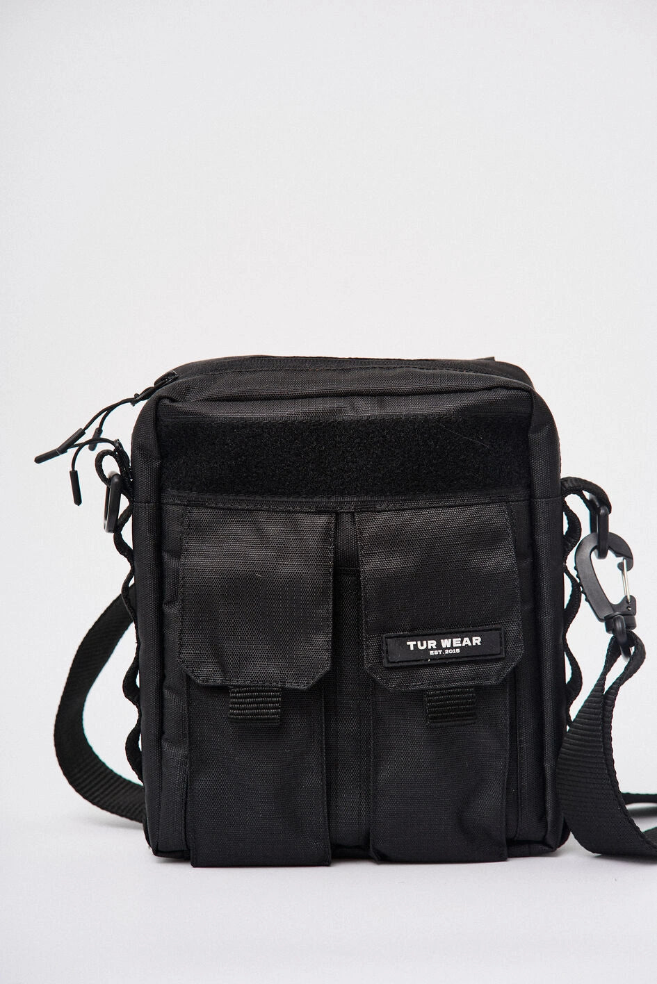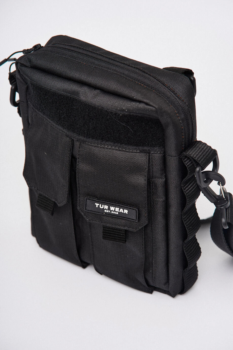 Vertikale Tasche mit zwei Fronttaschen für Telefone, mit Marken-Gummilogo auf der Klappe der linken Tasche. Über den Taschen befindet sich ein Klettfeld zur Personalisierung. Die Seitenwände sind mit MOLLE-Schlaufen zum Befestigen von Karabinern ausgestattet. Die Tasche bietet zwei Befestigungsmöglichkeiten für den Gurt: seitlich und hinten, um verschiedene Trageformate je nach Bedarf zu ermöglichen. Der Gurt ist mit Woojin-Kunststoffkarabinern befestigt. Das Hauptfach mit Reißverschluss und Doppelzipper verfügt über einen Karabiner für Schlüssel und vier Taschen für Kleinteile, zudem geeignet für ein A5-Notizbuch. Auf der Rückseite befindet sich eine zusätzliche Tasche mit Knopf. Hergestellt aus robustem Ripstop-Nylon, das schnitt- und reißfest ist.