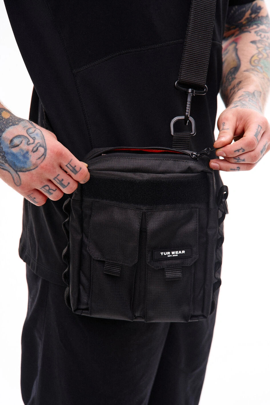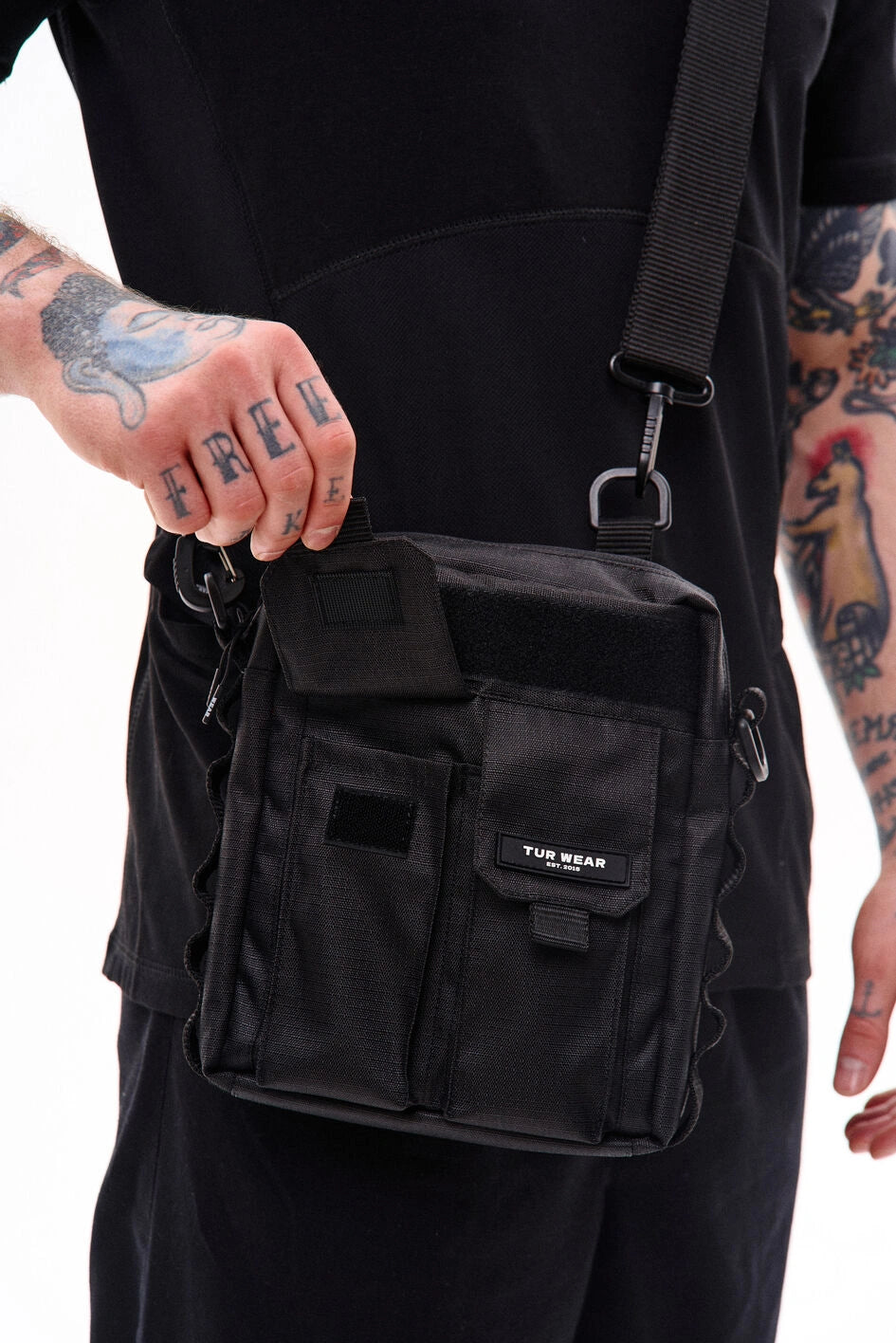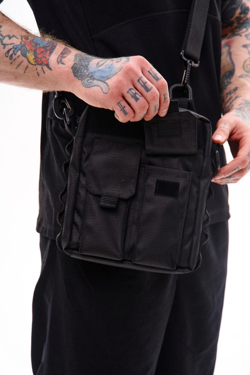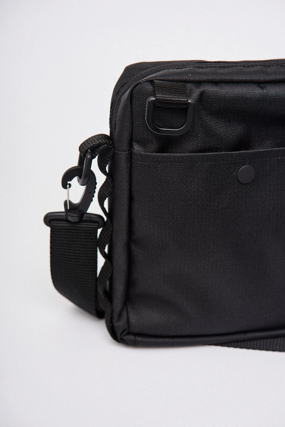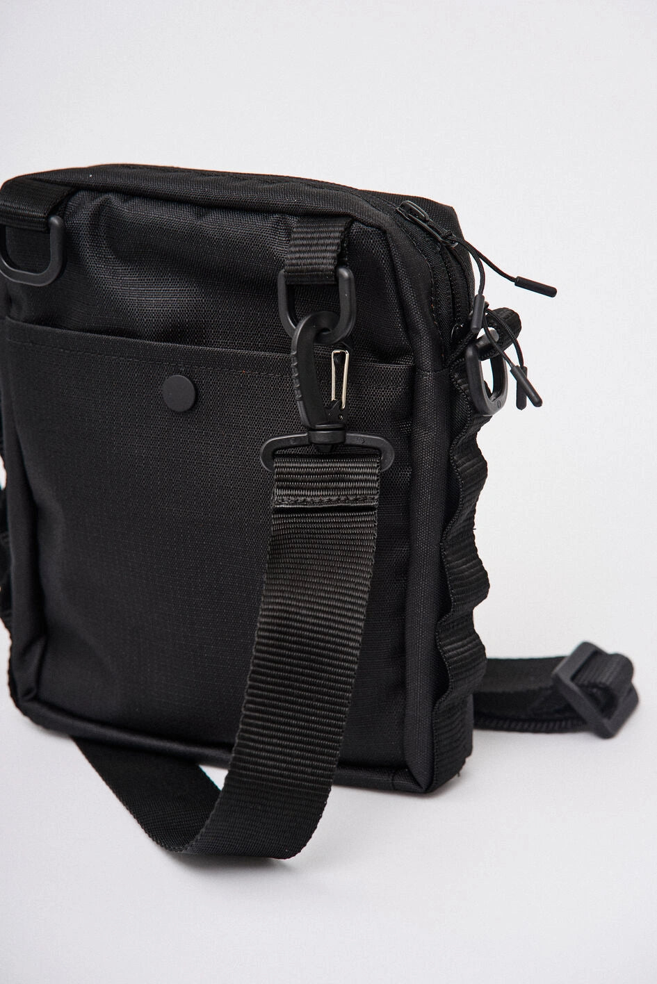 Vertikale Tasche mit zwei Fronttaschen für Telefone, mit Marken-Gummilogo auf der Klappe der linken Tasche. Über den Taschen befindet sich ein Klettfeld zur Personalisierung. Die Seitenwände sind mit MOLLE-Schlaufen zum Befestigen von Karabinern ausgestattet. Die Tasche bietet zwei Befestigungsmöglichkeiten für den Gurt: seitlich und hinten, um verschiedene Trageformate je nach Bedarf zu ermöglichen. Der Gurt ist mit Woojin-Kunststoffkarabinern befestigt. Das Hauptfach mit Reißverschluss und Doppelzipper verfügt über einen Karabiner für Schlüssel und vier Taschen für Kleinteile, zudem geeignet für ein A5-Notizbuch. Auf der Rückseite befindet sich eine zusätzliche Tasche mit Knopf. Hergestellt aus robustem Ripstop-Nylon, das schnitt- und reißfest ist.
