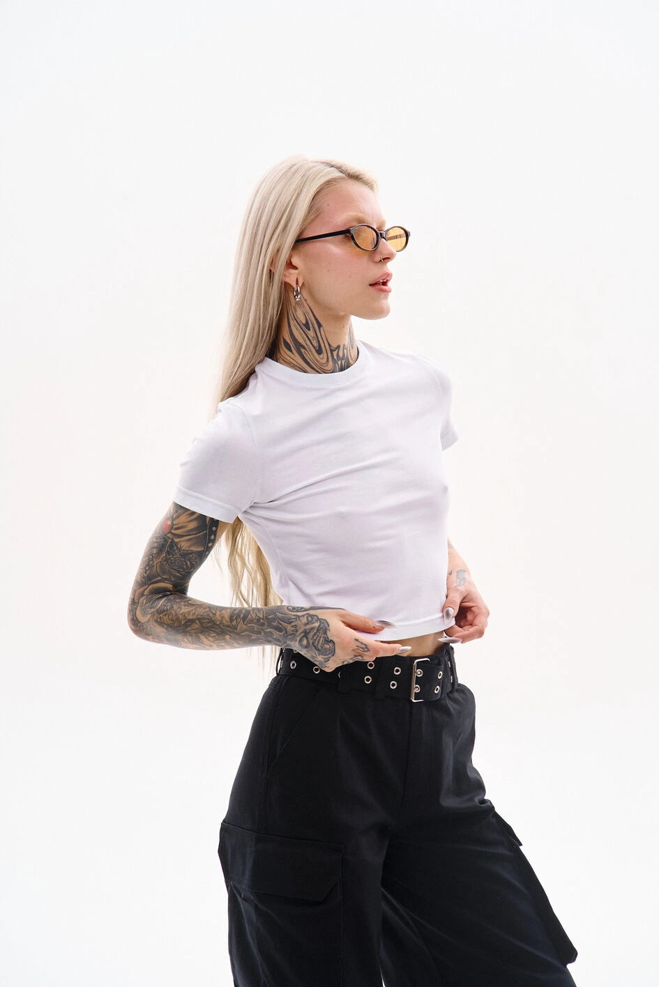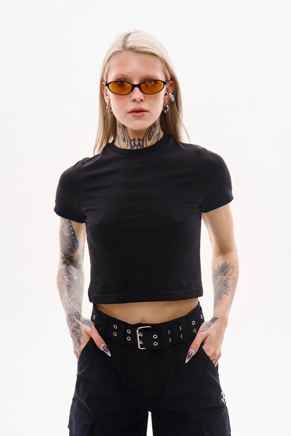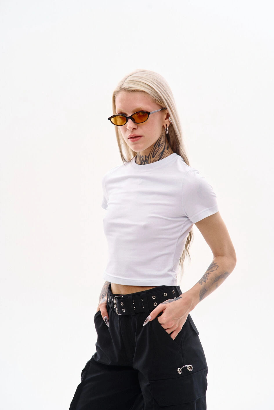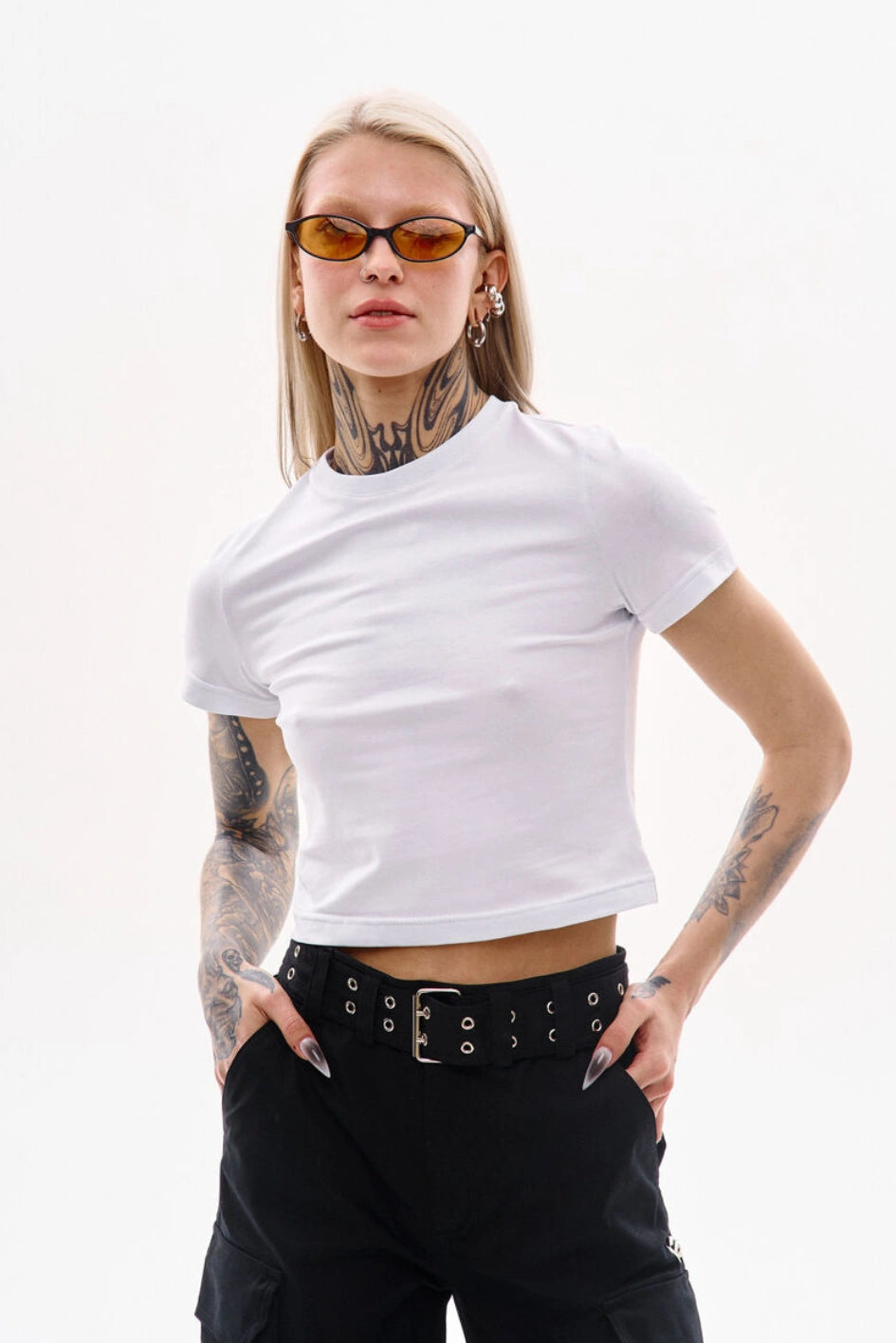 Basic Slim Fit Top mit kurzen Ärmeln. Der Ausschnitt ist gerippt.
