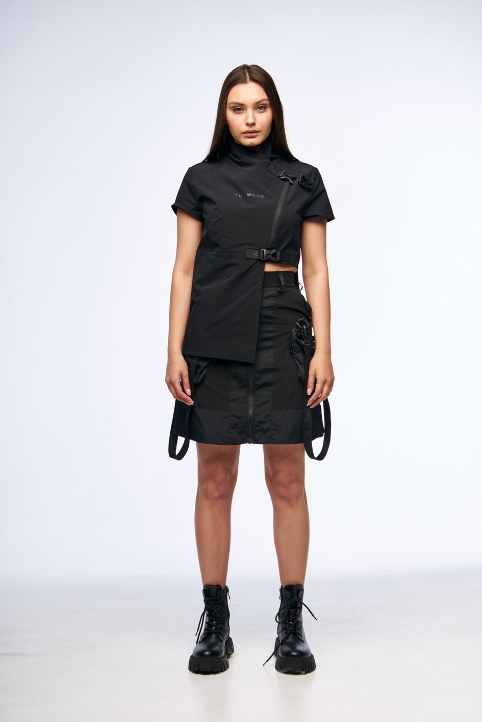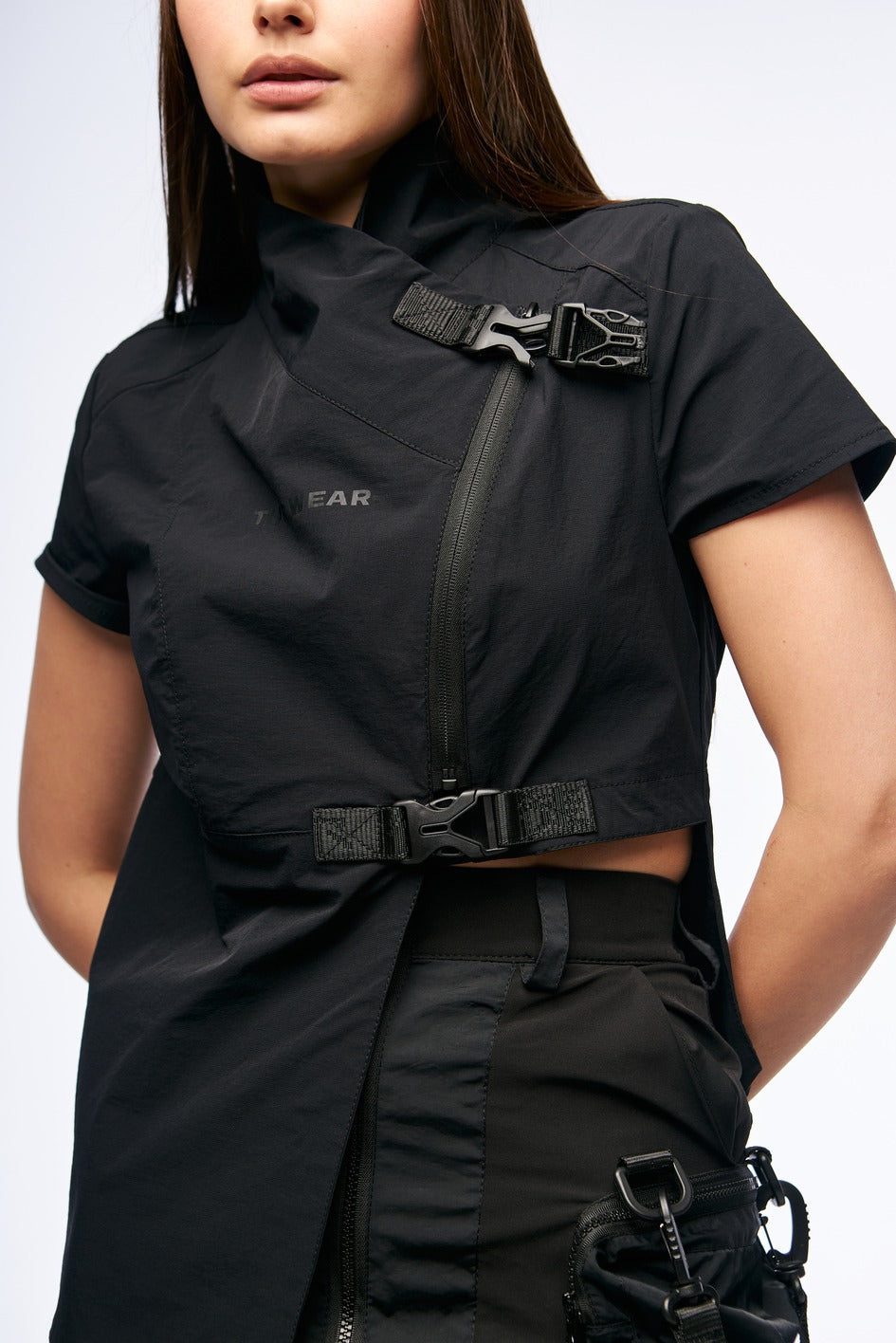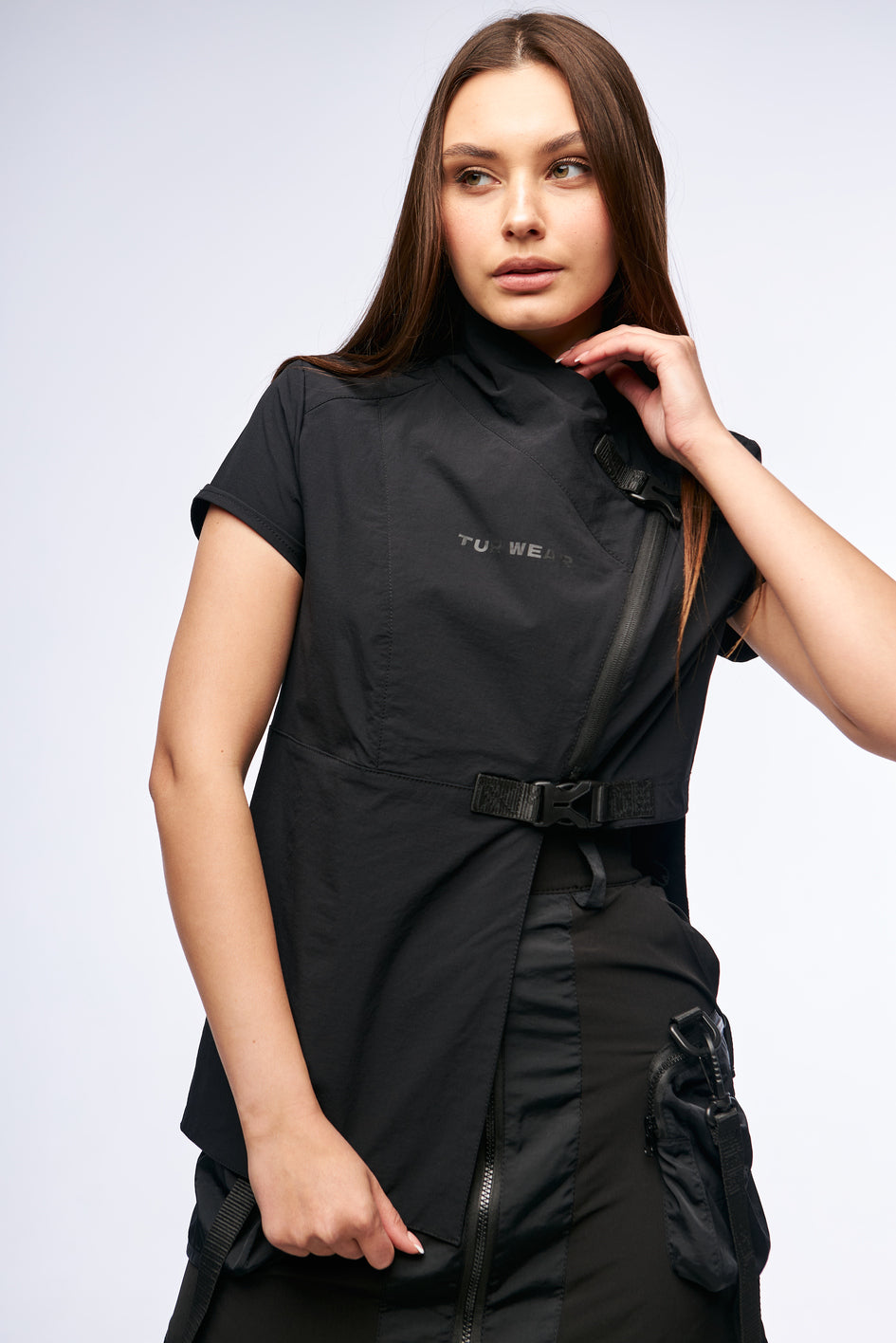 Kimono-Top im asymmetrischen Schnitt, gefertigt aus leichtem 4W-Stretchmaterial. Es wird mit einem Reißverschluss geschlossen und verfügt über zwei dekorative Verschlüsse für zusätzlichen Halt. Die rechte Seite des Produkts ist verlängert, was dem Modell ein originelles Aussehen verleiht. Mit hohem Kragen und kurzen Ärmeln, die Komfort und Stil bieten.