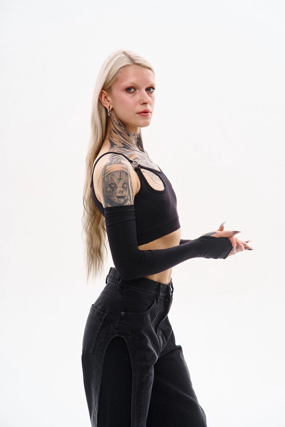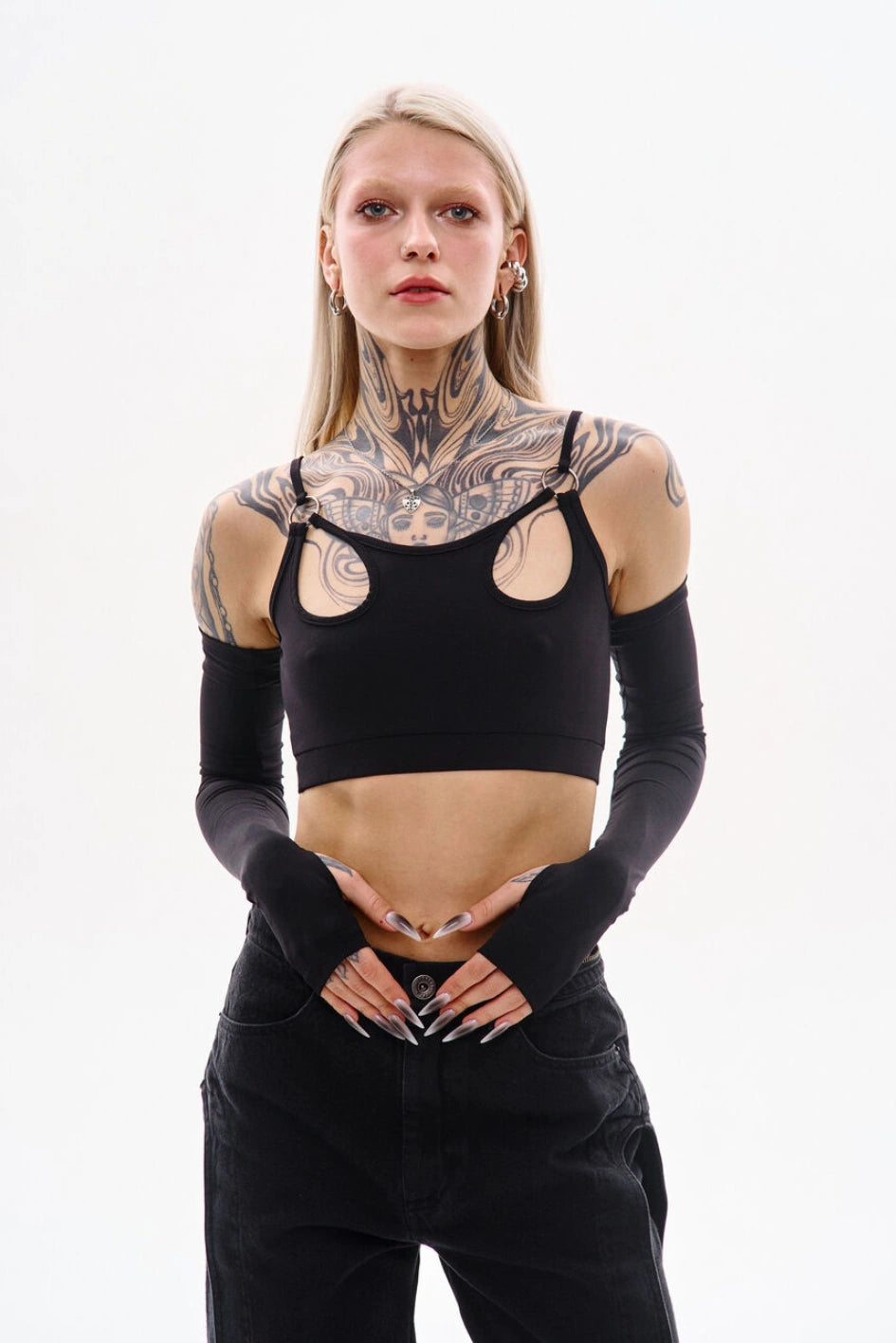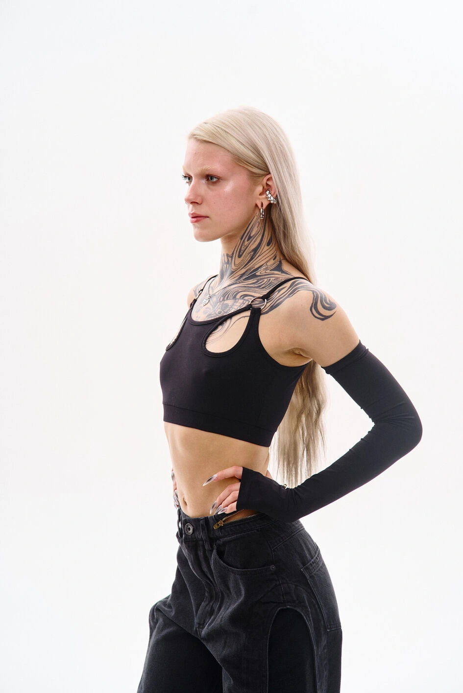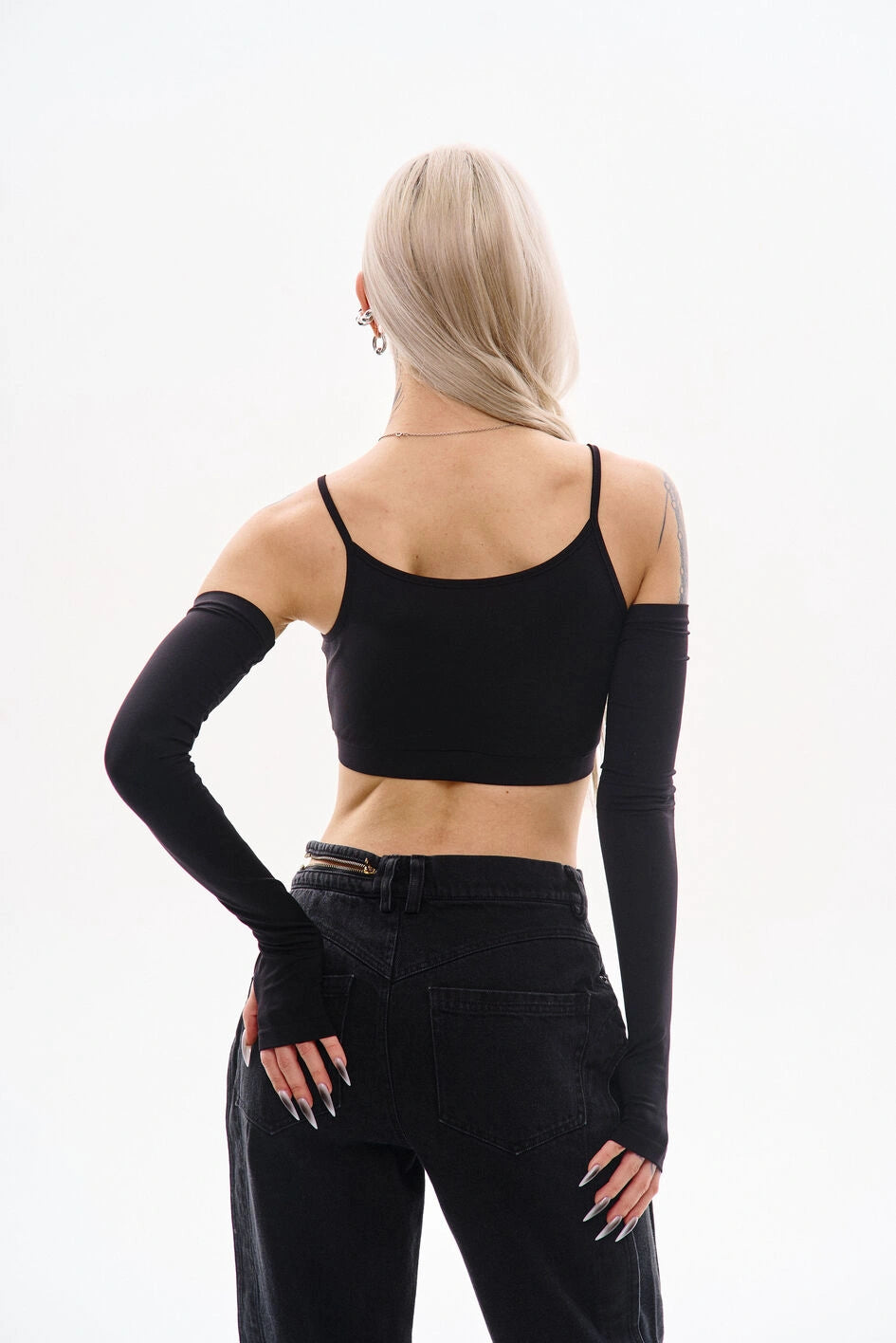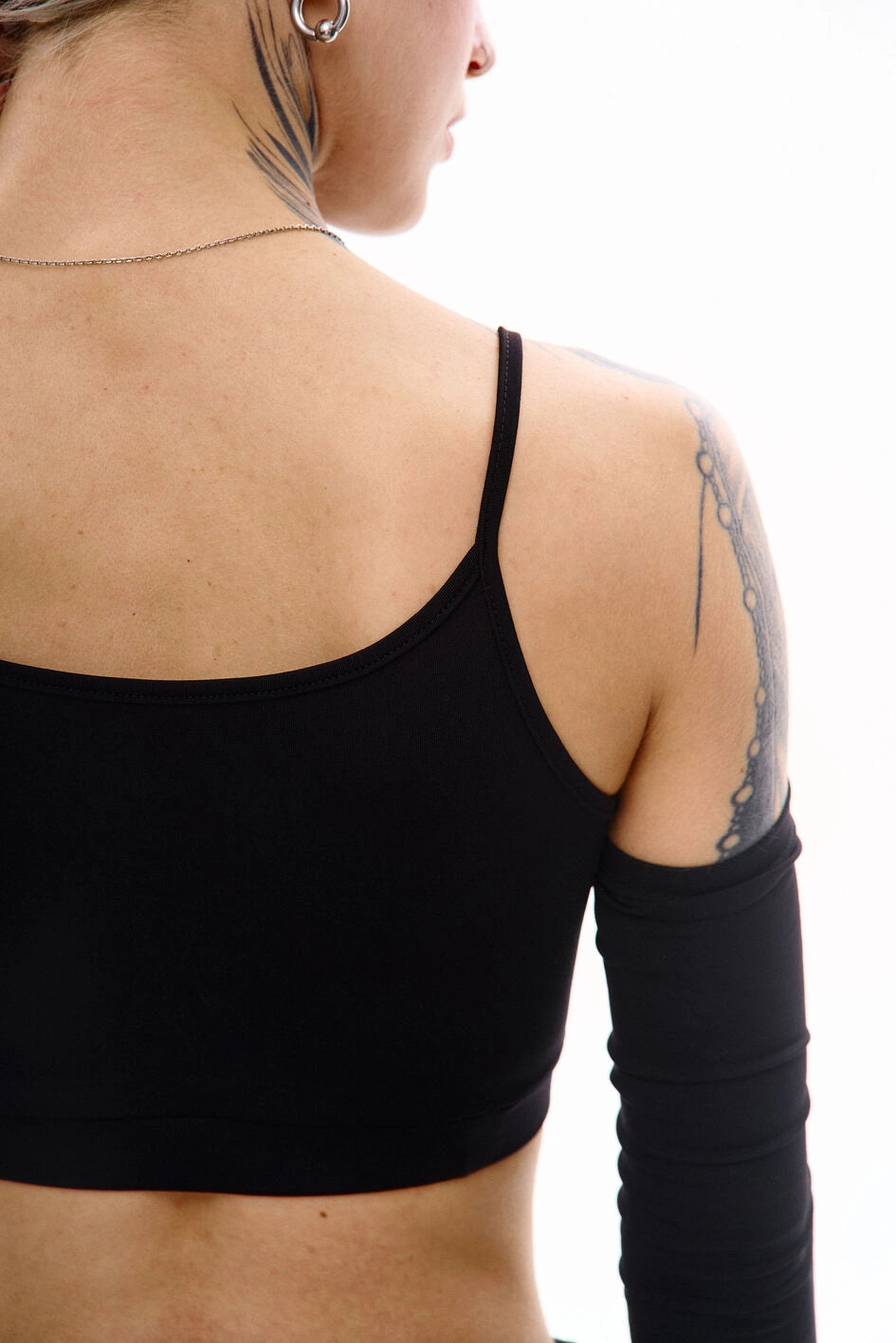 Top mit dünnen Trägern (ähnlich einem Unterhemd), gefertigt aus Polyamid-Kulir. Die Träger sind mit Metallringen befestigt. Zum Set gehören abnehmbare Ärmel mit Daumenöffnung. Ein abnehmbarer Bund mit eingearbeitetem Gummizug sorgt für besseren Halt.