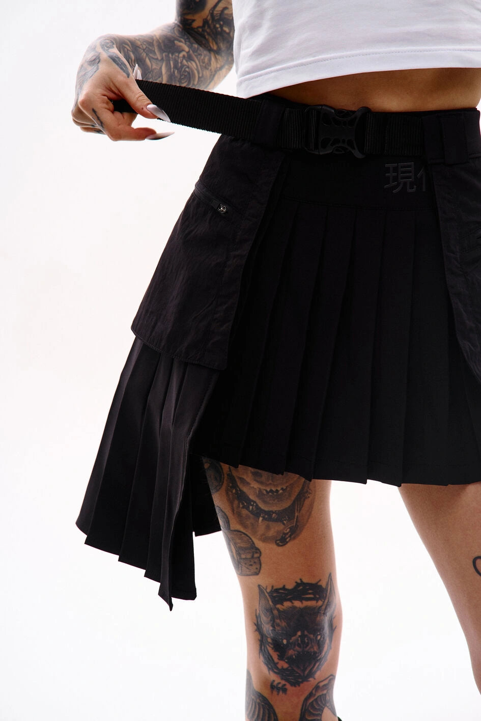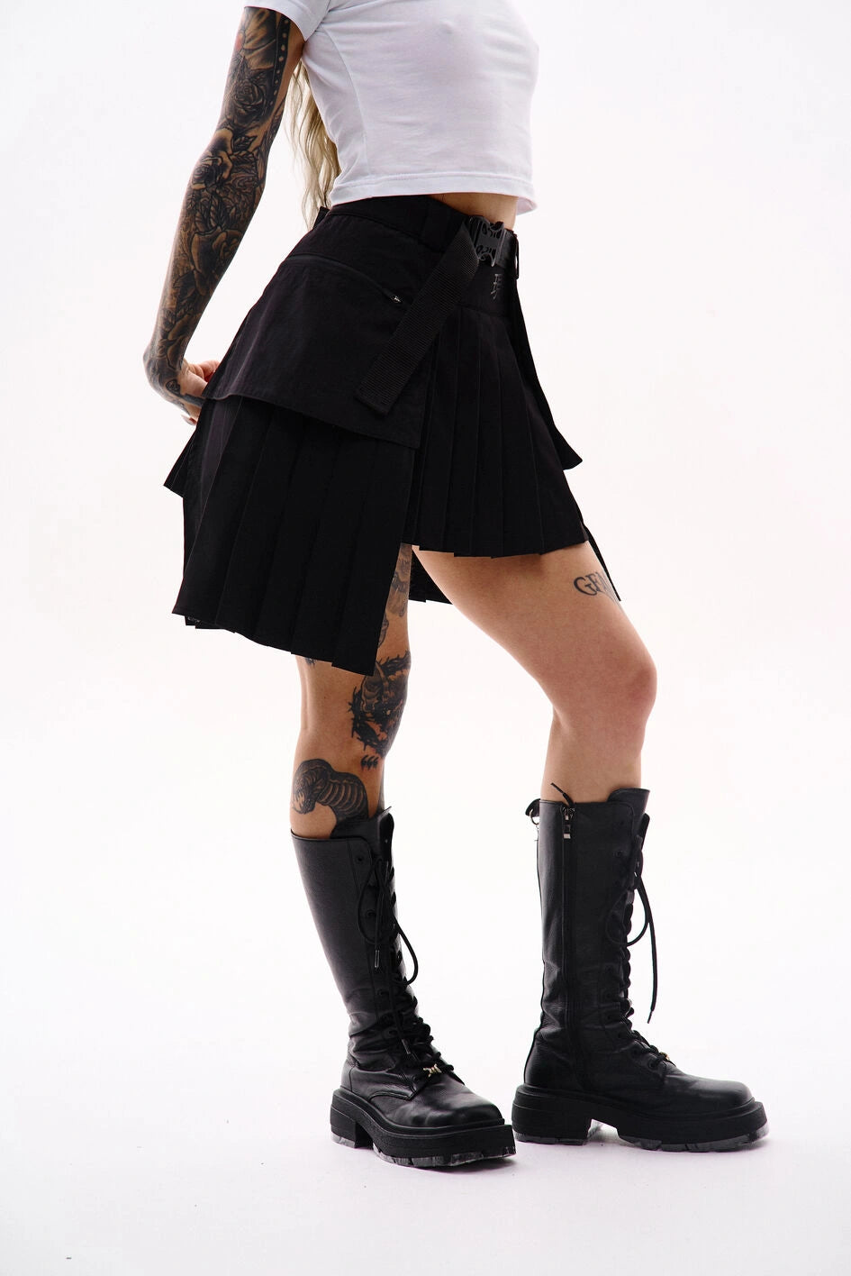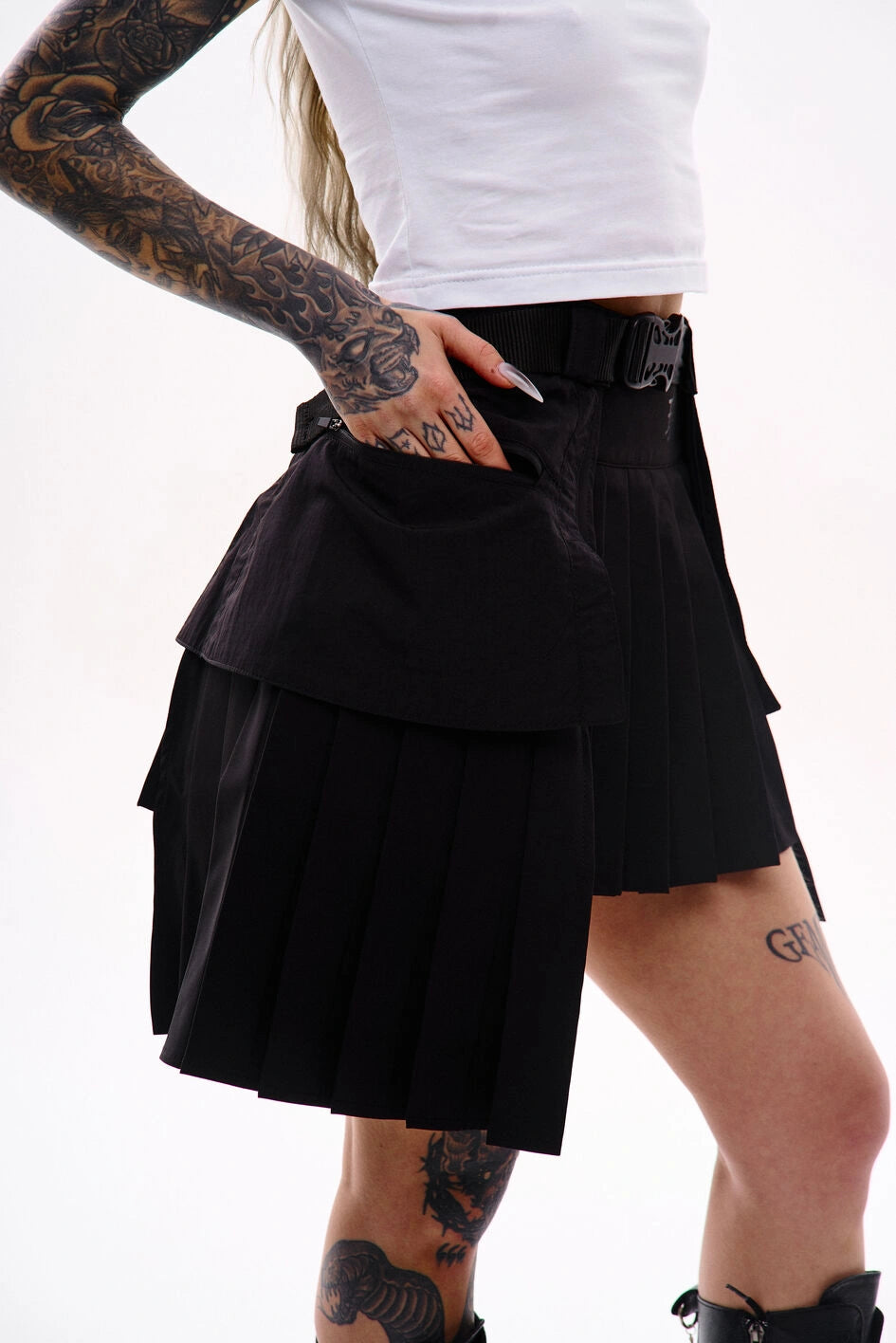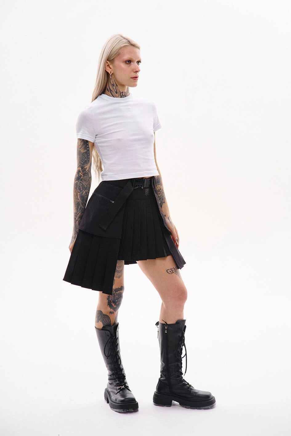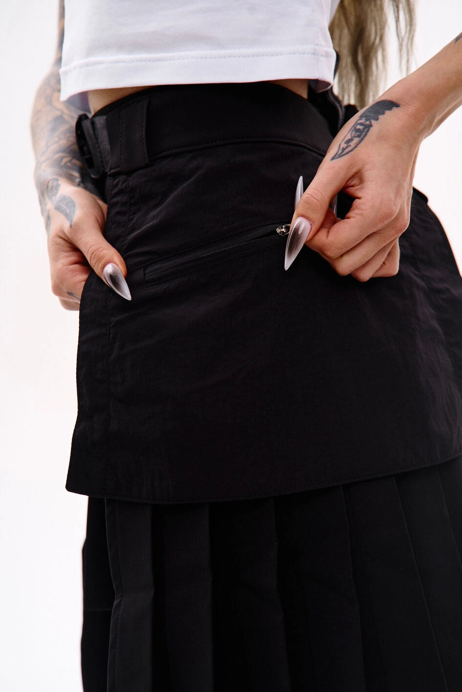 Faltenrock mit Hüftfalten, ausgestattet mit breitem Bund. Im Inneren befindet sich ein Gürtel mit Fastex-Verschluss. An den Seiten zwei Taschen mit Kordelzug, verschließbar mit Spiralreißverschlüssen.