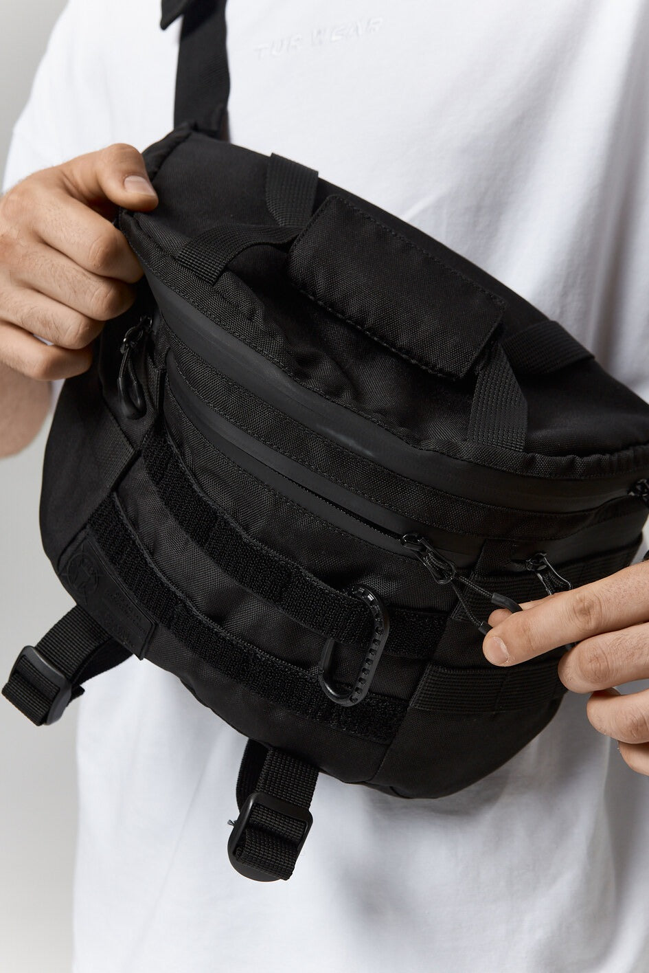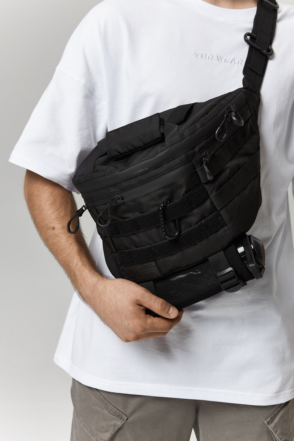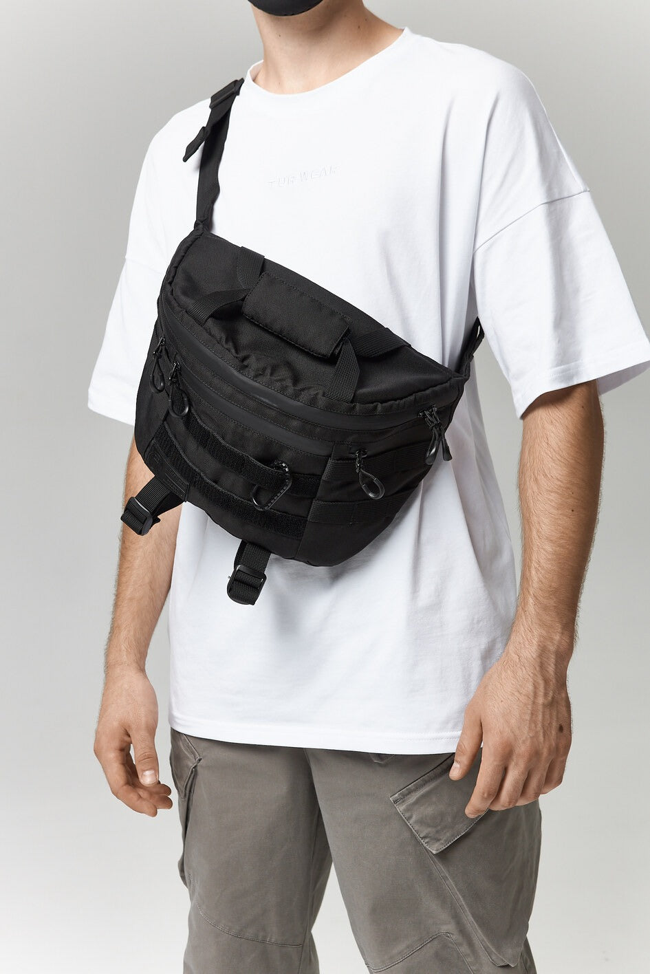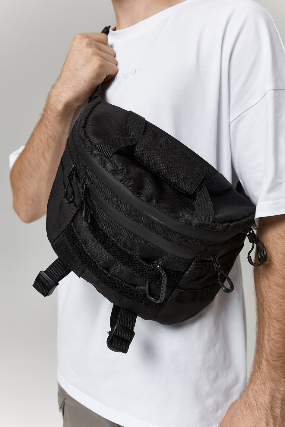 Größere Gürteltasche, die sowohl über der Schulter als auch an der Hüfte getragen werden kann. Sie verfügt über fünf Taschen, ein MOLLE-System an der Vorderseite, einen Karabiner zum Tragen verschiedener Gegenstände. Oben ein mit weichem Stoff verstärkter Griff, unten ein Netzfach zum Tragen einer Flasche.