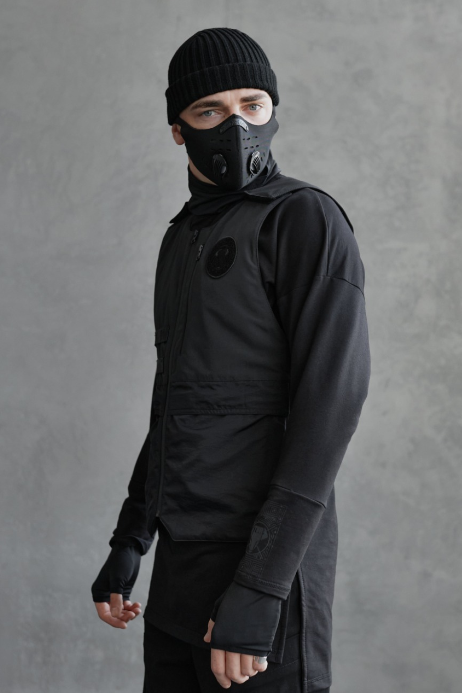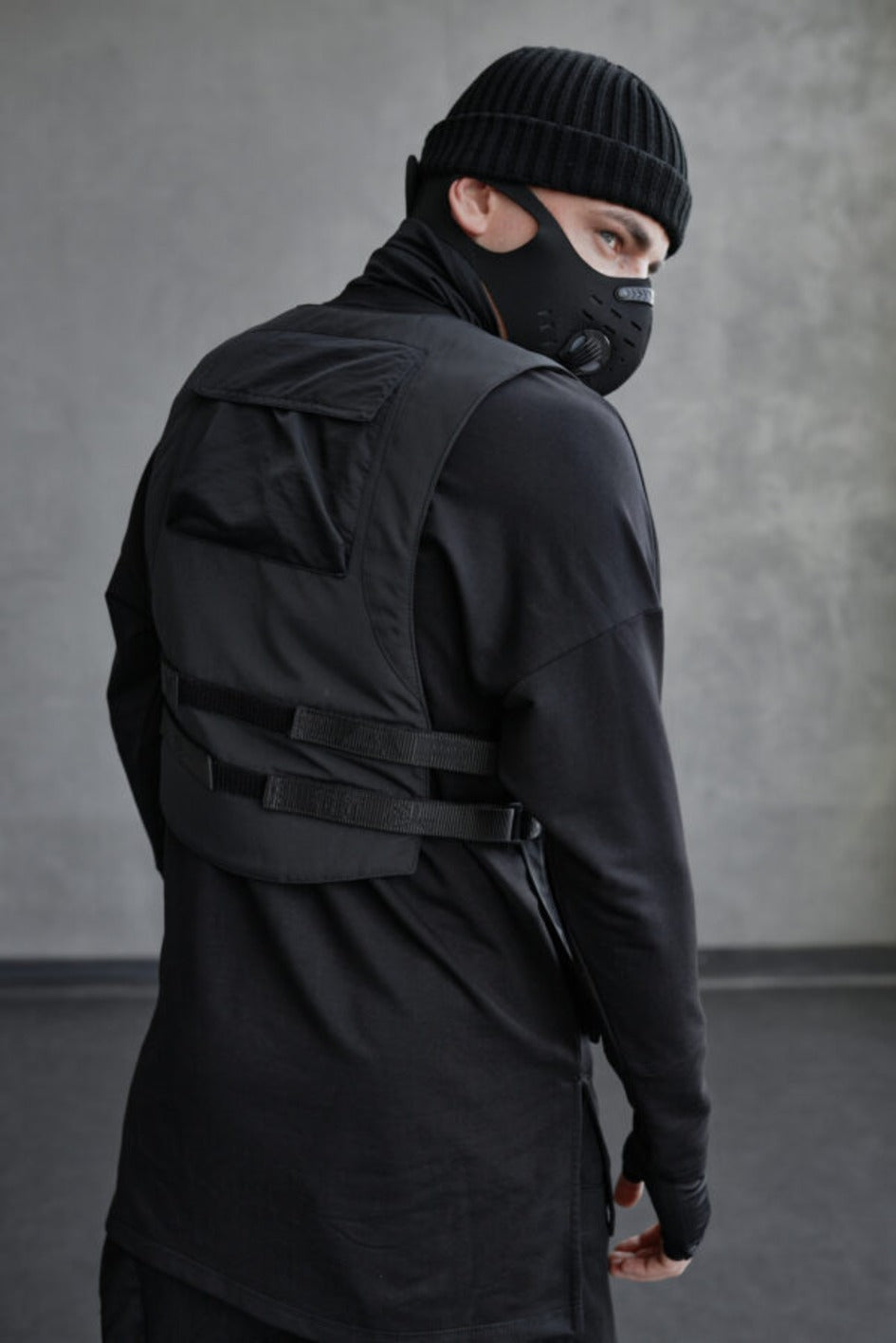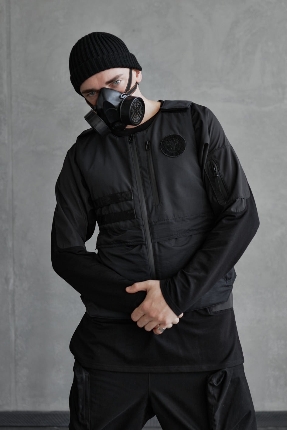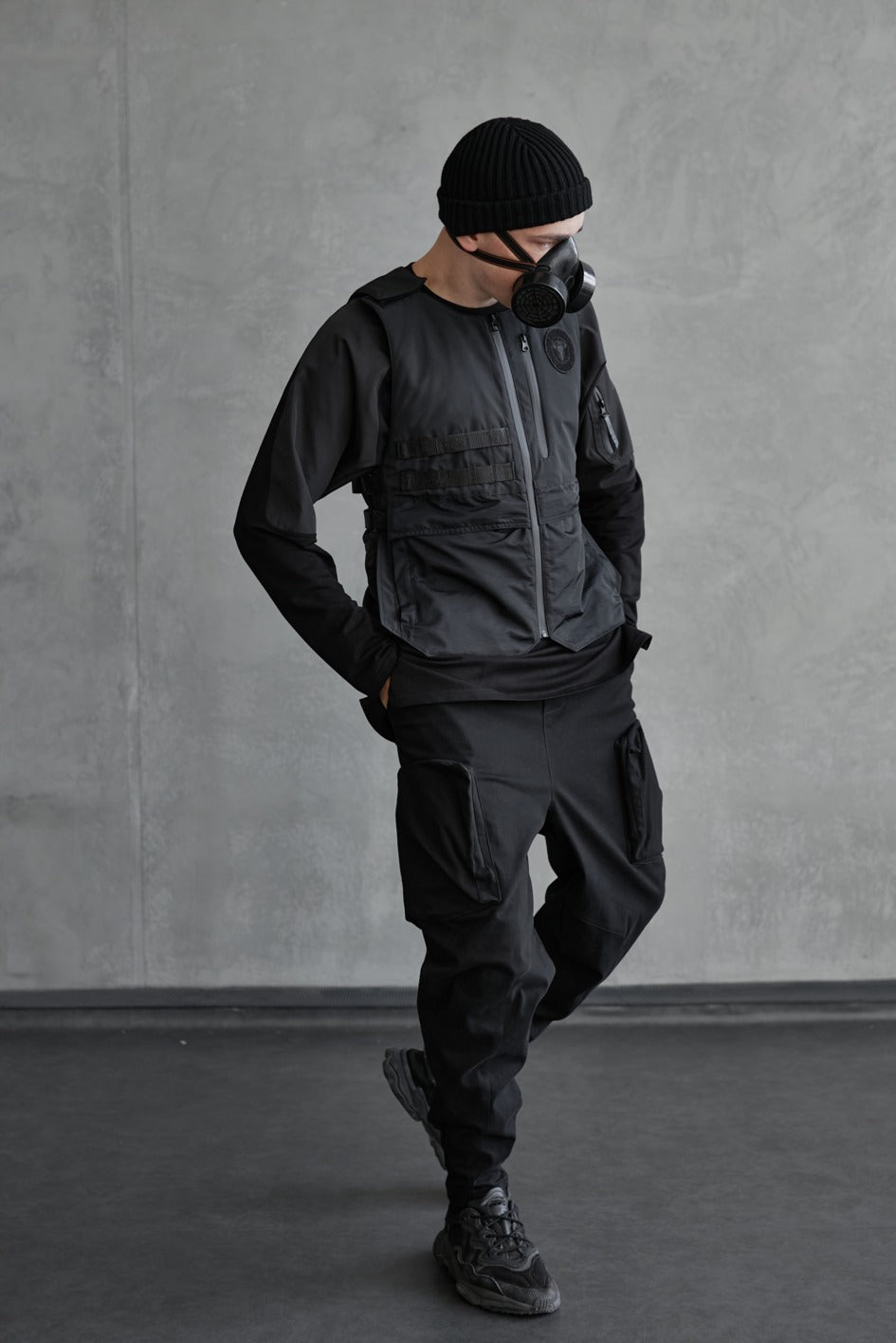 Weste in Einheitsgröße mit Reißverschluss. Vorne drei Taschen, M.O.L.L.E.-System. Auf der Rückseite eine aufgesetzte Tasche aus Ripstop. Innen eine Reißverschlusstasche. Die Weite wird mit markierten Klettverschlüssen reguliert.