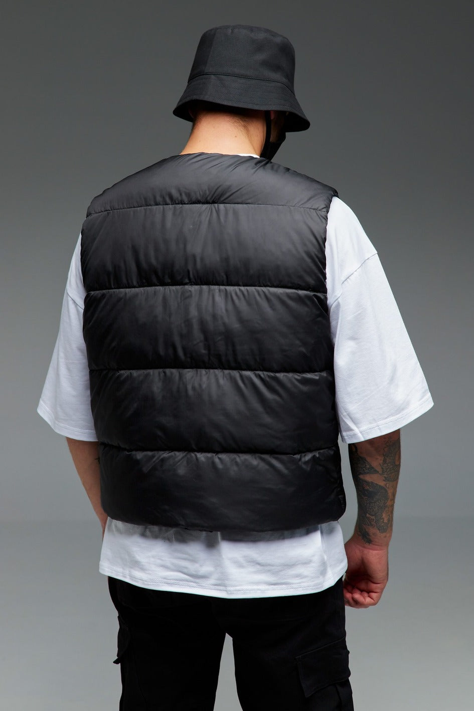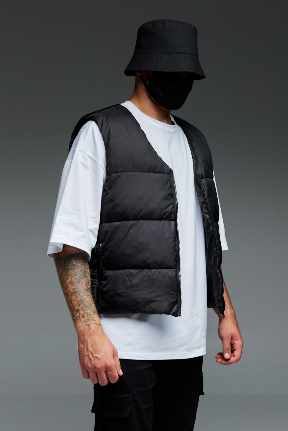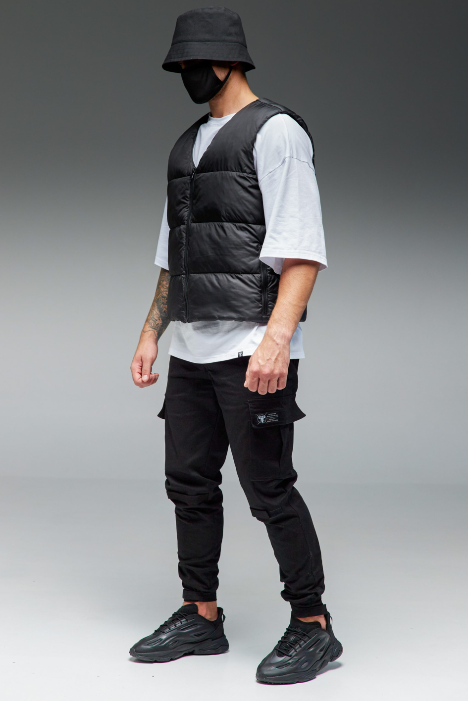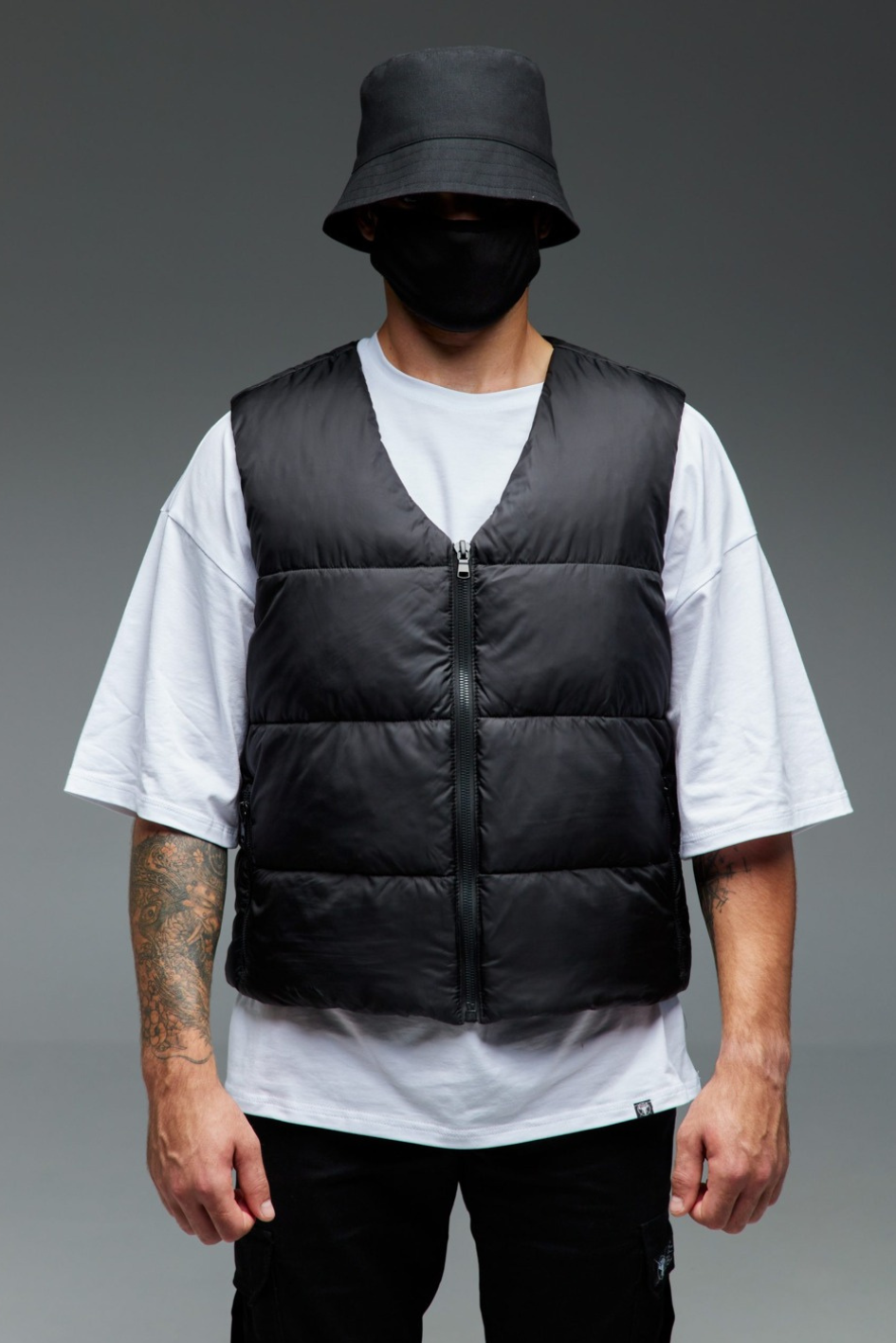 Weste in Einheitsgröße mit hohem Kragen, vorne mit Reißverschluss. An den Seiten befinden sich Reißverschlusstaschen. Innen eine zusätzliche Reißverschlusstasche. Am unteren Saum befindet sich ein Gummizug mit Kordelstoppern für bessere Anpassung.