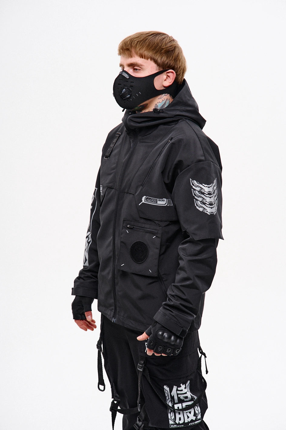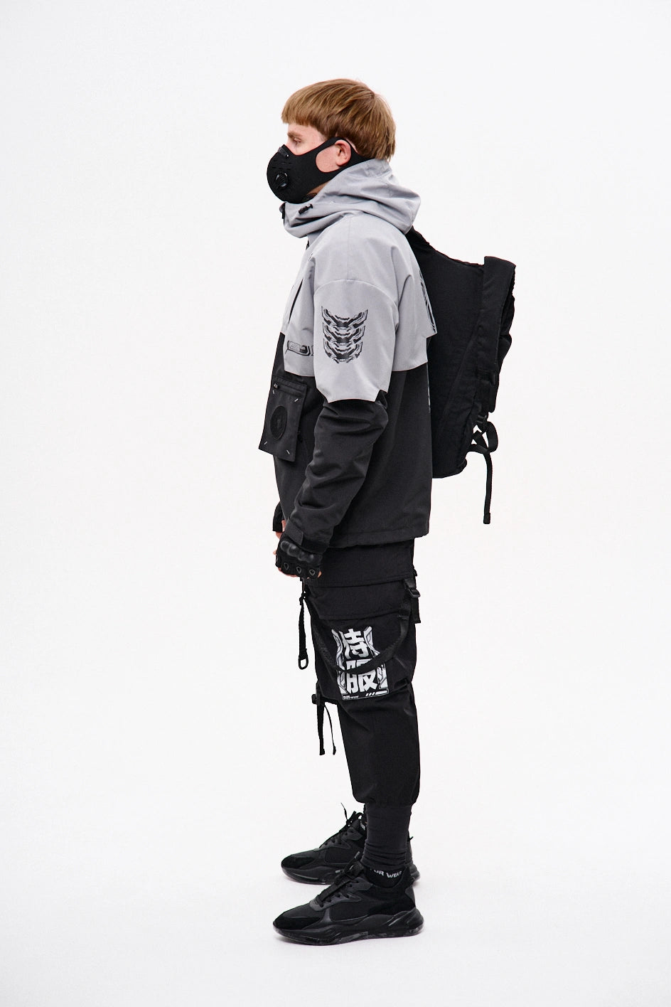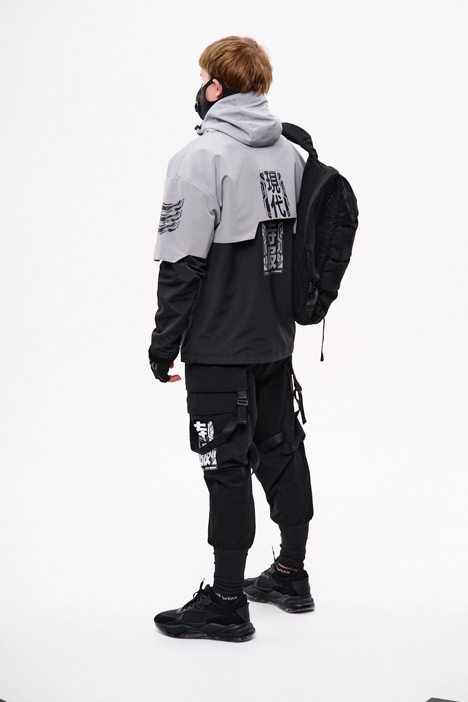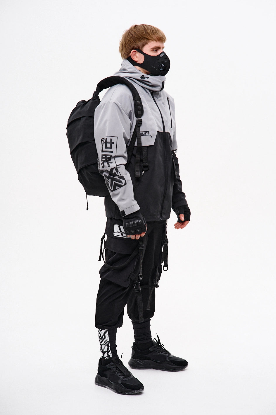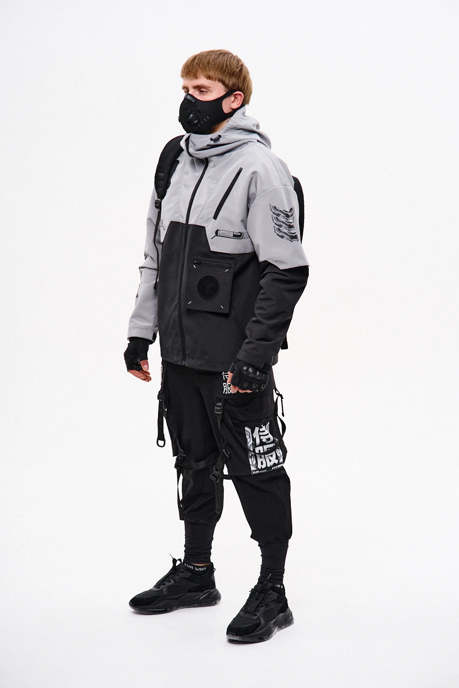Windjacke im klassischen Schnitt mit tiefem, vertikal verstellbarem Kapuzenzug. Auf Ärmel und Brust aufgesetzte Elemente, links – Reißverschlusstasche. Rechts – teilweise verdecktes Band mit Halbring zum Befestigen von Schlüsselanhängern oder Magazintaschen; standardmäßig mit firmeneigenem Schlüsselband ausgestattet. Zwei untere Reißverschlusstaschen, Saumregulierung mit elastischem Kordelzug. Auf der linken Vorderseite – abnehmbare Tasche mit Reißverschluss, Print und Velcro-Paneel für Patches. Manschetten mit Klettverschluss regulierbar. Innen mit weichem Stoff und Belüftungsnetz ausgekleidet. Zwei Innentaschen mit Reißverschluss. Insgesamt 7 Prints im Cyberpunk-Stil. Hauptstoff – dichter, weichgriffiger Nylonstoff (Ortalion).