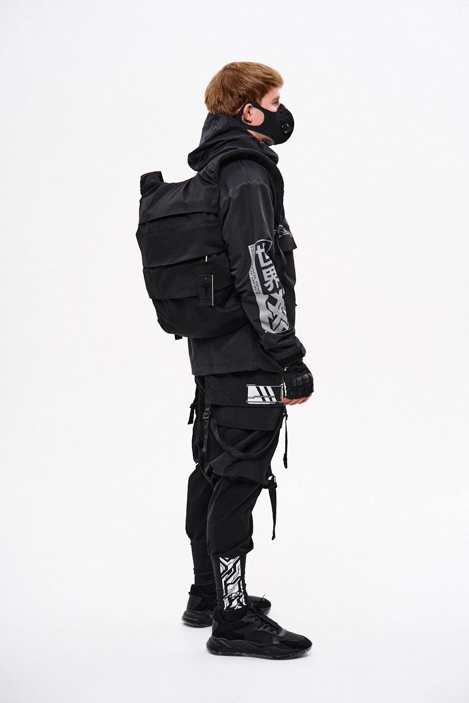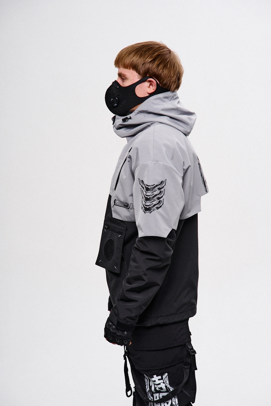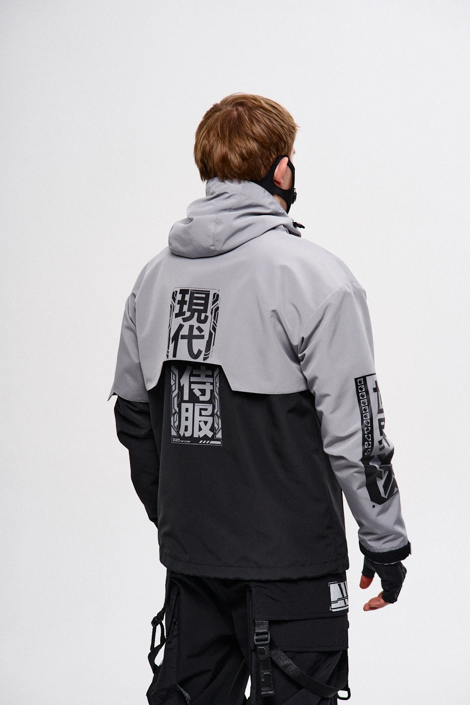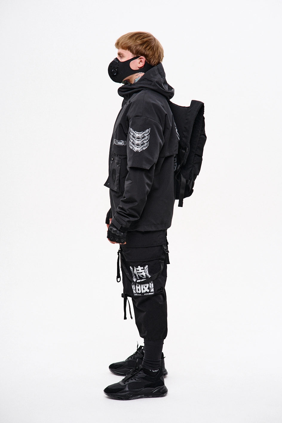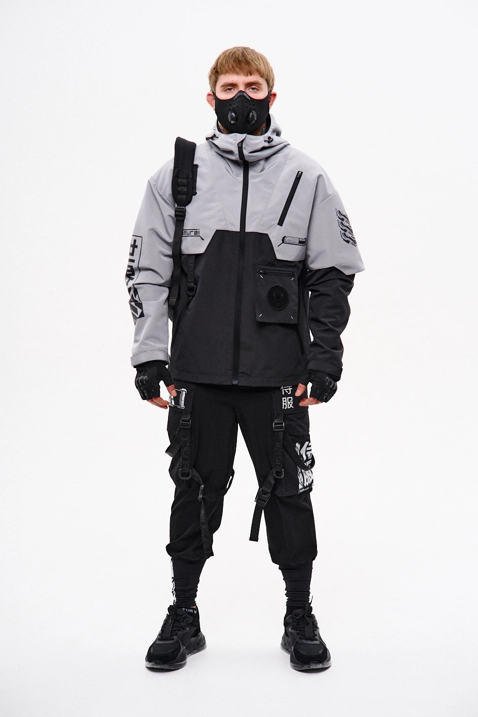 Windjacke im klassischen Schnitt mit tiefem, vertikal verstellbarem Kapuzenzug. Auf Ärmel und Brust aufgesetzte Elemente, links – Reißverschlusstasche. Rechts – teilweise verdecktes Band mit Halbring zum Befestigen von Schlüsselanhängern oder Magazintaschen; standardmäßig mit firmeneigenem Schlüsselband ausgestattet. Zwei untere Reißverschlusstaschen, Saumregulierung mit elastischem Kordelzug. Auf der linken Vorderseite – abnehmbare Tasche mit Reißverschluss, Print und Velcro-Paneel für Patches. Manschetten mit Klettverschluss regulierbar. Innen mit weichem Stoff und Belüftungsnetz ausgekleidet. Zwei Innentaschen mit Reißverschluss. Insgesamt 7 Prints im Cyberpunk-Stil. Hauptstoff – dichter, weichgriffiger Nylonstoff (Ortalion).