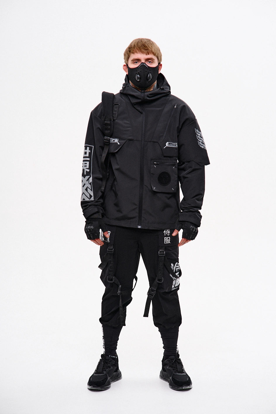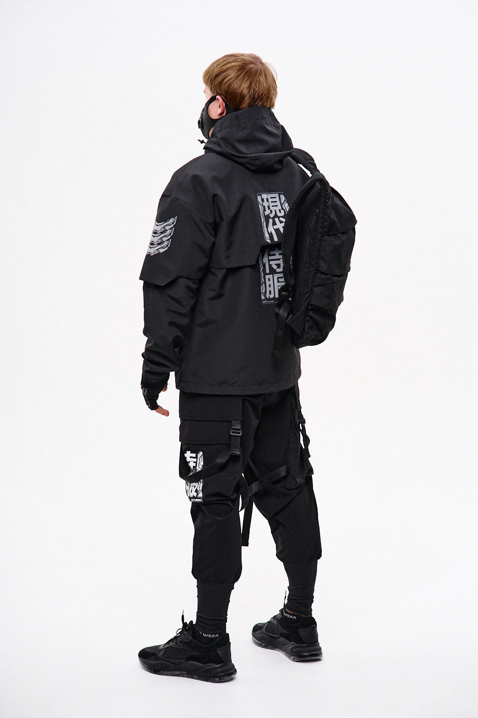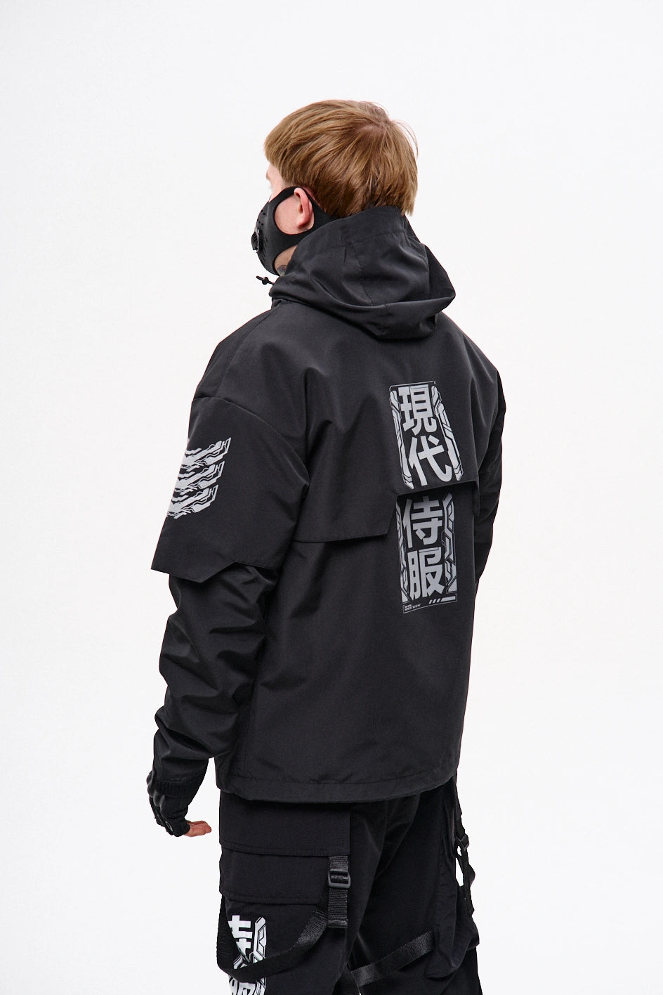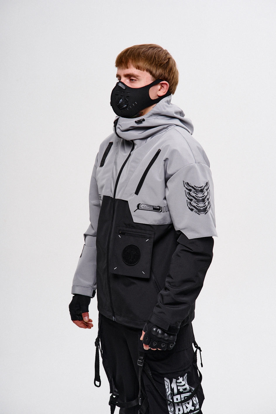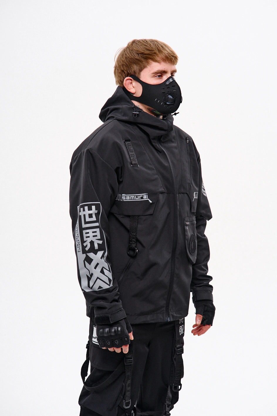Windjacke im klassischen Schnitt mit tiefem, vertikal verstellbarem Kapuzenzug. Auf Ärmel und Brust aufgesetzte Elemente, links – Reißverschlusstasche. Rechts – teilweise verdecktes Band mit Halbring zum Befestigen von Schlüsselanhängern oder Magazintaschen; standardmäßig mit firmeneigenem Schlüsselband ausgestattet. Zwei untere Reißverschlusstaschen, Saumregulierung mit elastischem Kordelzug. Auf der linken Vorderseite – abnehmbare Tasche mit Reißverschluss, Print und Velcro-Paneel für Patches. Manschetten mit Klettverschluss regulierbar. Innen mit weichem Stoff und Belüftungsnetz ausgekleidet. Zwei Innentaschen mit Reißverschluss. Insgesamt 7 Prints im Cyberpunk-Stil. Hauptstoff – dichter, weichgriffiger Nylonstoff (Ortalion).