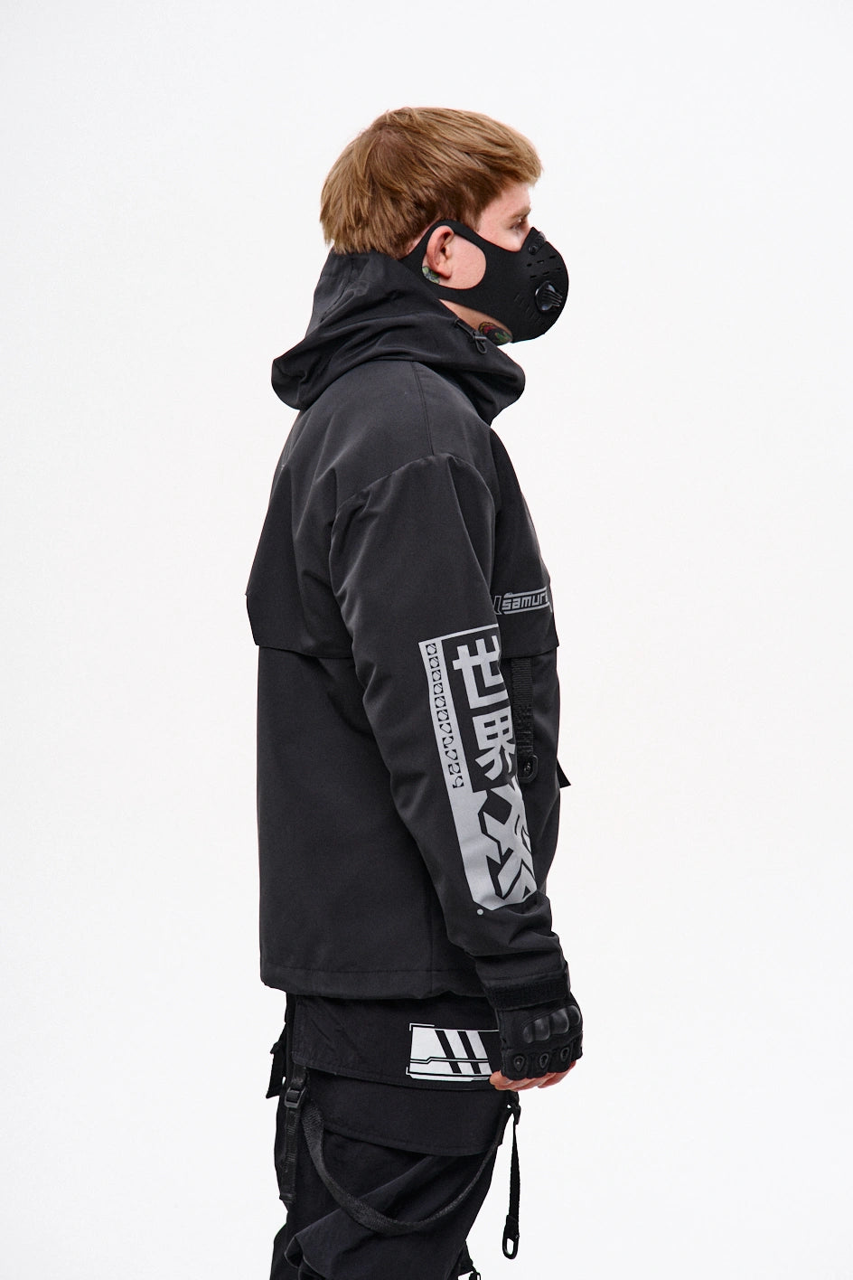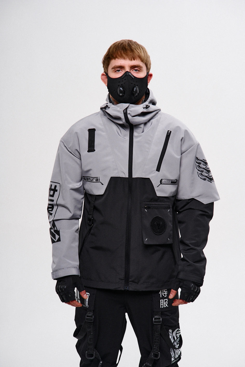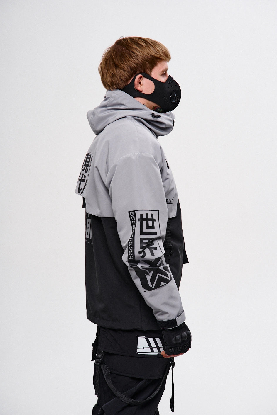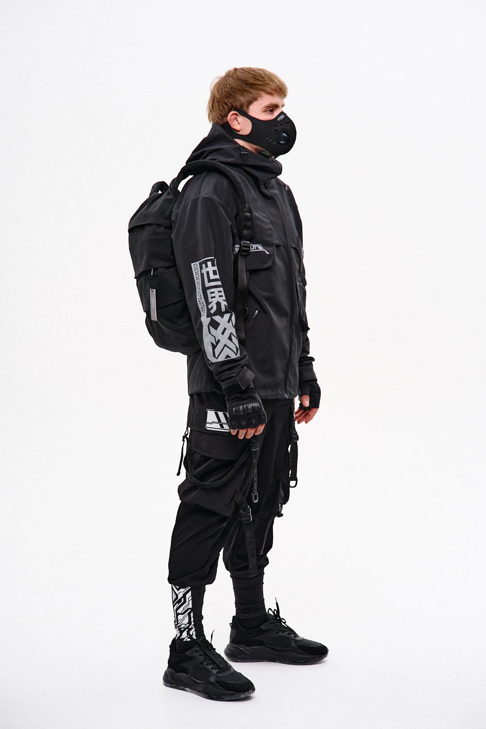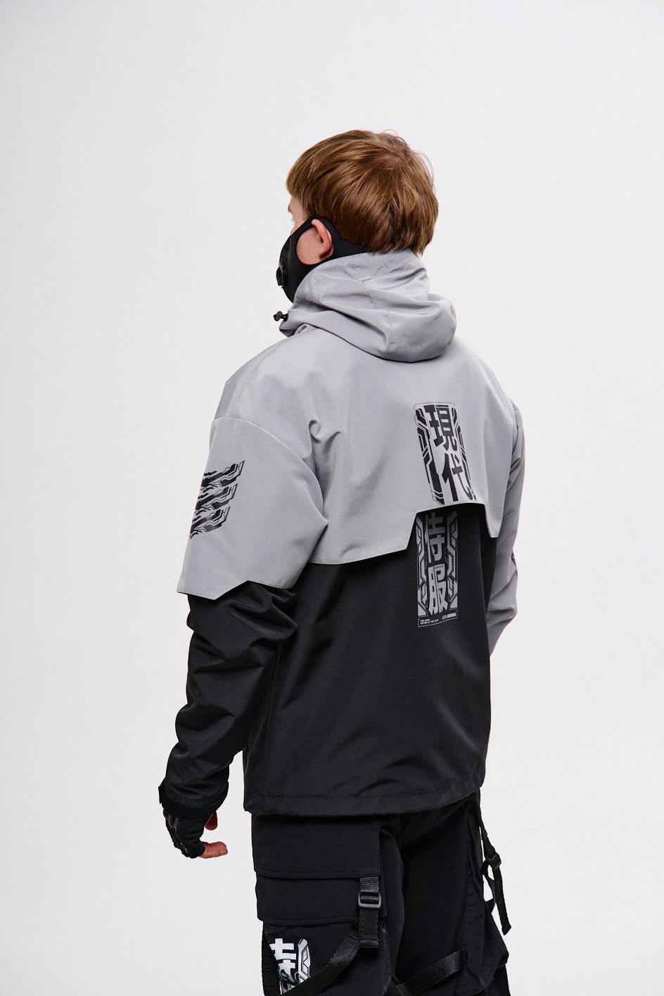 Windjacke im klassischen Schnitt mit tiefem, vertikal verstellbarem Kapuzenzug. Auf Ärmel und Brust aufgesetzte Elemente, links – Reißverschlusstasche. Rechts – teilweise verdecktes Band mit Halbring zum Befestigen von Schlüsselanhängern oder Magazintaschen; standardmäßig mit firmeneigenem Schlüsselband ausgestattet. Zwei untere Reißverschlusstaschen, Saumregulierung mit elastischem Kordelzug. Auf der linken Vorderseite – abnehmbare Tasche mit Reißverschluss, Print und Velcro-Paneel für Patches. Manschetten mit Klettverschluss regulierbar. Innen mit weichem Stoff und Belüftungsnetz ausgekleidet. Zwei Innentaschen mit Reißverschluss. Insgesamt 7 Prints im Cyberpunk-Stil. Hauptstoff – dichter, weichgriffiger Nylonstoff (Ortalion).