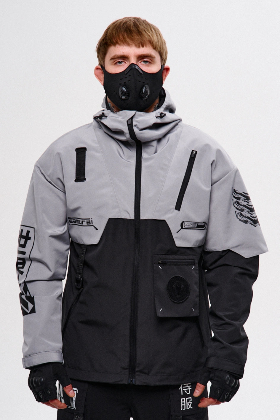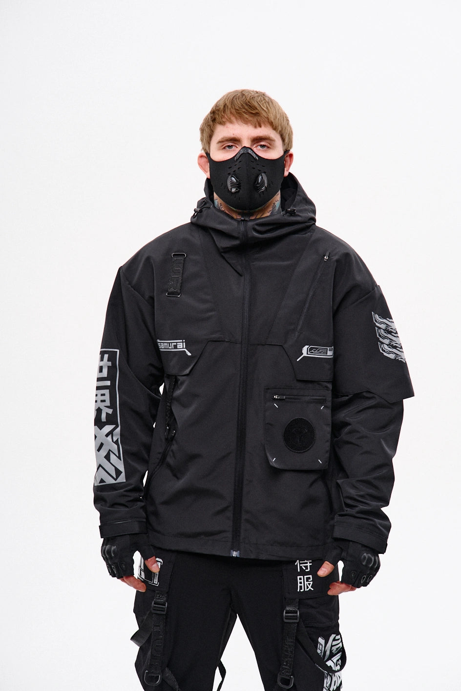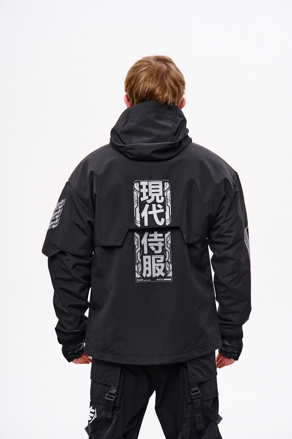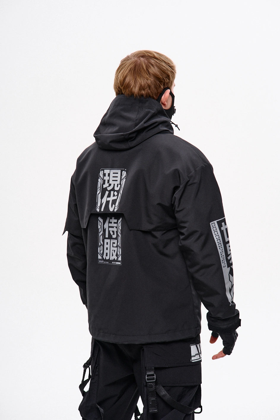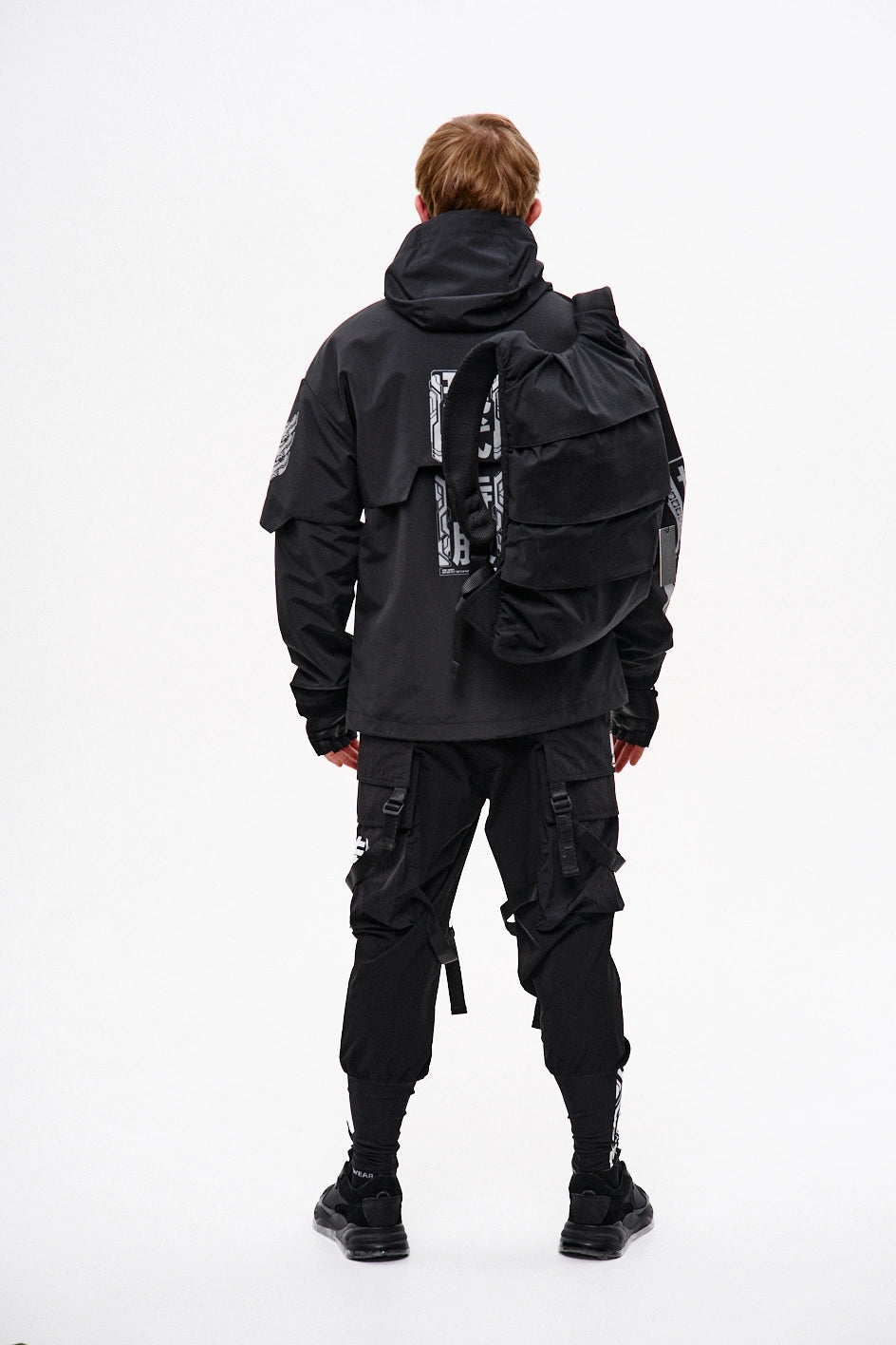 Windjacke im klassischen Schnitt mit tiefem, vertikal verstellbarem Kapuzenzug. Auf Ärmel und Brust aufgesetzte Elemente, links – Reißverschlusstasche. Rechts – teilweise verdecktes Band mit Halbring zum Befestigen von Schlüsselanhängern oder Magazintaschen; standardmäßig mit firmeneigenem Schlüsselband ausgestattet. Zwei untere Reißverschlusstaschen, Saumregulierung mit elastischem Kordelzug. Auf der linken Vorderseite – abnehmbare Tasche mit Reißverschluss, Print und Velcro-Paneel für Patches. Manschetten mit Klettverschluss regulierbar. Innen mit weichem Stoff und Belüftungsnetz ausgekleidet. Zwei Innentaschen mit Reißverschluss. Insgesamt 7 Prints im Cyberpunk-Stil. Hauptstoff – dichter, weichgriffiger Nylonstoff (Ortalion).
