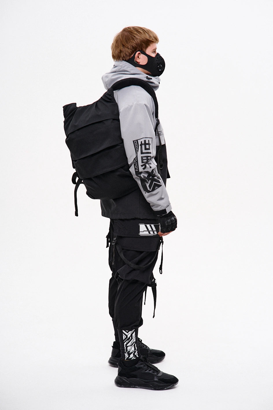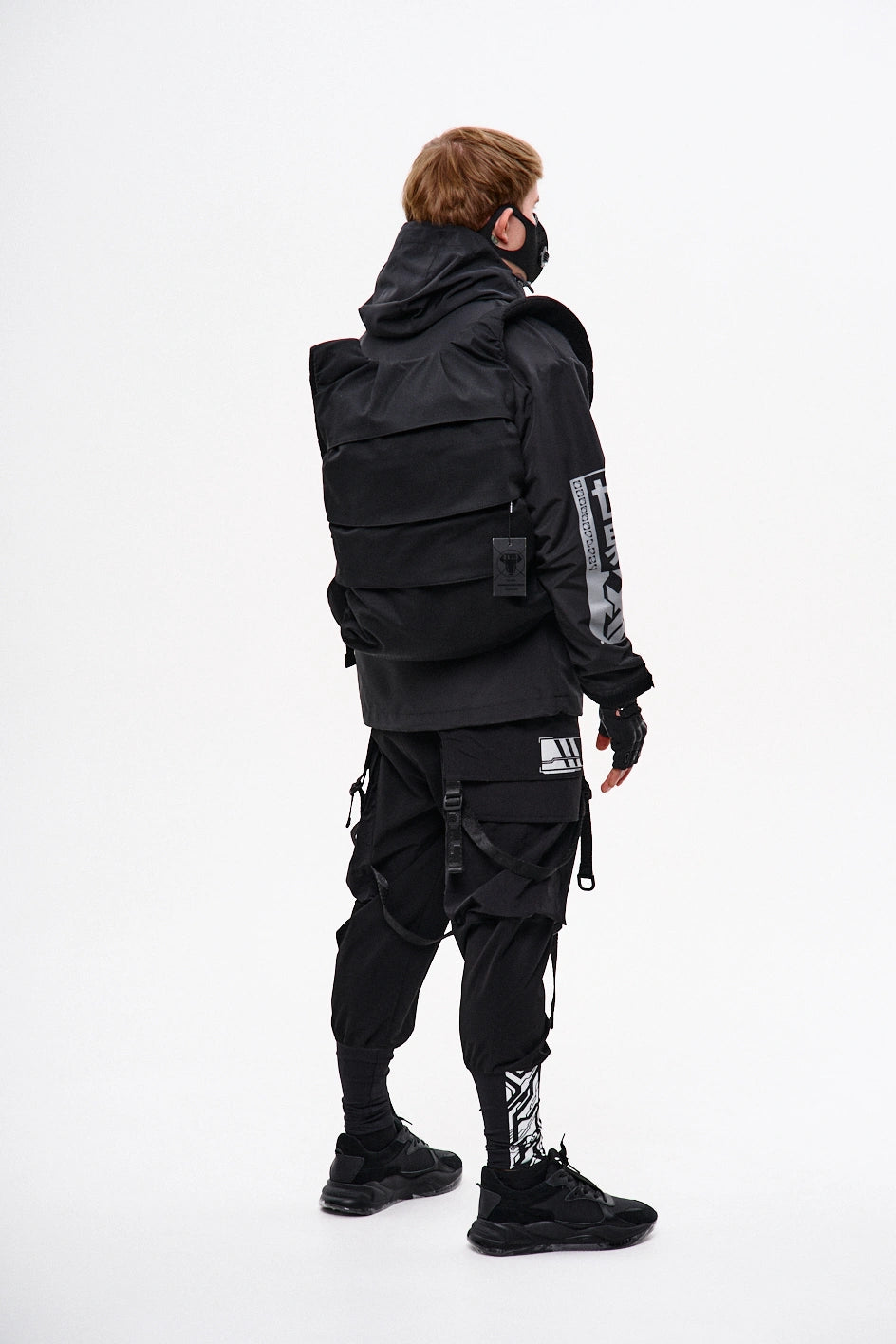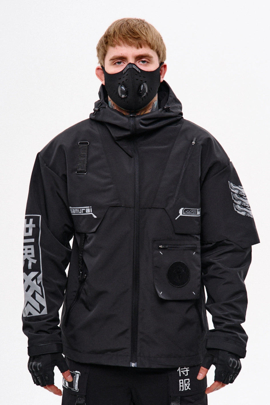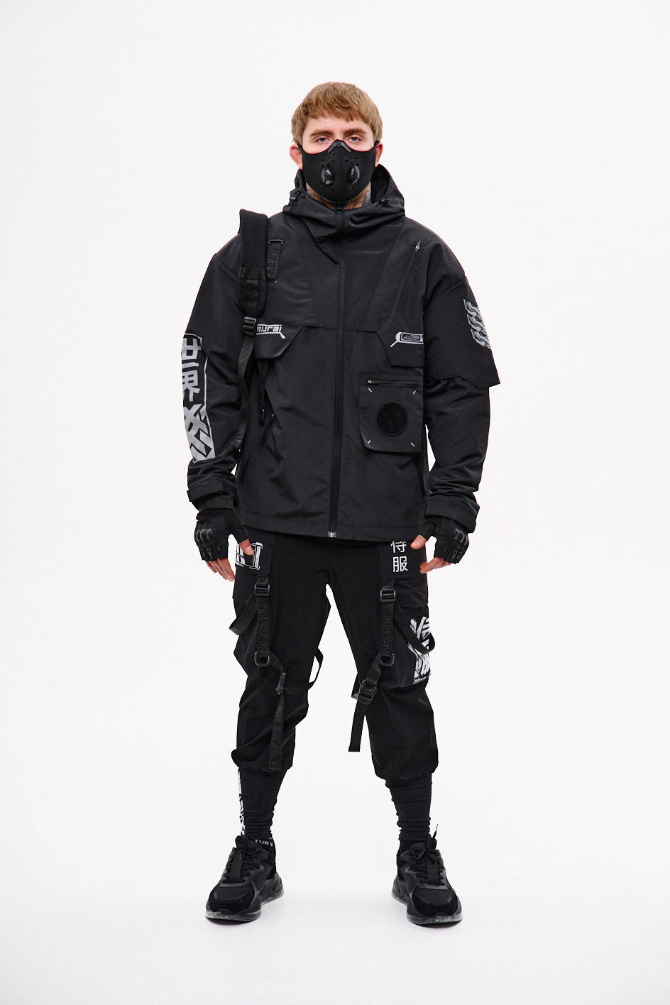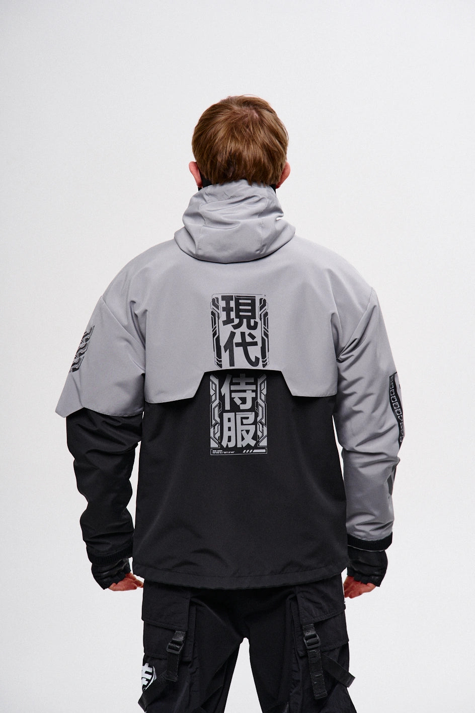 Windjacke im klassischen Schnitt mit tiefem, vertikal verstellbarem Kapuzenzug. Auf Ärmel und Brust aufgesetzte Elemente, links – Reißverschlusstasche. Rechts – teilweise verdecktes Band mit Halbring zum Befestigen von Schlüsselanhängern oder Magazintaschen; standardmäßig mit firmeneigenem Schlüsselband ausgestattet. Zwei untere Reißverschlusstaschen, Saumregulierung mit elastischem Kordelzug. Auf der linken Vorderseite – abnehmbare Tasche mit Reißverschluss, Print und Velcro-Paneel für Patches. Manschetten mit Klettverschluss regulierbar. Innen mit weichem Stoff und Belüftungsnetz ausgekleidet. Zwei Innentaschen mit Reißverschluss. Insgesamt 7 Prints im Cyberpunk-Stil. Hauptstoff – dichter, weichgriffiger Nylonstoff (Ortalion).