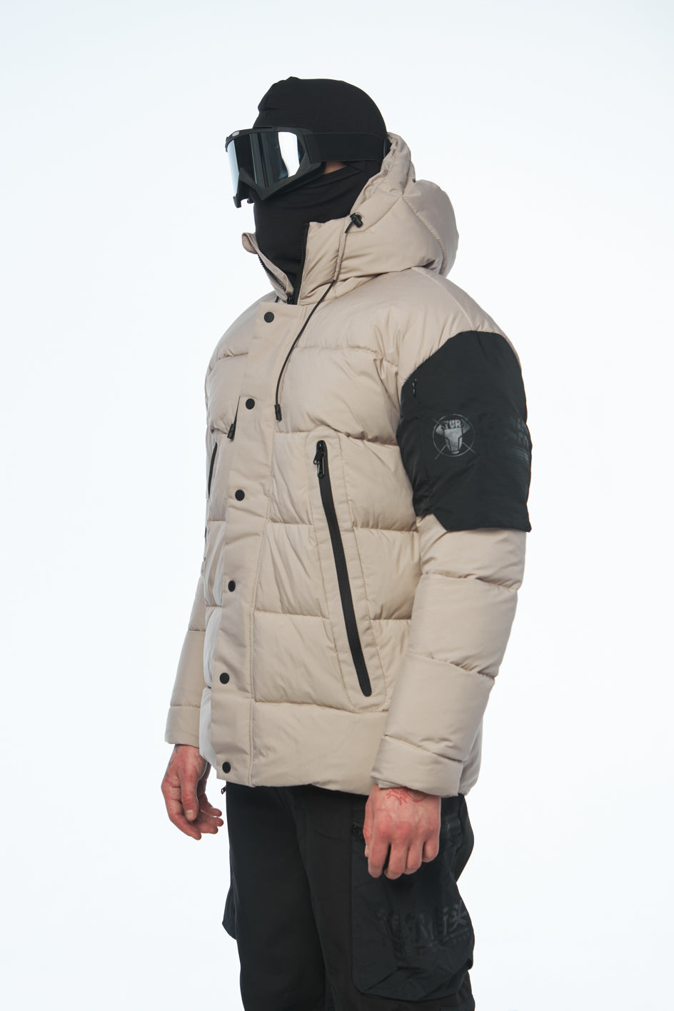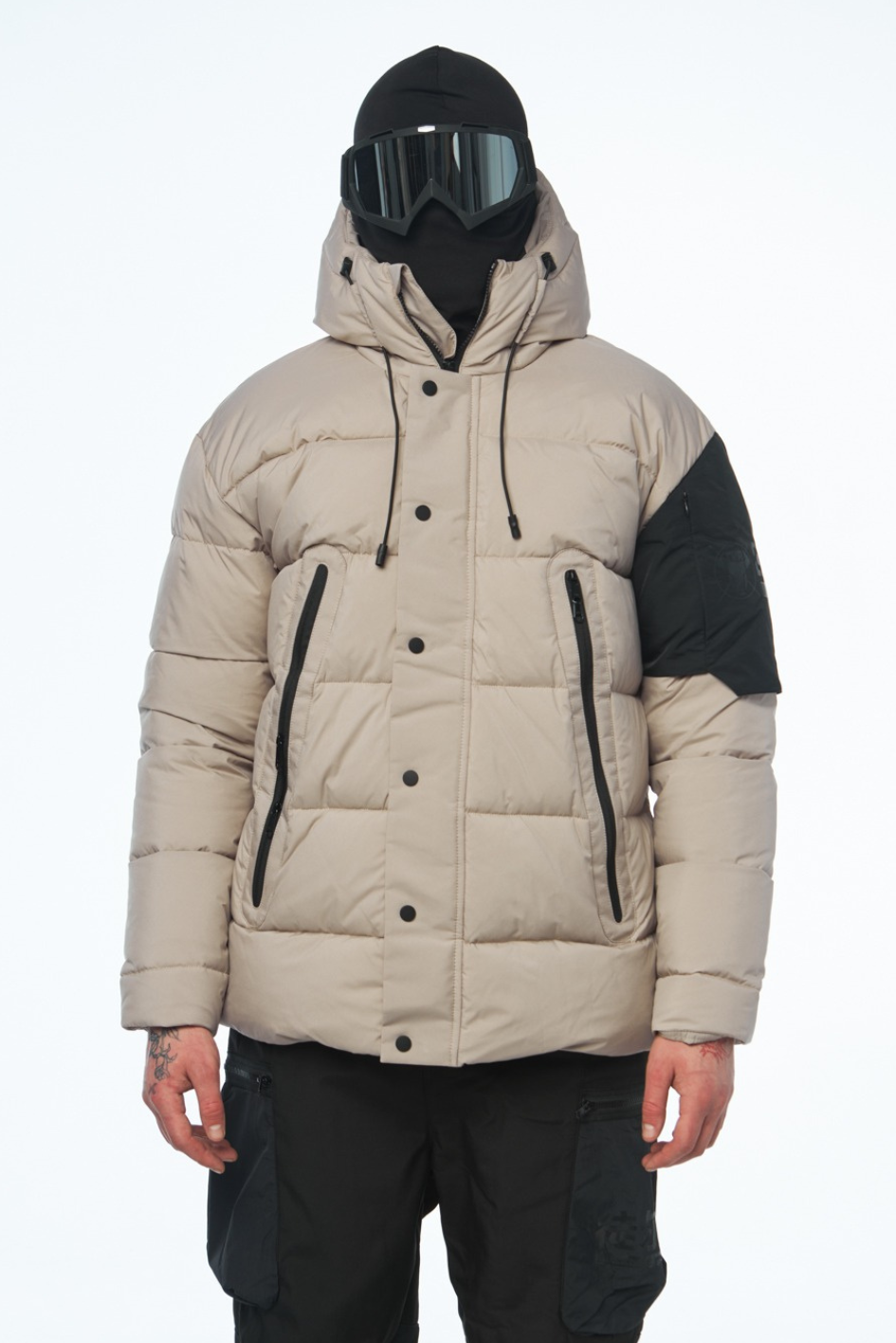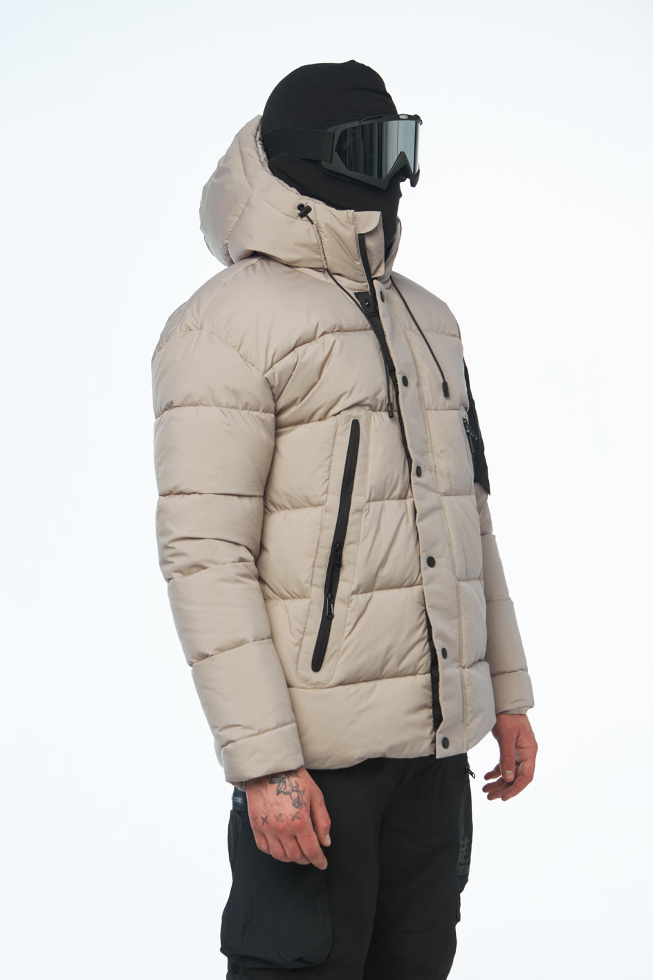 Wasserabweisender Artic-Stoff, Füllung aus Synthetikdaunen, Mikrofleece in den Taschen, YKK-Reißverschlüsse, Futter aus Polyester.