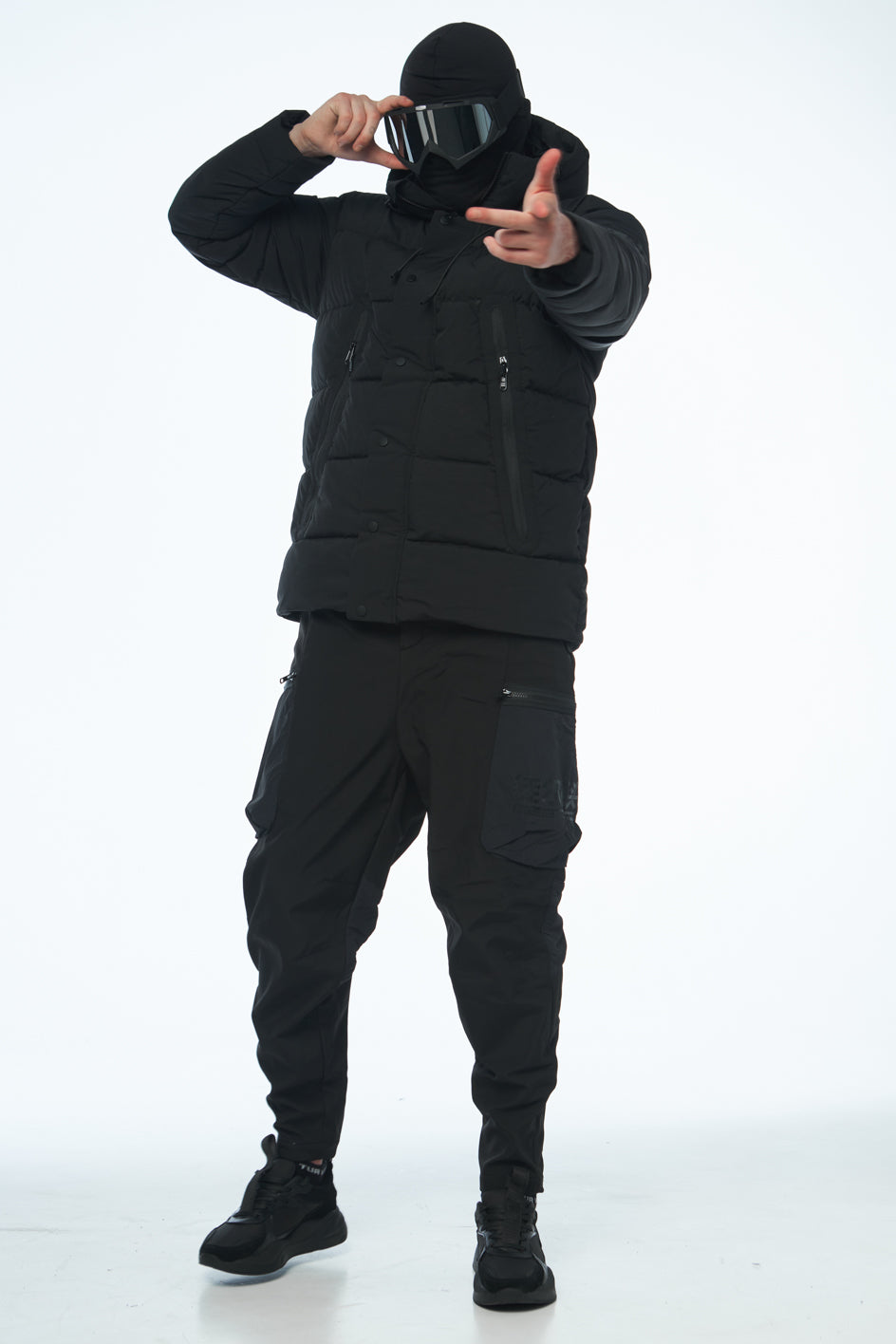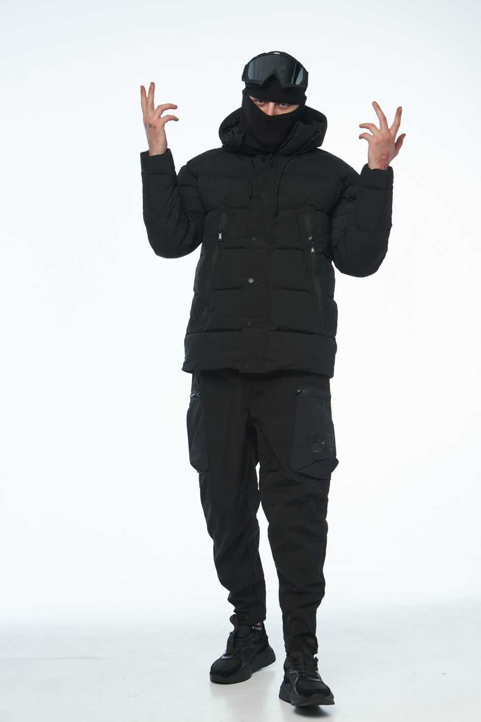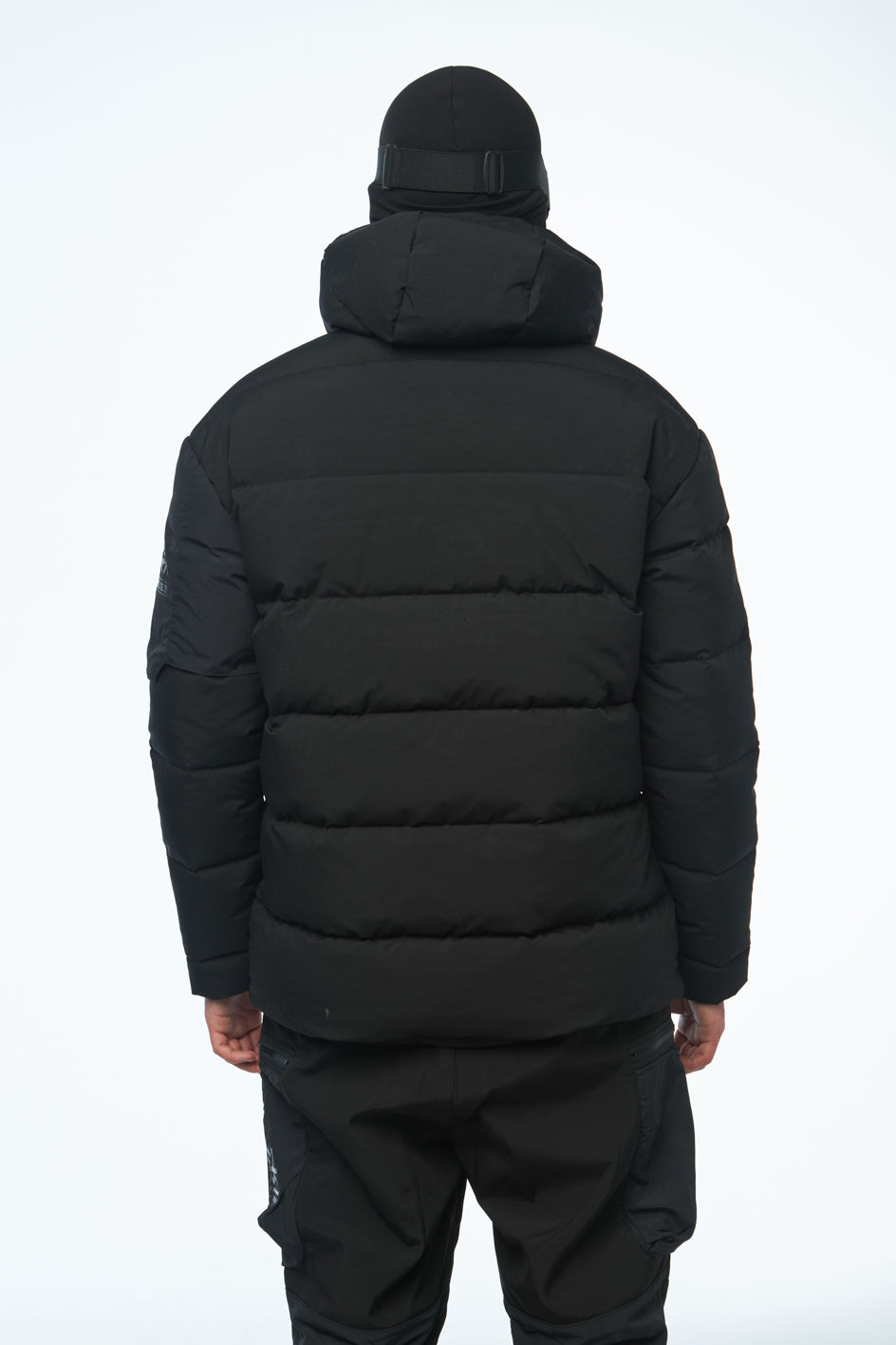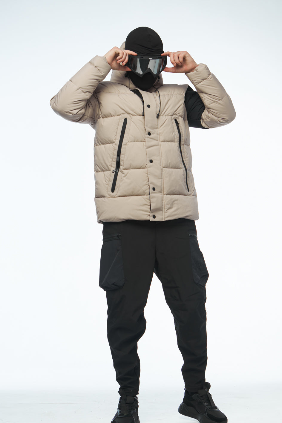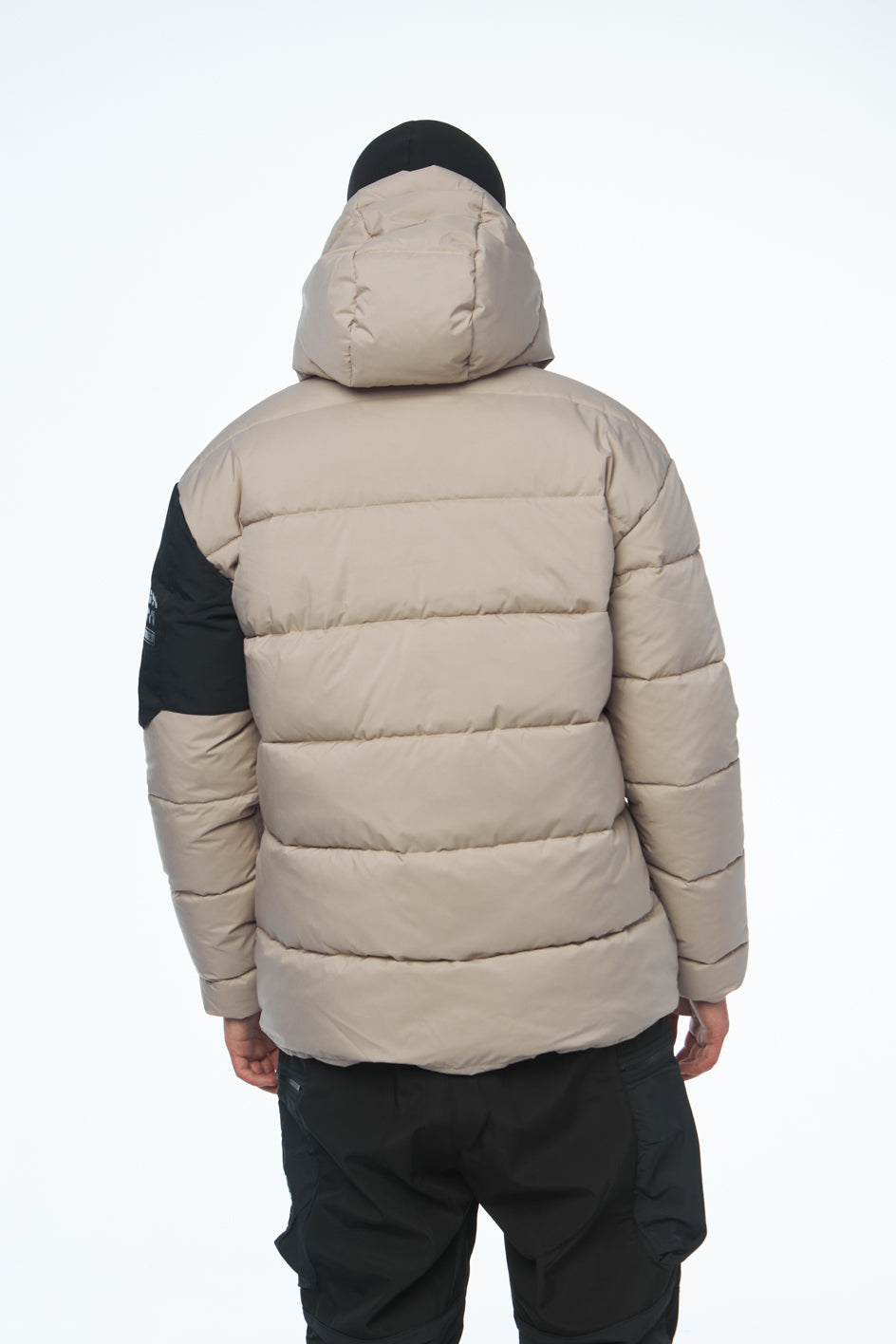 Daunenjacke mittlerer Länge, ausgestattet mit hohem Kragen und Kapuze. Auf der Vorderseite eine Blende mit verdecktem Reißverschluss und Knöpfen. Die Jacke verfügt über Eingrifftaschen vorne sowie eine Tasche am linken Ärmel mit schwarzem Markenaufdruck. Der Saum ist mit einem elastischen Kordelzug mit Stoppern versehen. Die Jacke ist für Temperaturen bis -20 Grad geeignet.