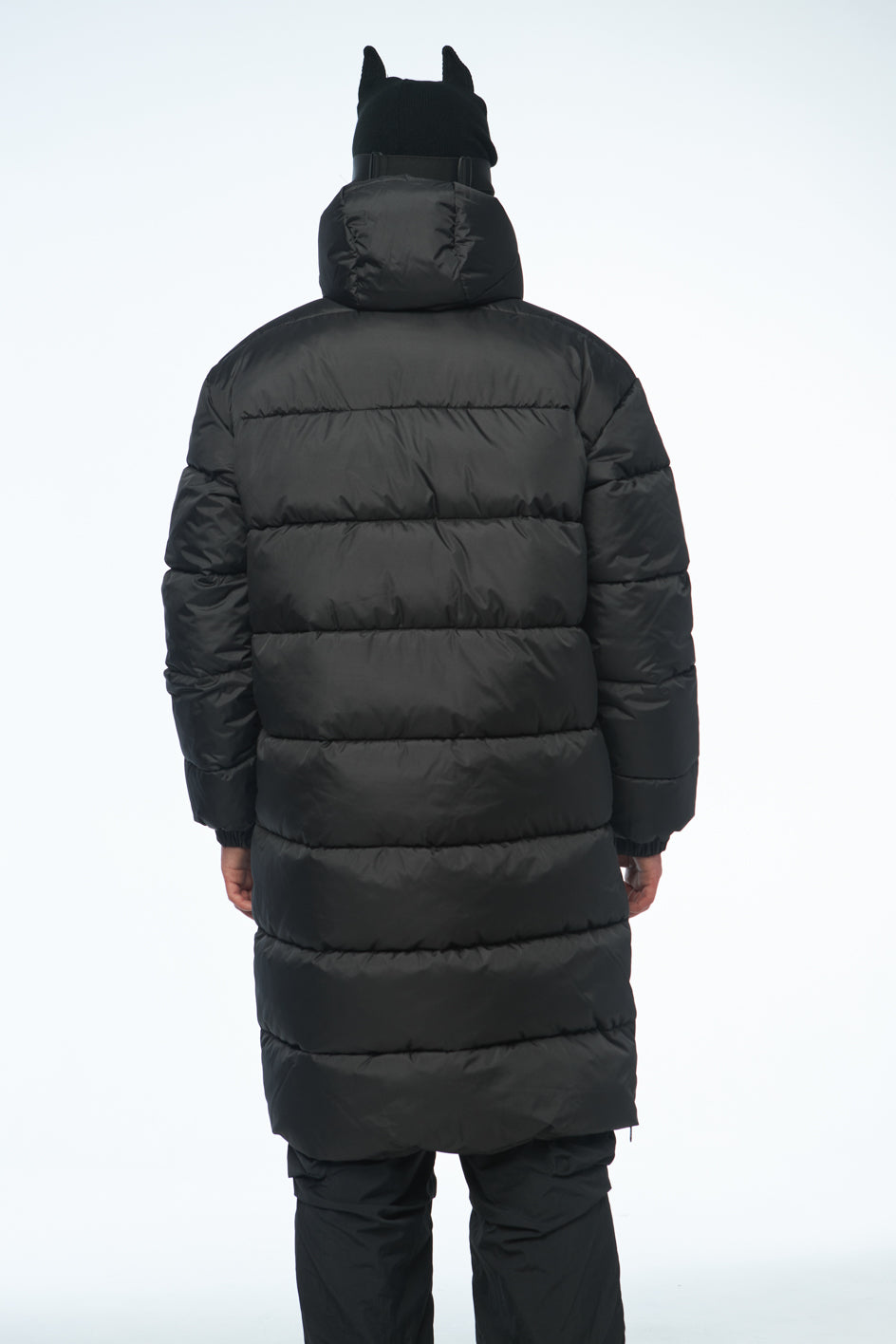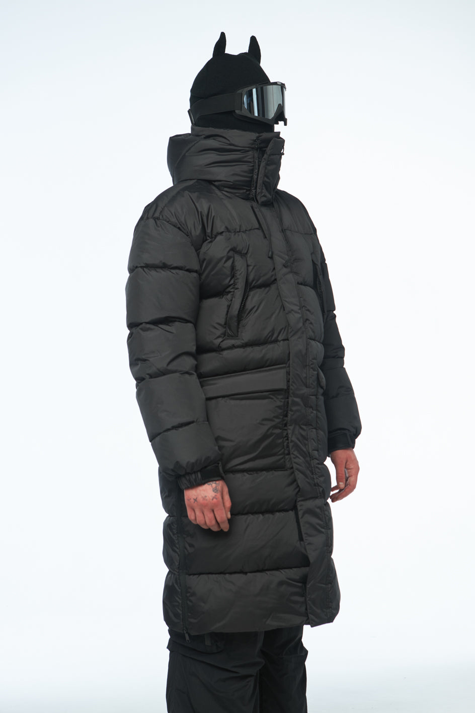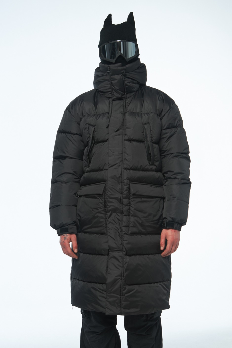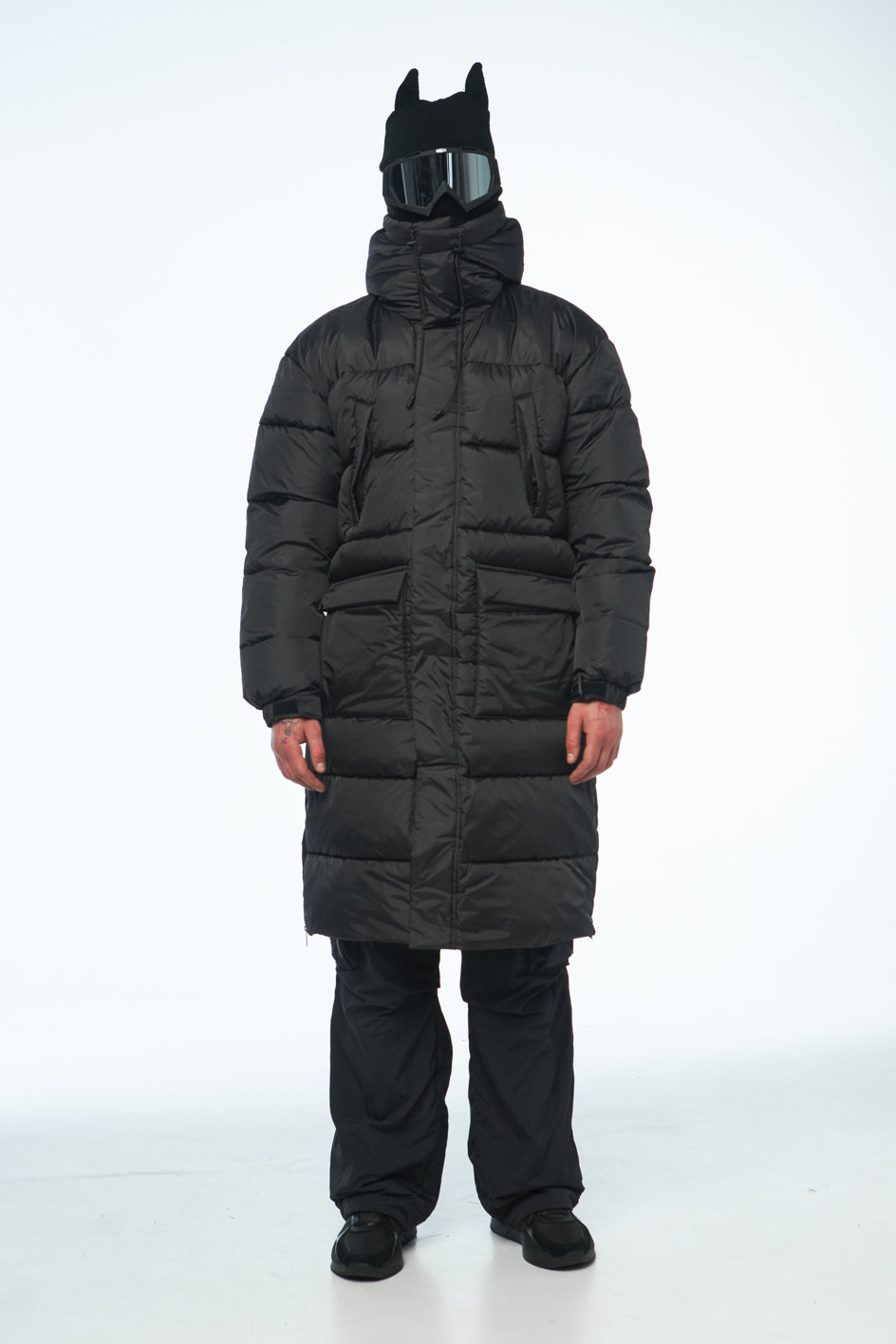 Langer Daunenmantel mit großer, tiefer Kapuze, die den Hals effektiv vor Wind schützt. Der Mantel verfügt über vier Außentaschen: zwei Brusttaschen mit Reißverschluss sowie zwei doppelte aufgesetzte Pattentaschen mit zwei Eingriffen – der erste von oben unter der Patte, der zweite seitlich mit Reißverschluss. Die Ärmelabschlüsse sind mit Gummibündchen und Klettverschlüssen versehen. Im Inneren des Mantels befindet sich eine zusätzliche Reißverschlusstasche. An den Seiten sind Reißverschlüsse angebracht, die den Zugriff auf Hosentaschen erleichtern. Der Mantel ist für das Tragen bei winterlichen Bedingungen und niedrigen Temperaturen bis -25 Grad geeignet.