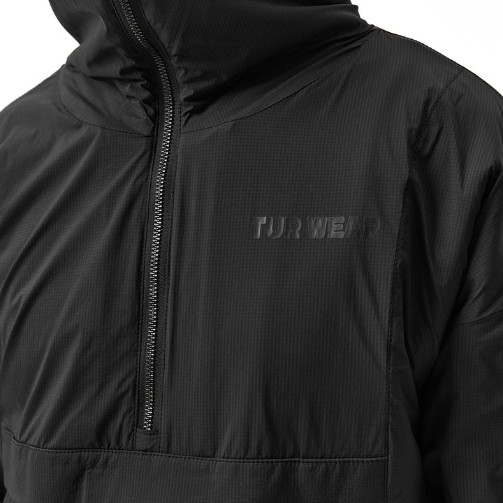 This anorak features a deep hood with adjustable toggles on both horizontal and vertical axes for a snug fit. A front zip chest pocket adds utility, while small patch pockets on each sleeve provide quick access. Ventilation slits on the back enhance airflow. Side drawcords allow silhouette adjustment, and the hem and sleeves are finished with ribbed knit cuffs. Finished with a black “Tur wear” signature print.