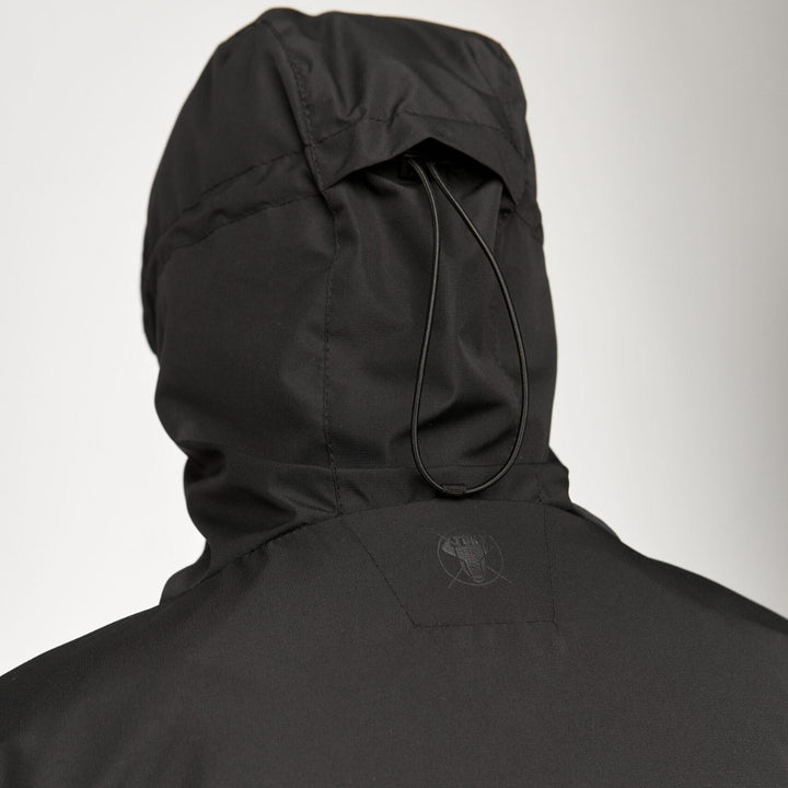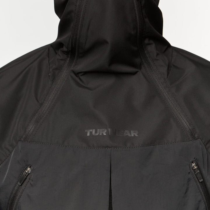 Anorak with a longer cut and a high collar, featuring two zippers for convenience. The deep hood is adjustable horizontally. On the chest, there are two patch pockets made of crinkle fabric with zippers. At the lower part, there are two hidden zipper pockets under a flap. The bottom hem has an adjustable drawstring with fasteners to control the width. The sleeves feature shaped reliefs, crinkle fabric inserts, and adjustable Velcro cuffs. The jacket is made from ripstop with a PU membrane and lacquered fabric lining for wind protection and comfort in transitional seasons.