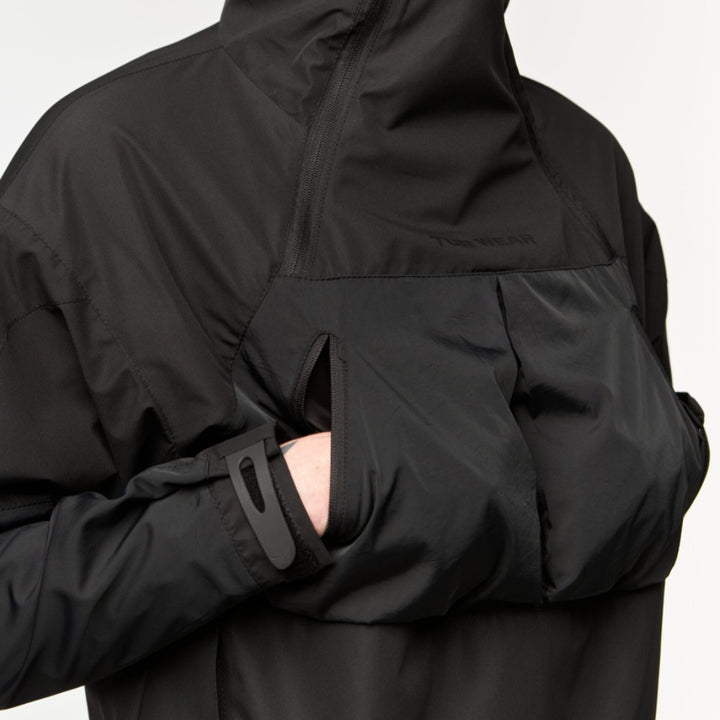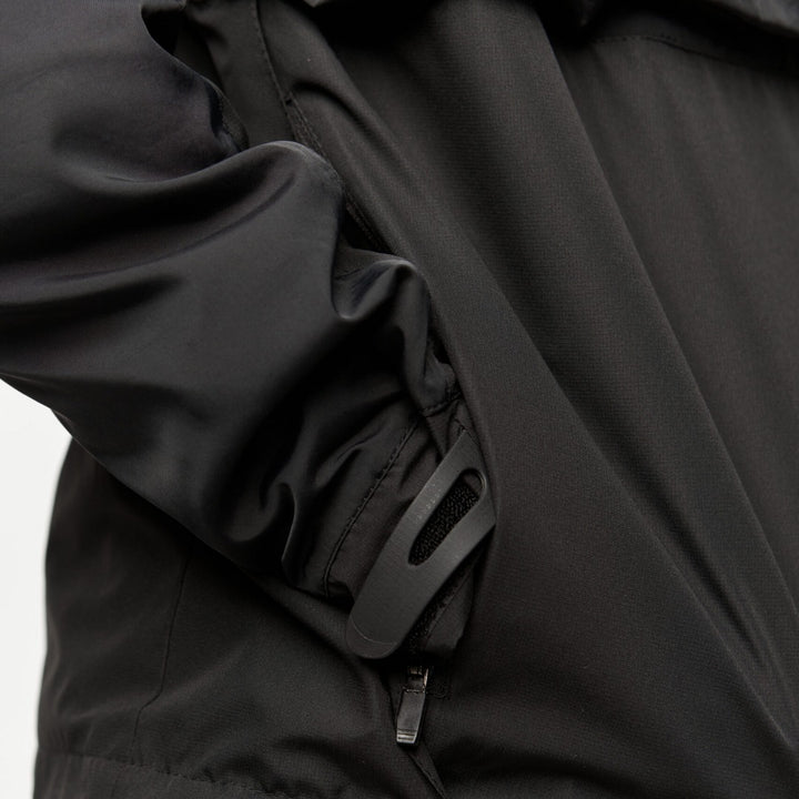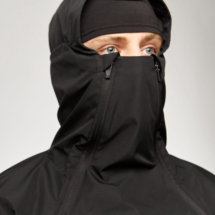 The outer layer is made of 6.6 Micro-rip nylon ripstop, reinforced with a PU 5/5K membrane. The material is ultralight, waterproof (5000 mm), breathable (5000 mm), and windproof. Crinkle fabric inserts strengthen high-wear areas and add textured relief. The inner lining is made of lacquered fabric: smooth, technical material that doesn’t retain moisture and reduces friction. The surface is dense and non-elastic, providing reliable protection in challenging conditions. Hardware includes YKK zippers, known for their durability and resistance to repeated use.