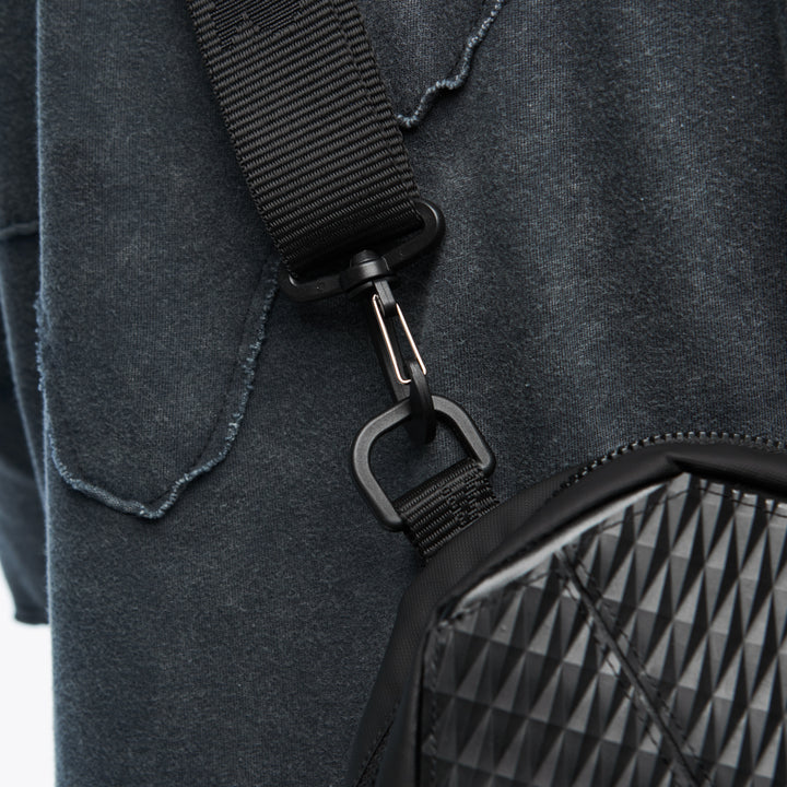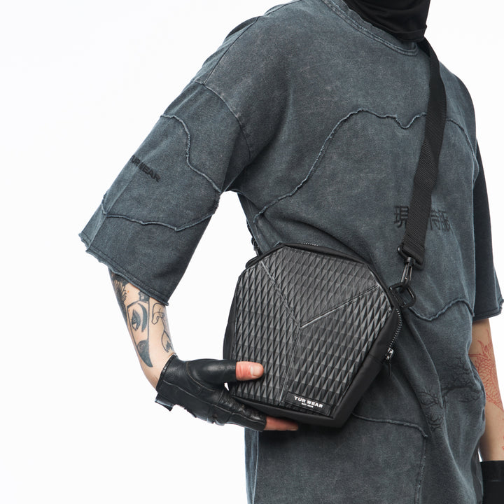 A textile shoulder bag combined with various materials. It has two internal pockets, a handle, and a detachable adjustable shoulder strap. The main compartment fastens with a zipper.