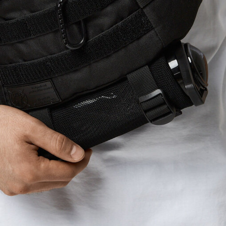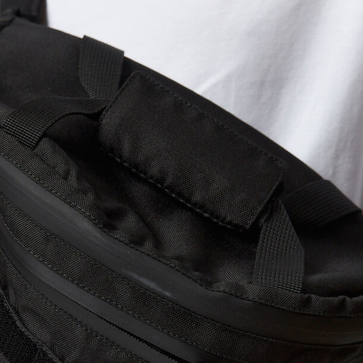 A larger bum bag that can be worn both over the shoulder and on the waist. It has five pockets, a Molle system on the front, and a carabiner for carrying various items. The top handle is reinforced with soft fabric, and there is a mesh cover at the bottom for carrying a bottle.
