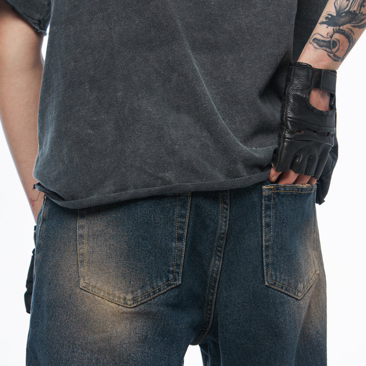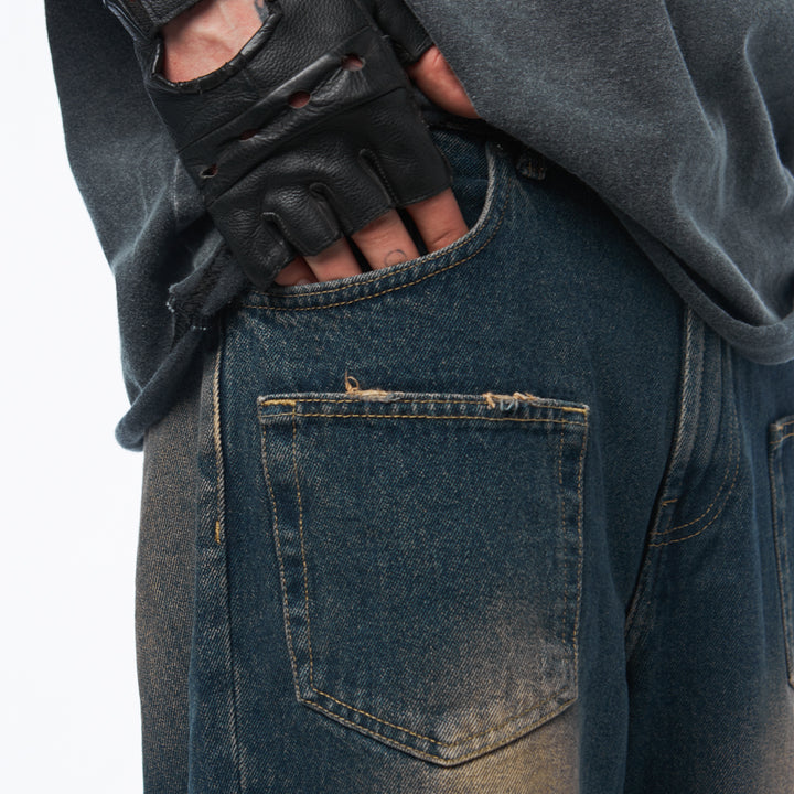 Fastened with a front zipper and button. The loose fit offers comfort, while the aged effect gives off a "gritty" street style. Perfect for fans of grunge, rebellion, and authentic denim.