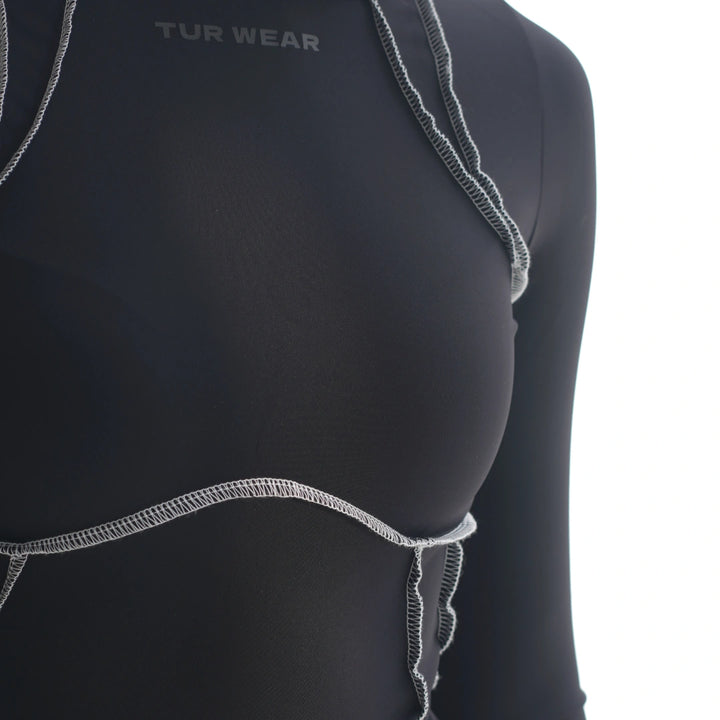 Long-sleeve body made from high-quality nylon that feels like a second skin – perfectly fitting and highlighting the figure. An excellent choice for cooler seasons: autumn, winter, and spring. External seams on the front and back visually accentuate the silhouette, stitched with contrasting white thread. Pairs perfectly with the “Orvia” hoodie and “Void” cargo pants – a set for a true urban samurai.
