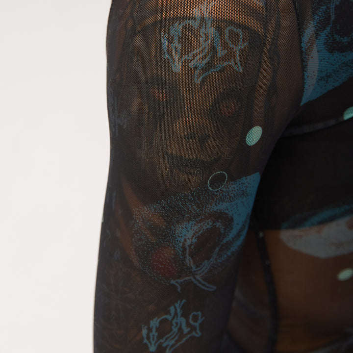 Semi-sheer bodysuit with an original custom print. Fastens with snaps at the bottom for convenience. Perfect when styled with the "Medium" top for a layered, expressive look.