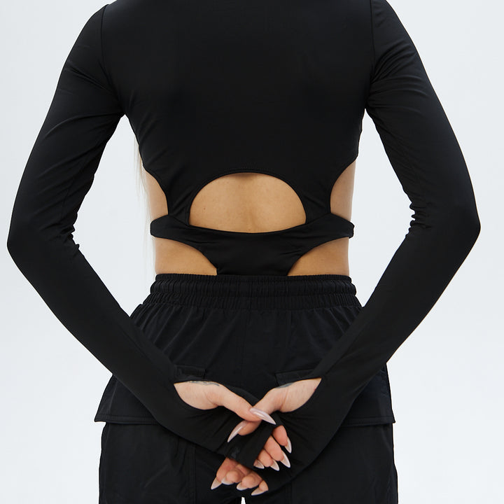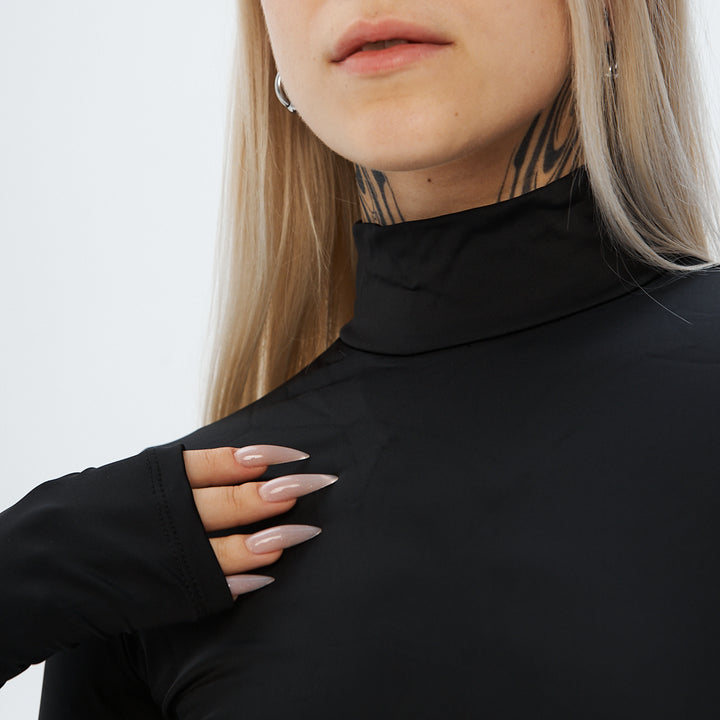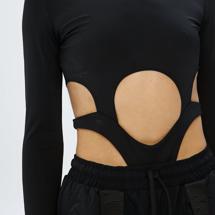A bodysuit with shaped cutouts, made from elastic biflex fabric with a high collar. The sleeves are elongated, with a finger hole at the seam for convenience. It fastens with snap buttons at the bottom for a comfortable fit.
