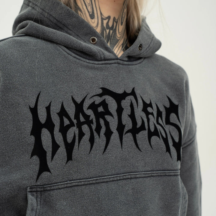 Oversized hoodie made of dense cotton, treated with industrial washing technology to achieve a faded color effect. Features double cuffs on the sleeves and a belt with a metal buckle at the hem. Decorated with metal eyelets and flock prints with the word "Heartless."